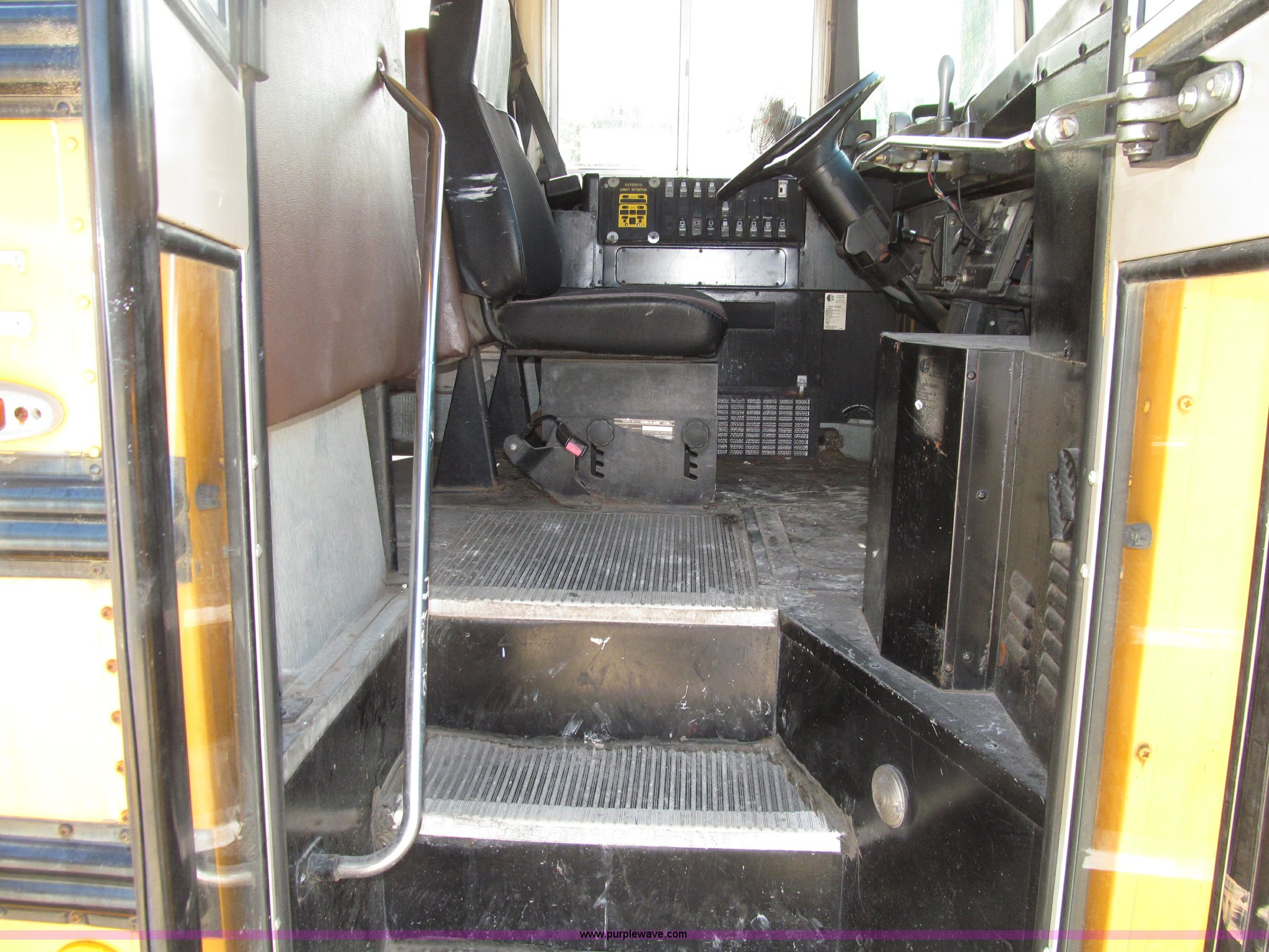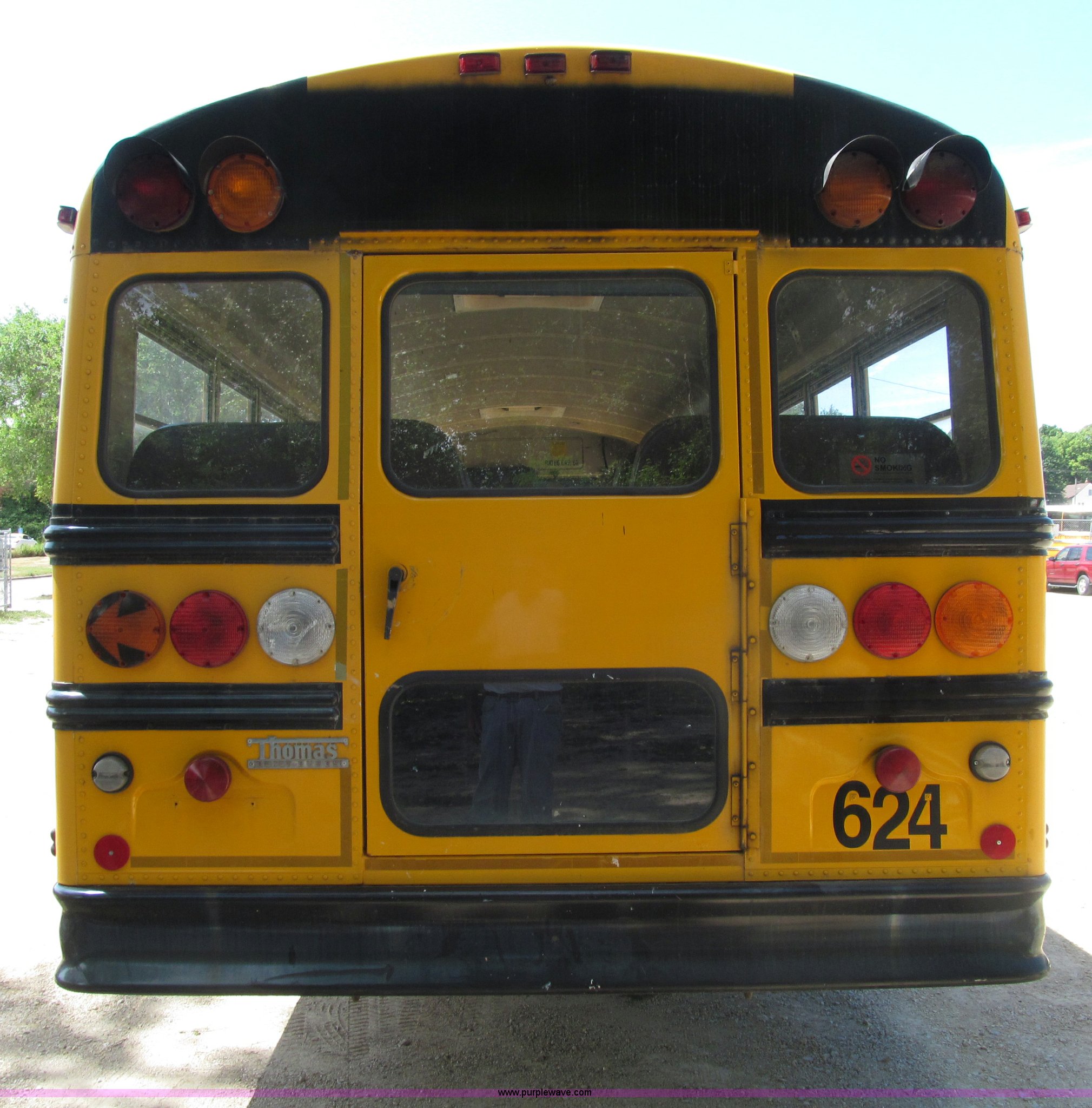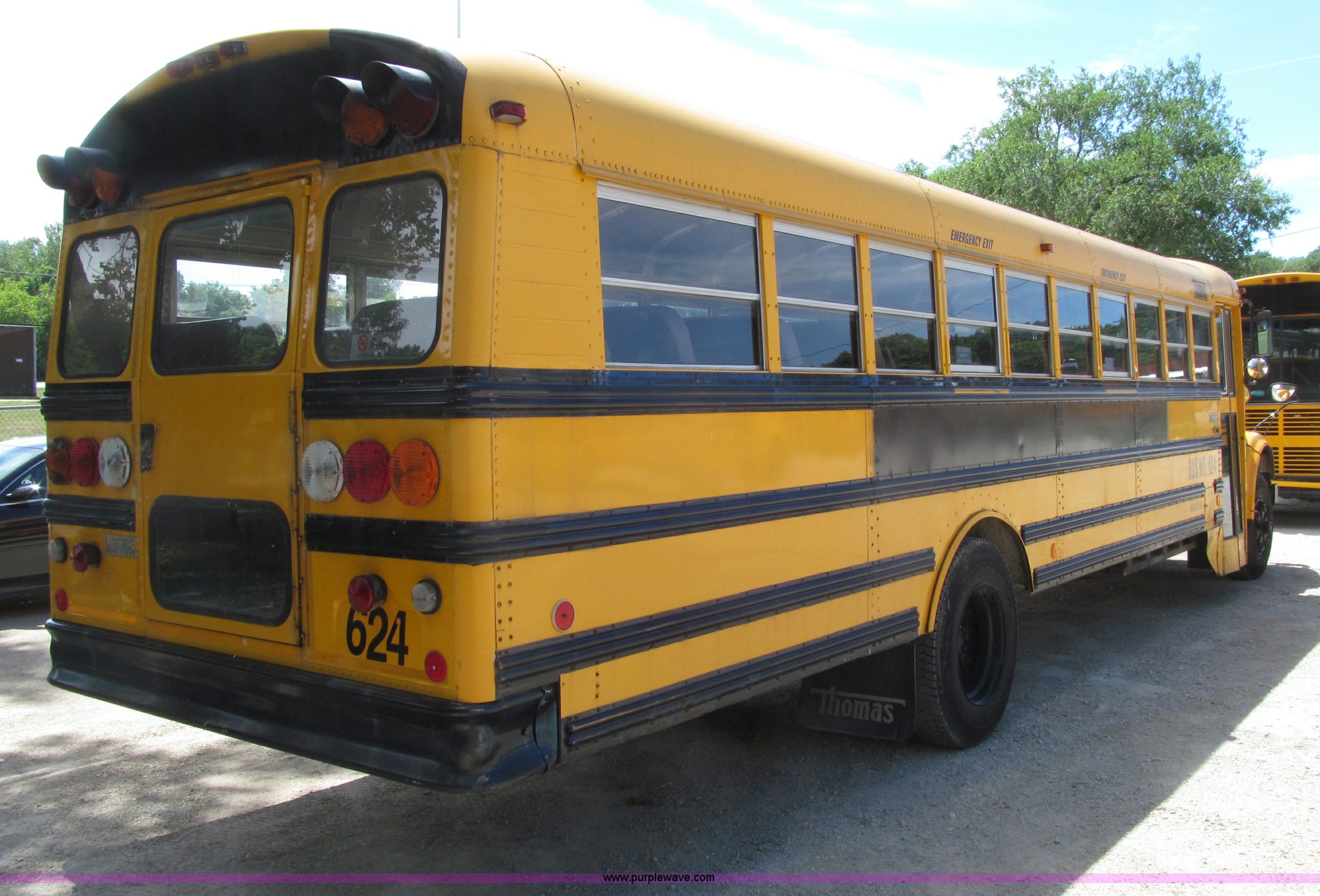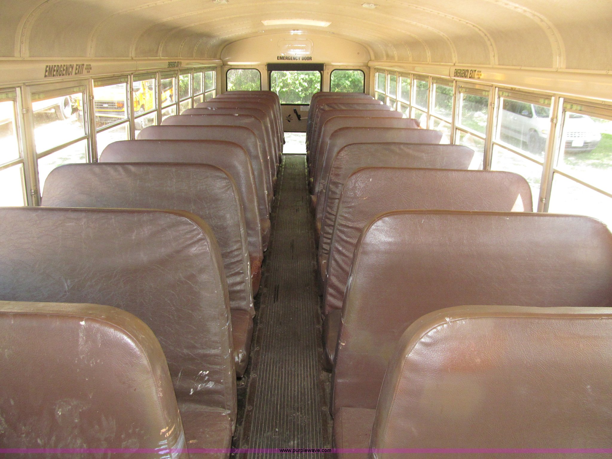 Purple Wave is selling a used Bus in Iowa. This item is a 1998 International 3800 Thomas school bus with the following: 195,670 acutal miles, 14,145 hours on meter, International T444 7.3L V8 diesel engine, 210 HP, Automatic transmission, Heat, Tilt, Cruise, Manual windows, Cush-N-Aire driver's seat, Vinyl interior, (7) emergency egress, 66 passenger capacity, Spring suspension, Air brakes, 10R22.5 tires, GVWR 27,500 lbs, FAWR 10,000 lbs, RAWR 17,500 lbs, Numerous paint stains on seats, Unit# 624