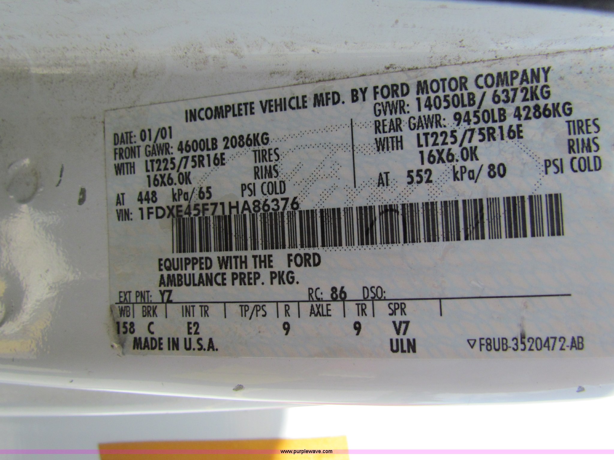 Take a look at this used 2001 Ford ambulance being sold on November 5th, 2013 in the SOLD! November 5 Government Auction made by Ford. Take a look at all of the item information below or take a look at similar auctions for Trucks.