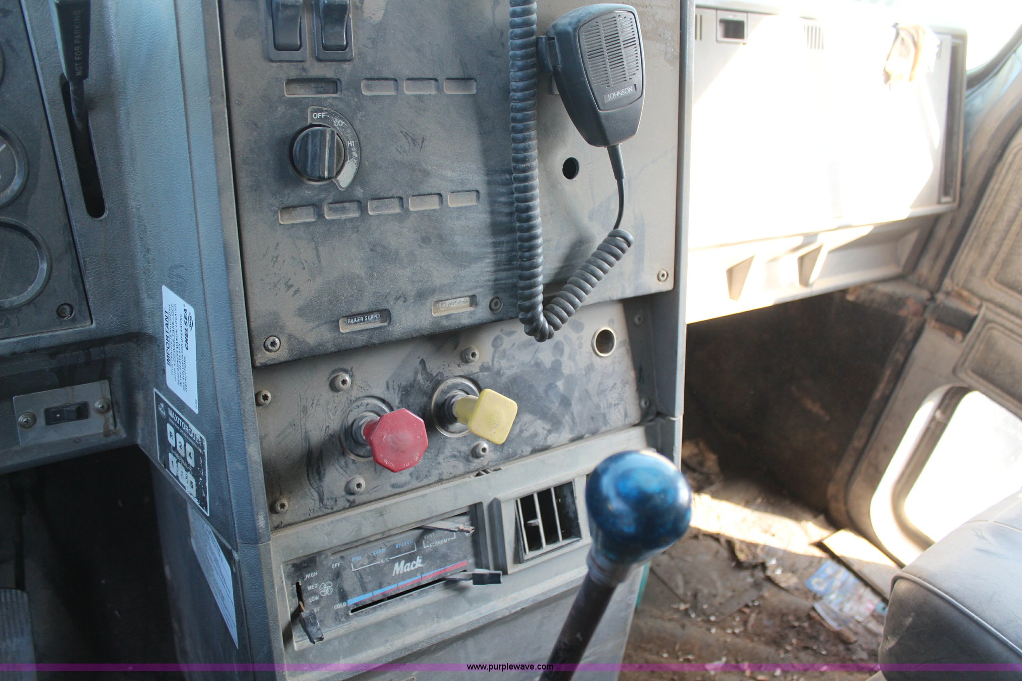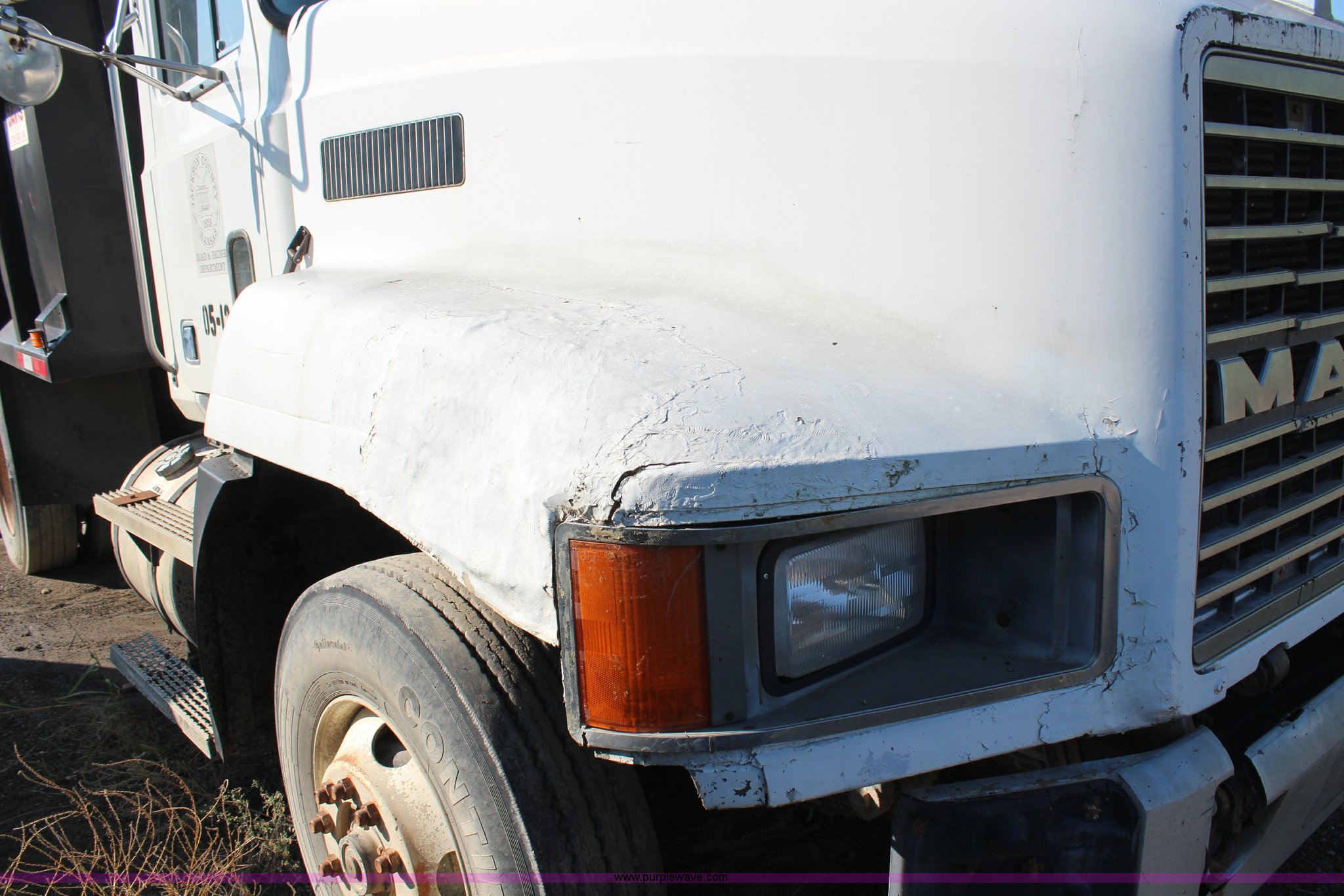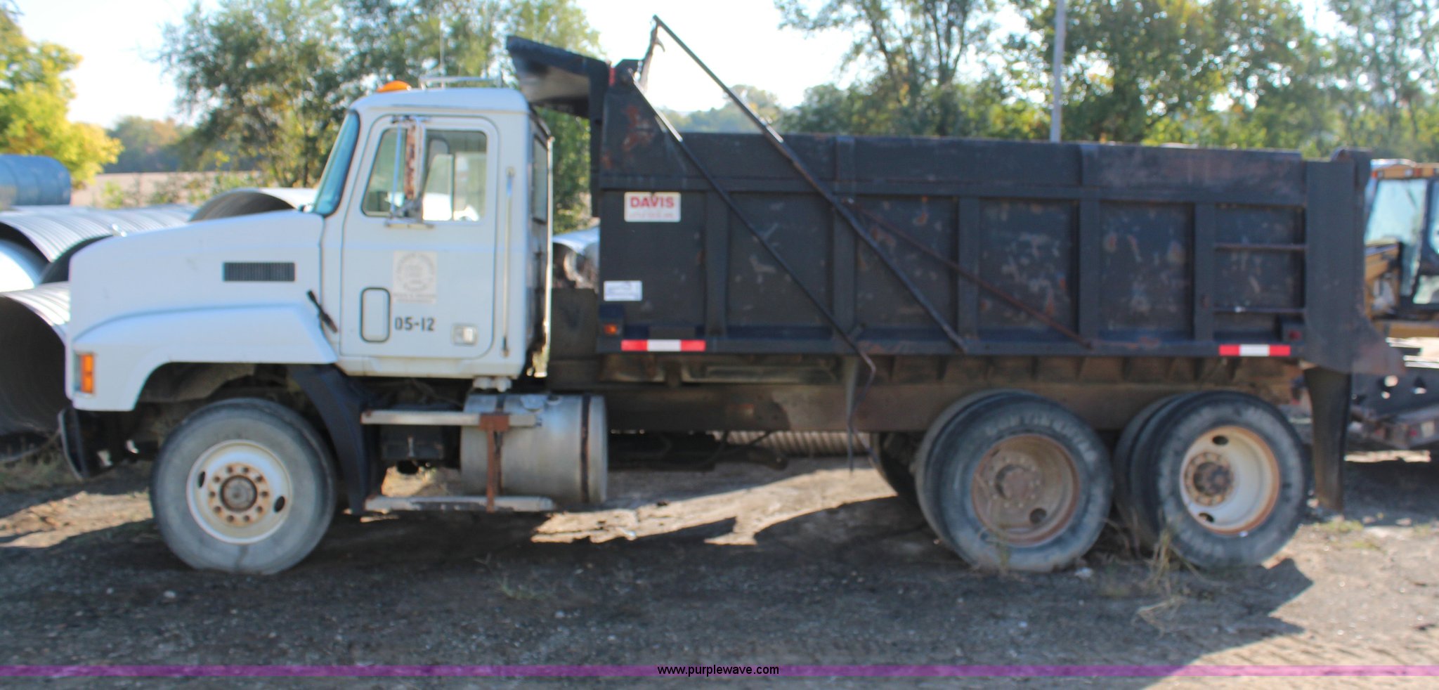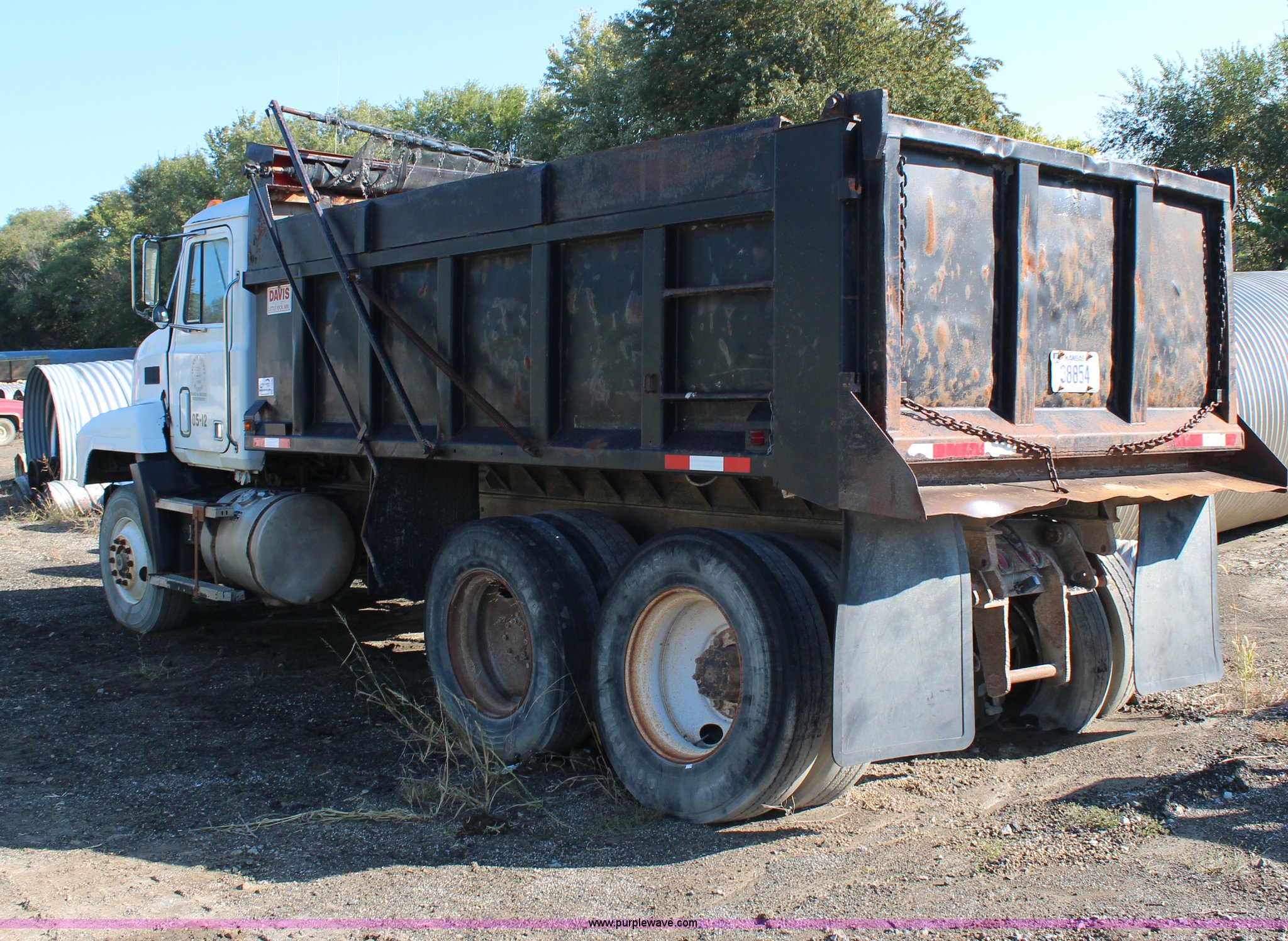 Purple Wave is selling a used Construction Dump Truck in Kansas. This item is a 1991 Mack CH613 dump truck with the following: 111,673 miles on odometer, Mack EM7 12.0L L6 diesel engine, 300 HP, Maxitorque five speed manual transmission, AC and heat, Air suspension seat, Davis 15'L dump bed, Air operated end gate, Single ram hoist, Tarp, PTO, Dual 68 gallon fuel tanks, Spring suspension, Air brakes, Driver's axle, 11R22.5 tires, Interior/exterior cosmetic damage, Rear axle housing broken