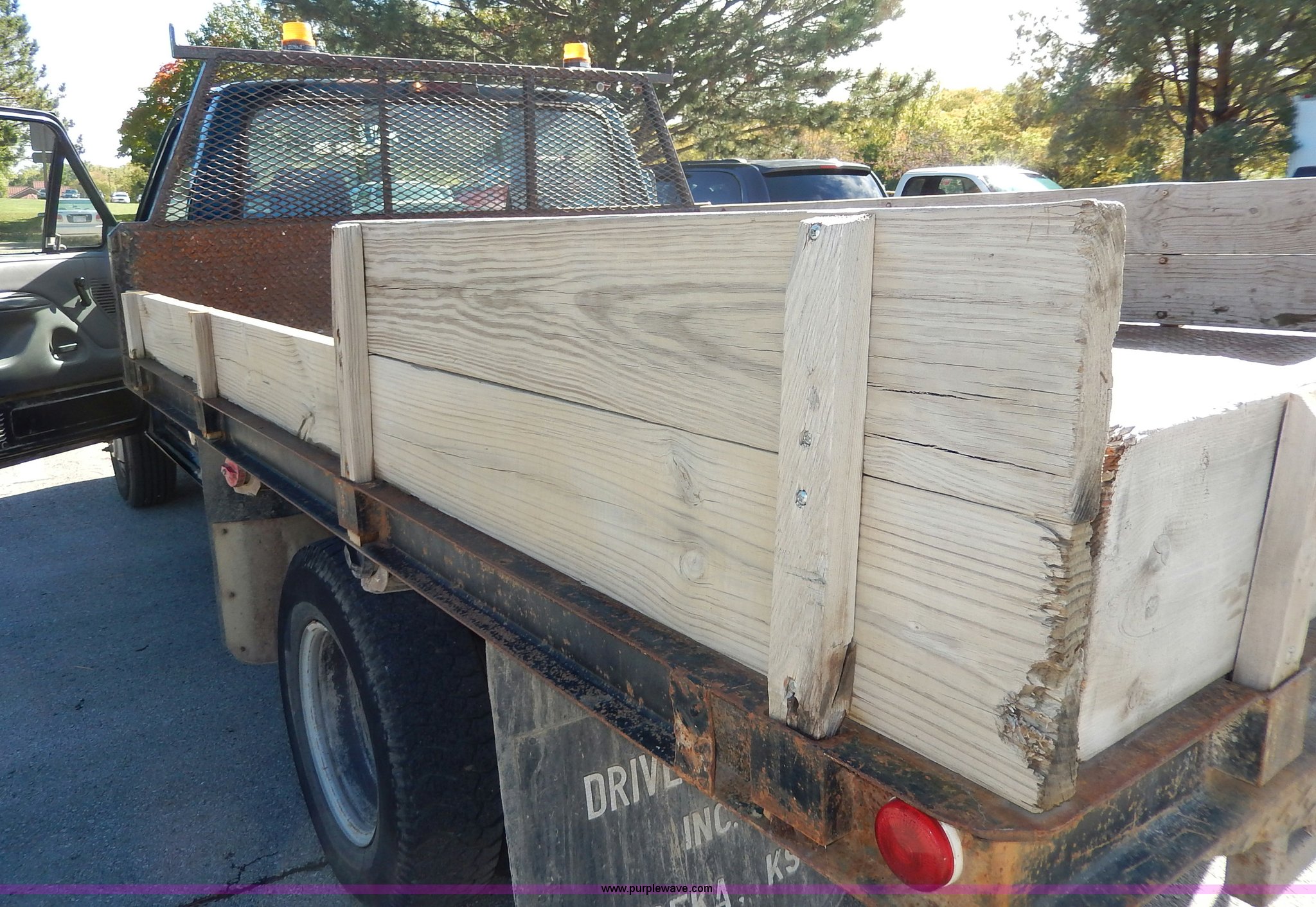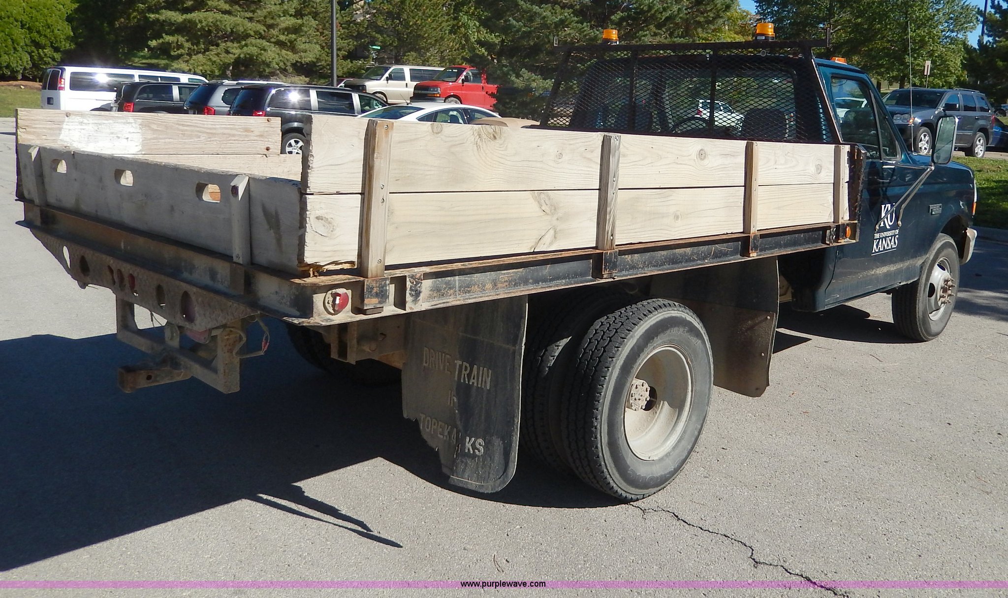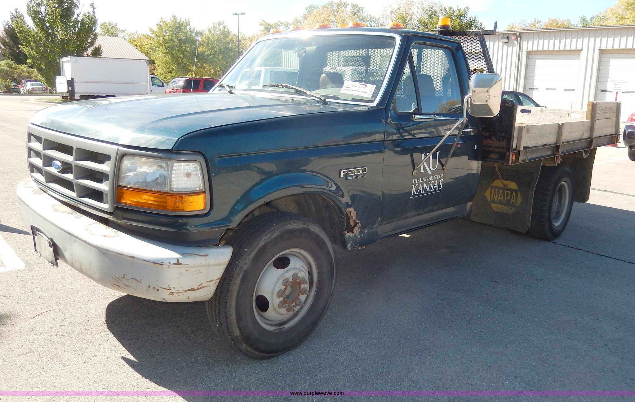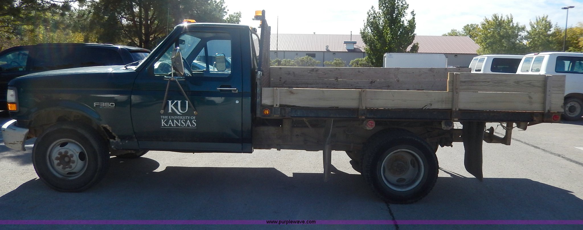 Purple Wave is selling a used Passenger Vehicle in Kansas. This item is a 1997 Ford F350 XL flatbed truck with the following: 114,770 miles on odometer, 5.8L V8 OHV 16V gas engine, Automatic transmission, Heat, AM/FM, Manual windows and locks, Vinyl interior, 10' x 89" flatbed, Headache rack, Strobe light, Steel construction, Stake pockets, Wood side boards, Dual fuel tanks, Receiver hitch, Trailer wiring, 215/85R16 tires, Interior/exterior cosmetic damage, Rust, Dents and scratches, Dash cracked, Headliner damaged