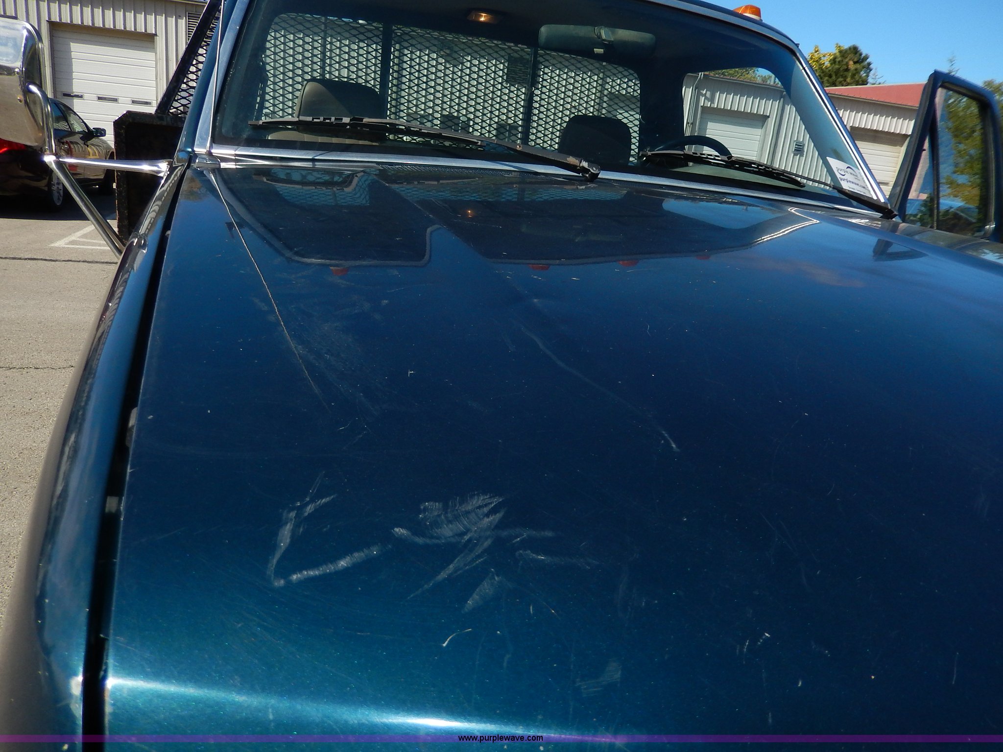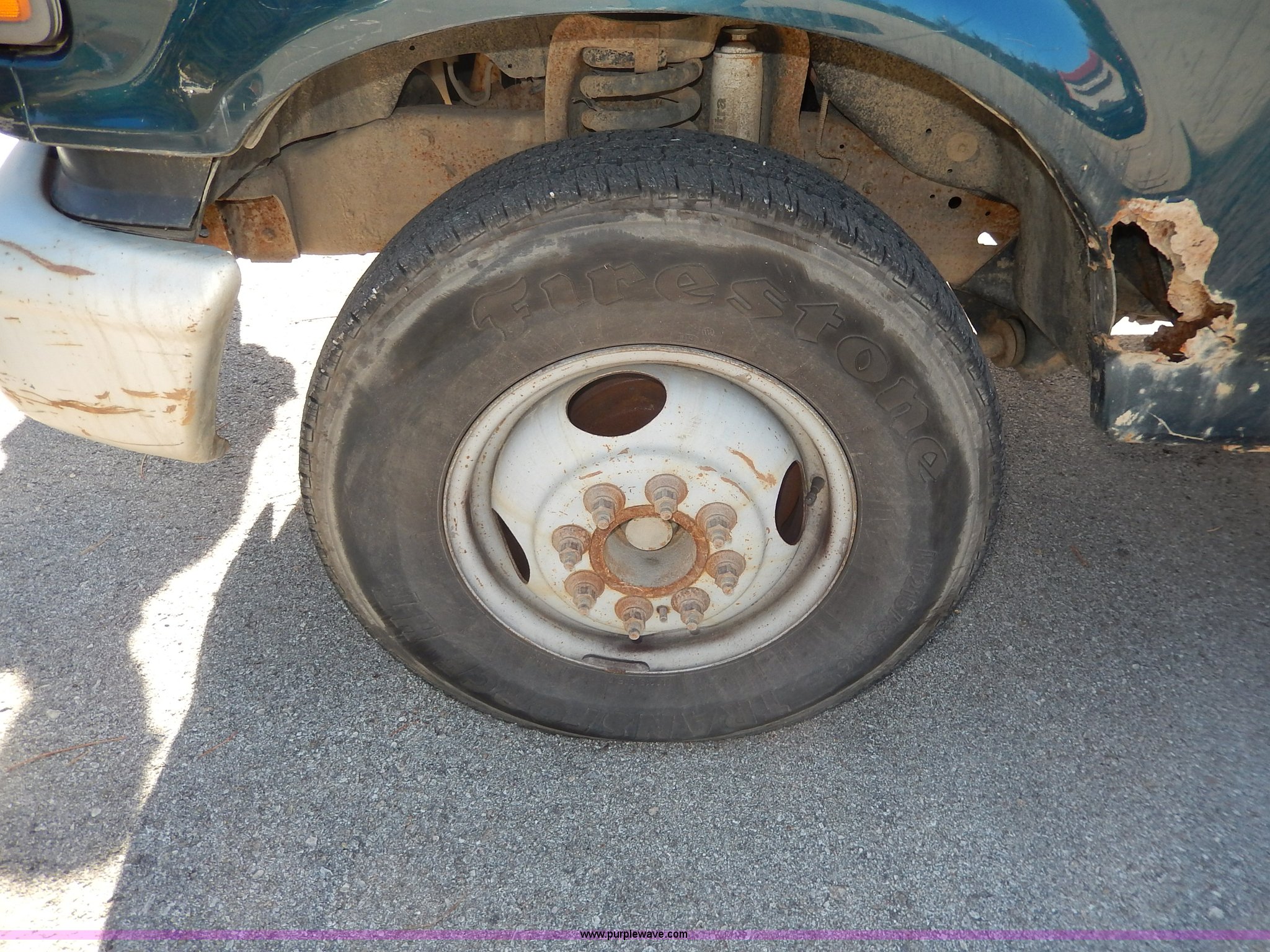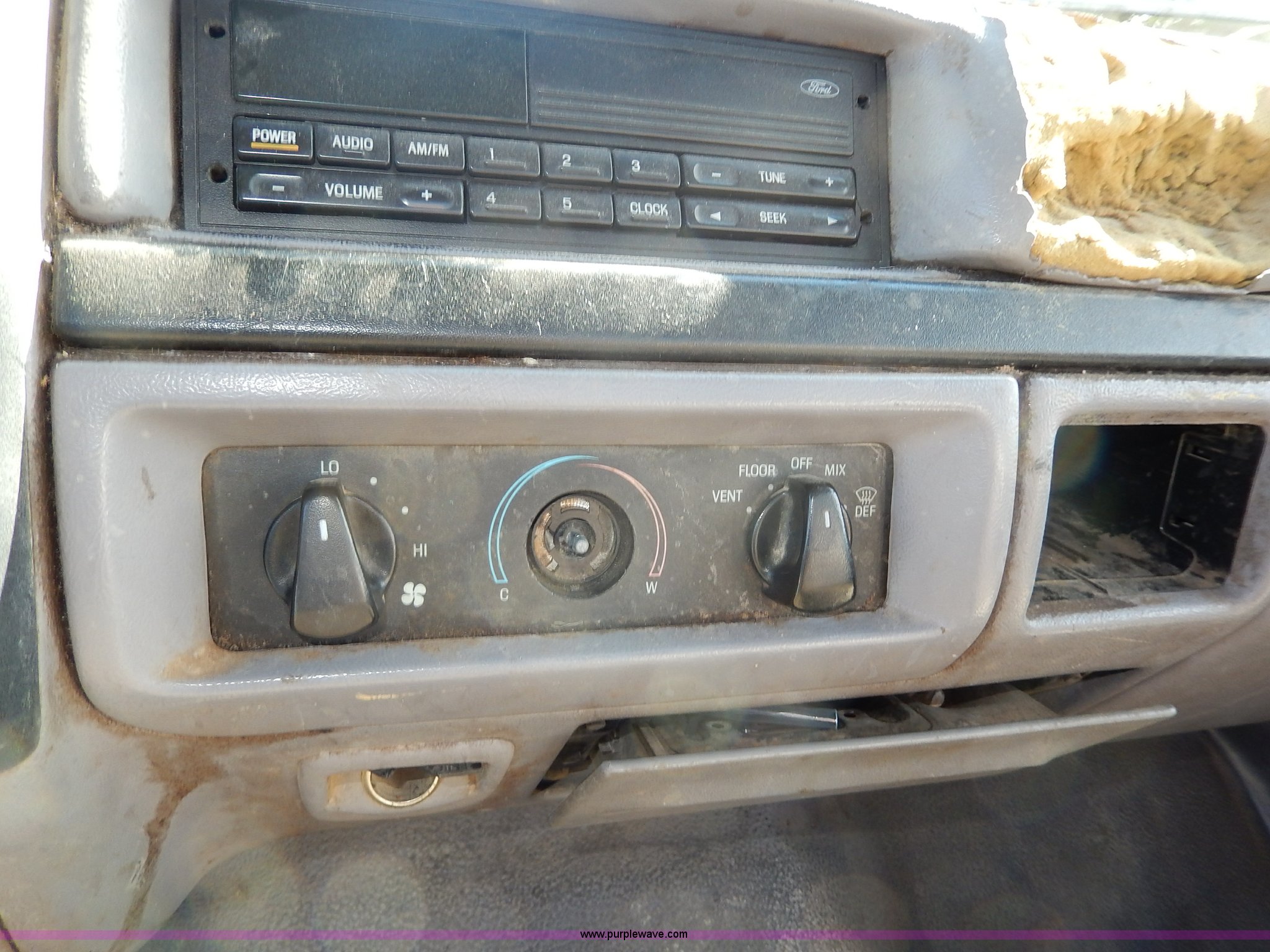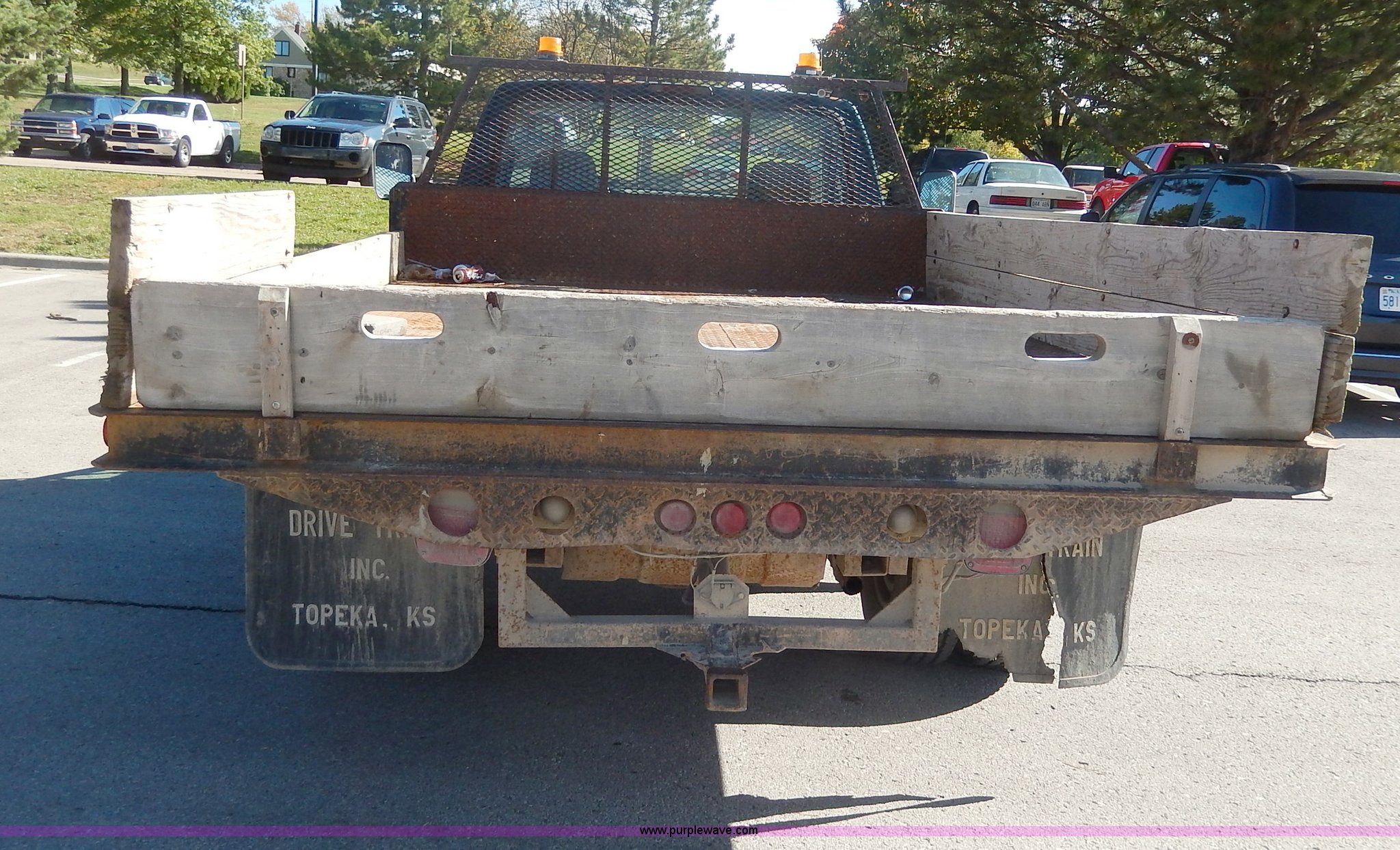 Purple Wave is selling a used Passenger Vehicle in Kansas. This item is a 1997 Ford F350 XL flatbed truck with the following: 114,770 miles on odometer, 5.8L V8 OHV 16V gas engine, Automatic transmission, Heat, AM/FM, Manual windows and locks, Vinyl interior, 10' x 89" flatbed, Headache rack, Strobe light, Steel construction, Stake pockets, Wood side boards, Dual fuel tanks, Receiver hitch, Trailer wiring, 215/85R16 tires, Interior/exterior cosmetic damage, Rust, Dents and scratches, Dash cracked, Headliner damaged
