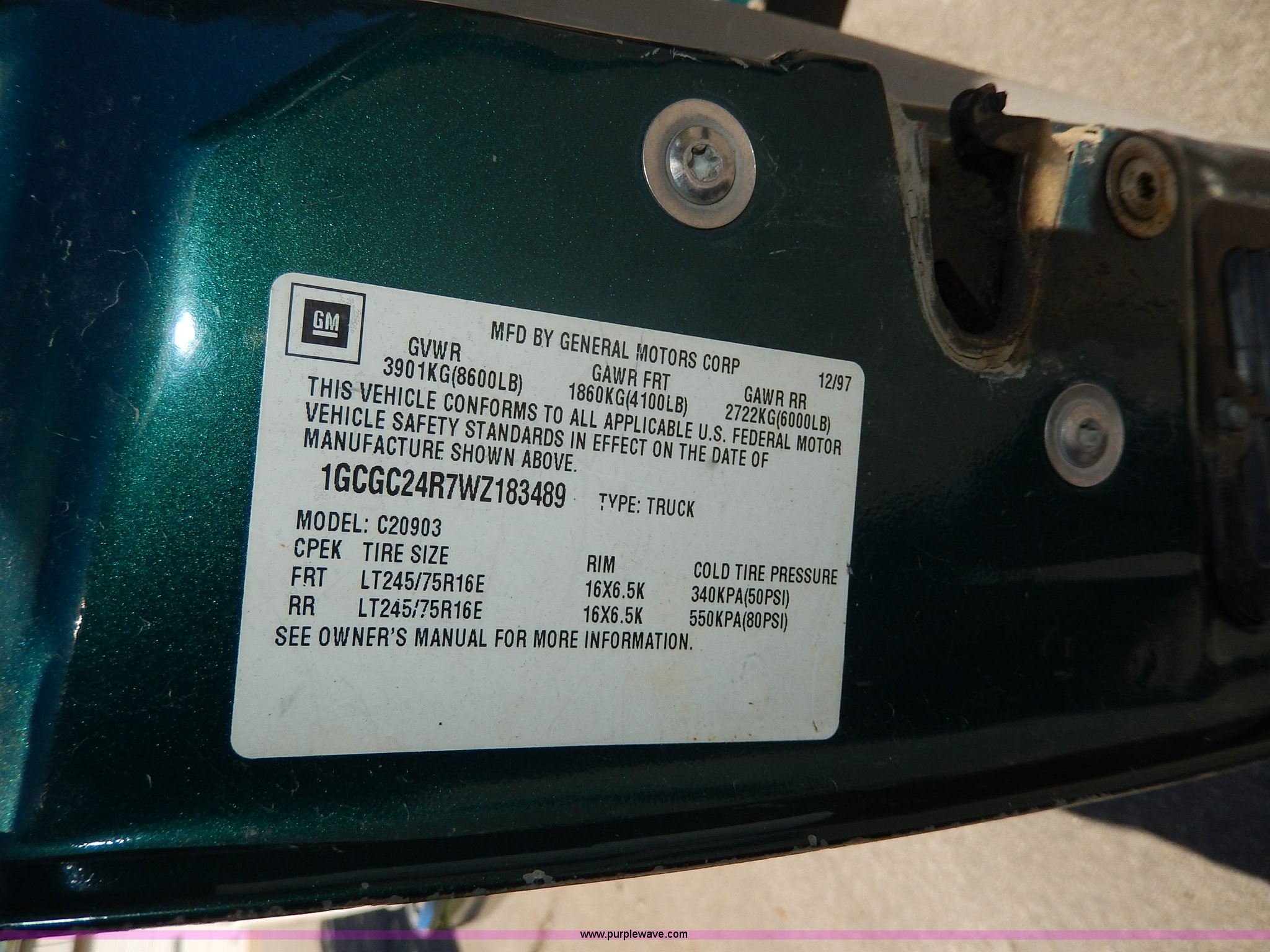 Purple Wave is selling a used Passenger Vehicle in Kansas. This item is a 1998 Chevrolet Cheyenne 2500 flatbed truck with the following: 123,277 miles on odometer, 5.7L V8 OHV 16V gas engine, Automatic transmission, AC and heat, AM/FM, Manual windows and locks, Vinyl interior, 8' x 74" flatbed, (2) storage boxes, Steel construction, Ladder rack, Tommy Gate 7213 end gate, Serial M-53738, Headache rack, 245/75R16 tires, Battery dead, Paint peeling on bed
