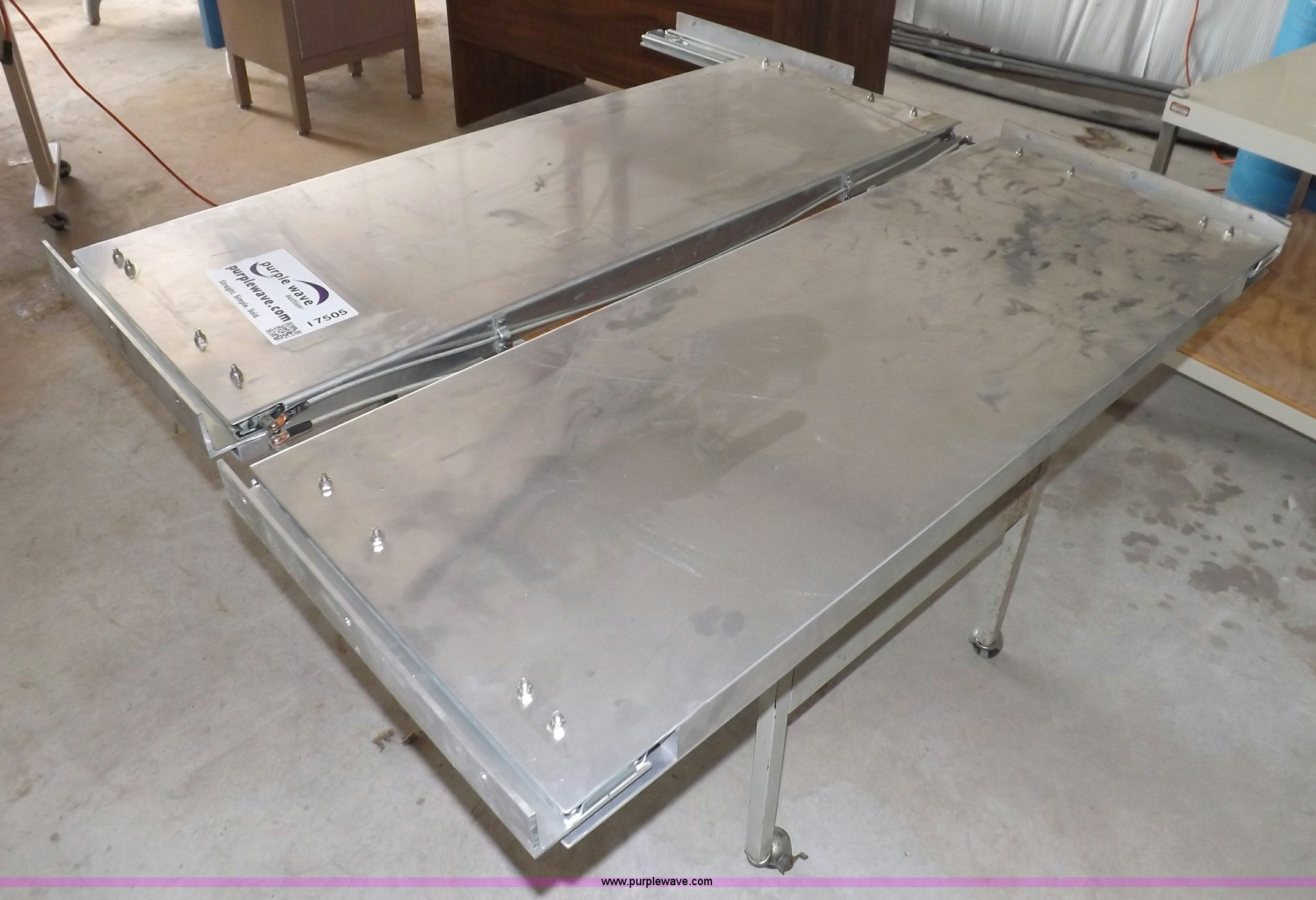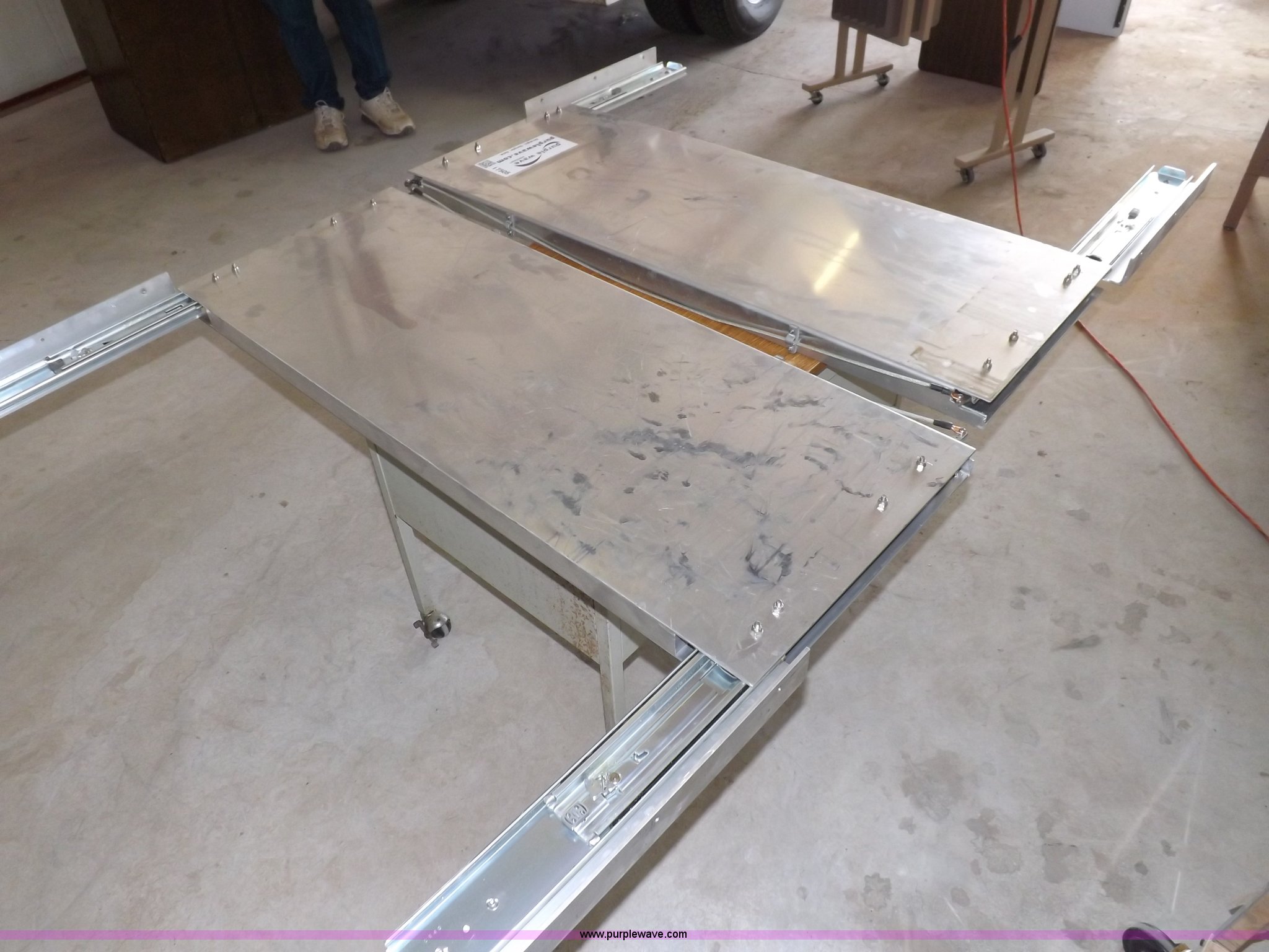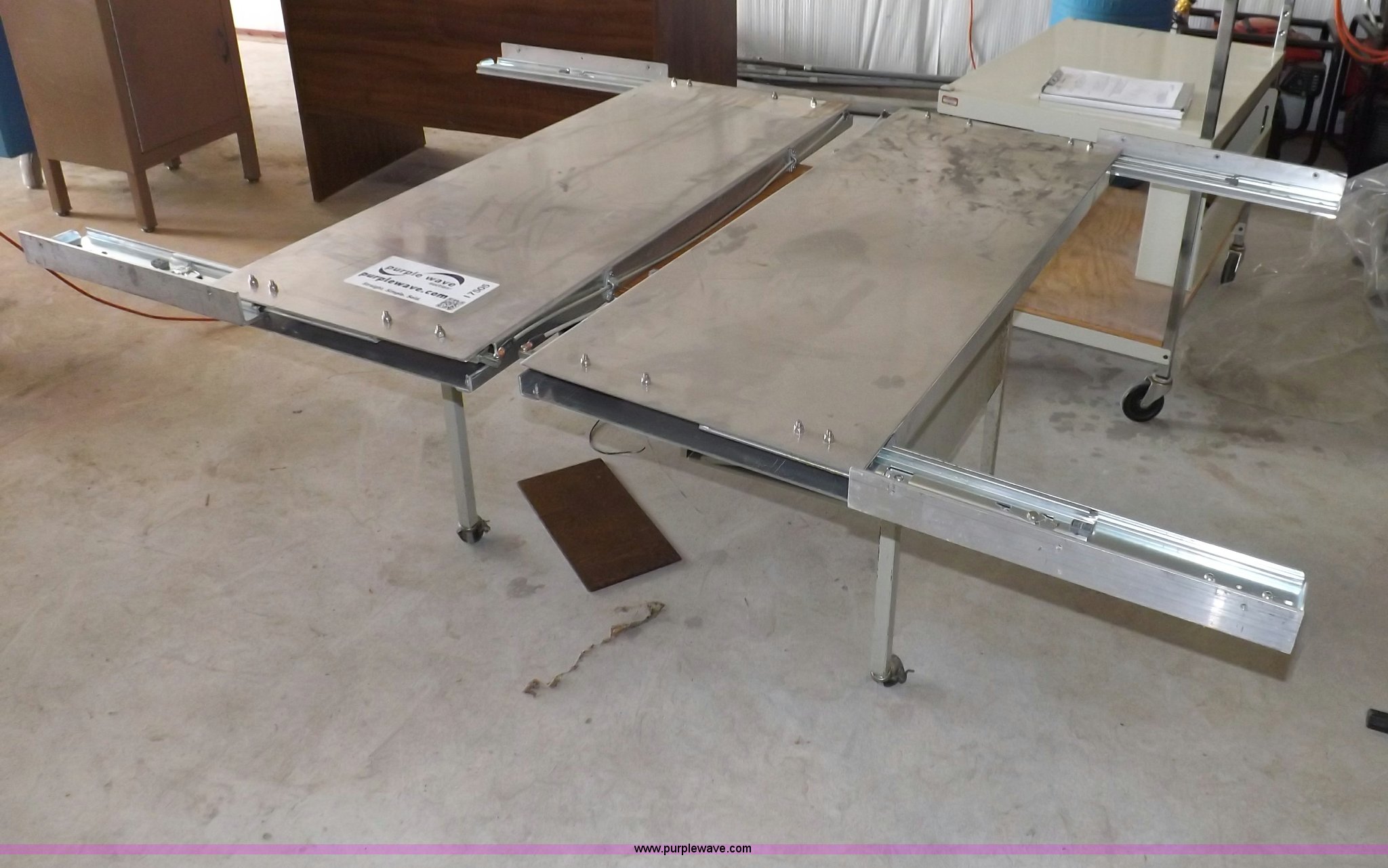 Purple Wave is selling a used Shelving and Storage in Kansas. This item is a (2) aluminum retractable shelf units with the following: 48"W x 18"D shelf, 50"W x 18"D mounting dimensions, Linkage needs repaired on one unit