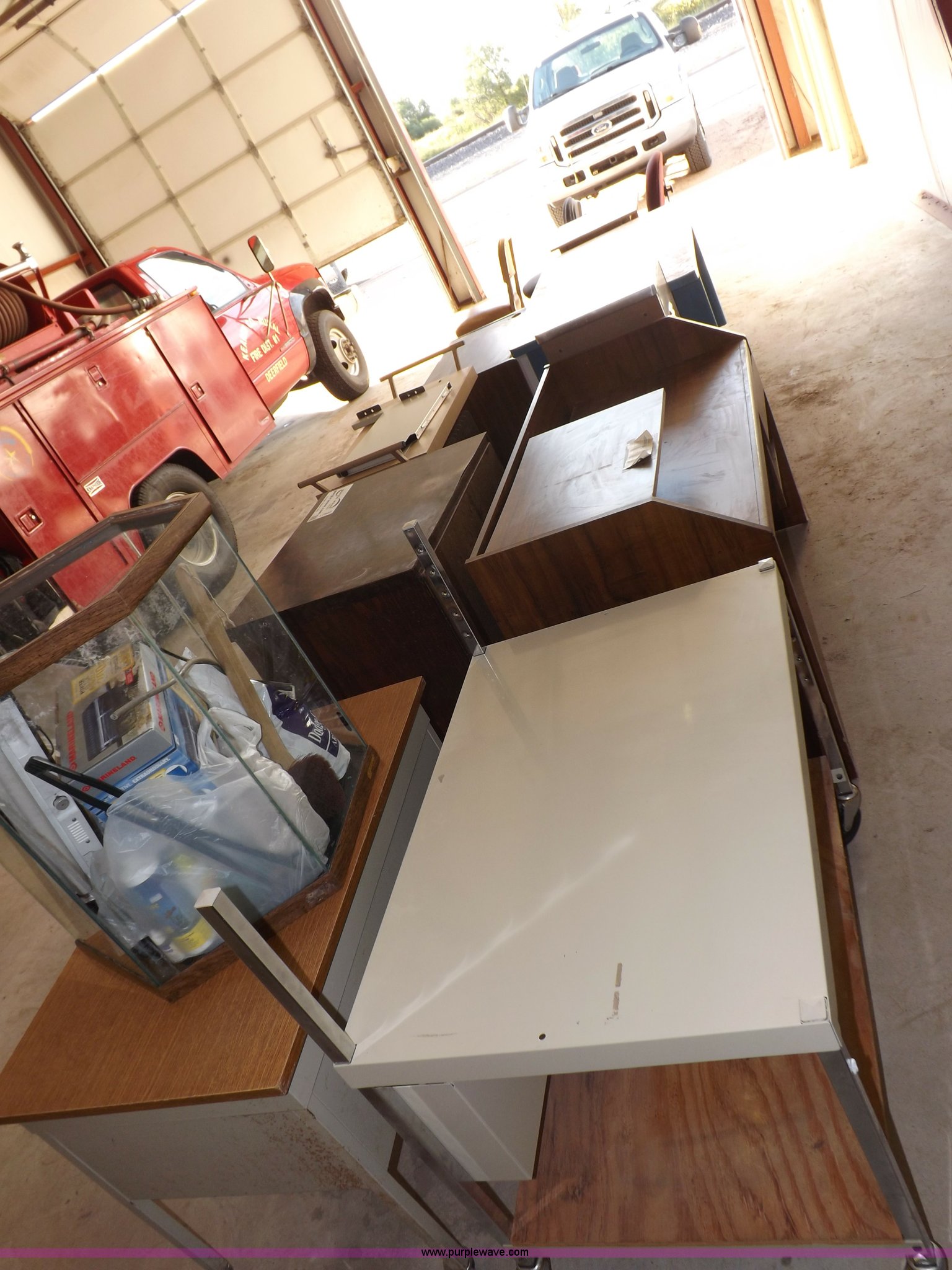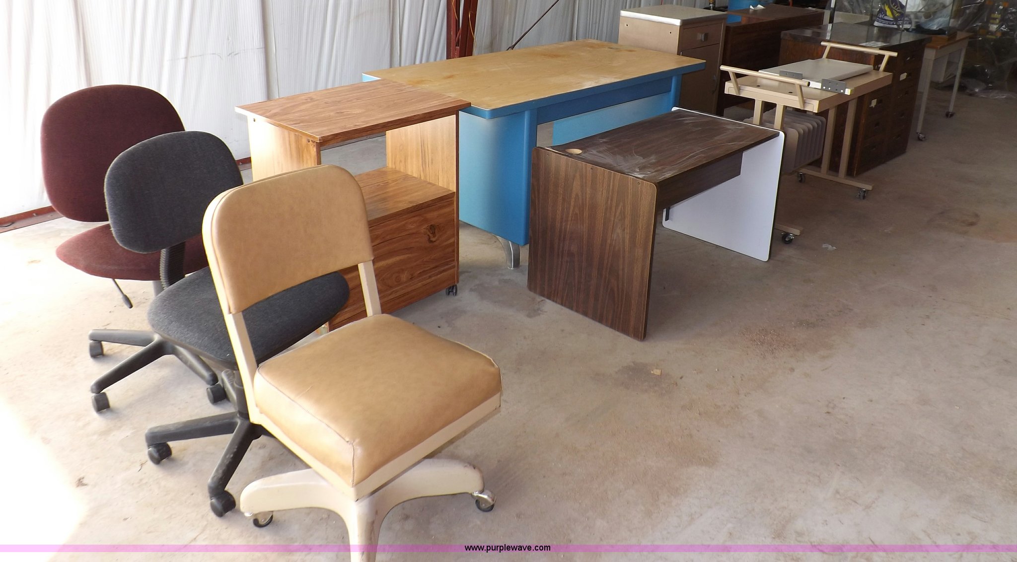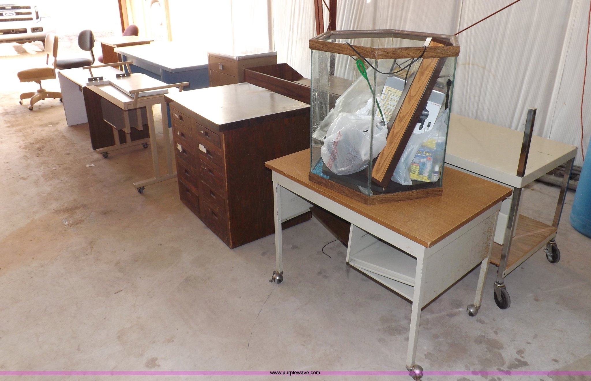 Purple Wave is selling a used Furniture in Kansas. This item is a Assorted office furniture with the following: Desks, Credenza, Cabinets, Chairs, Aquarium