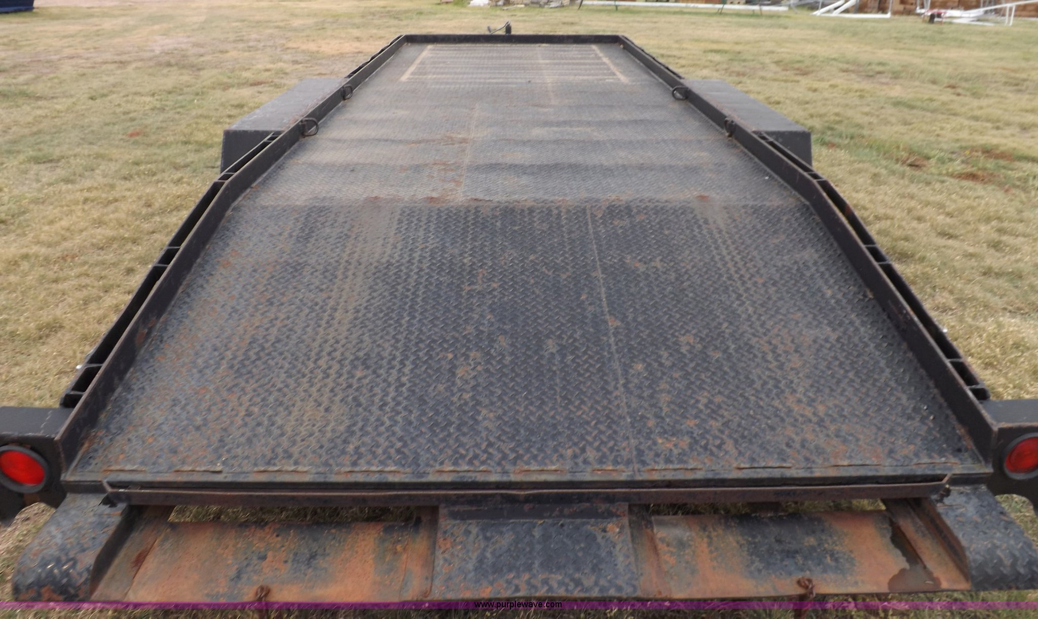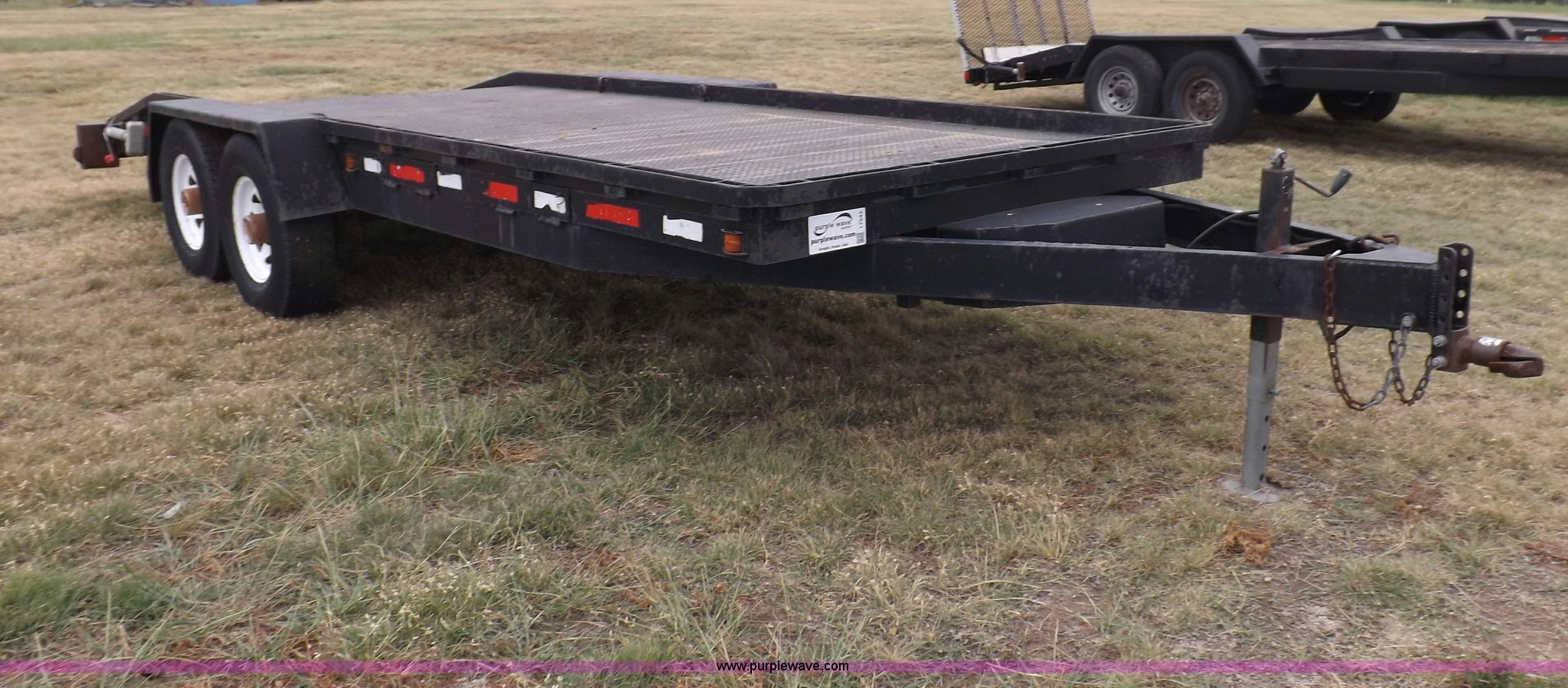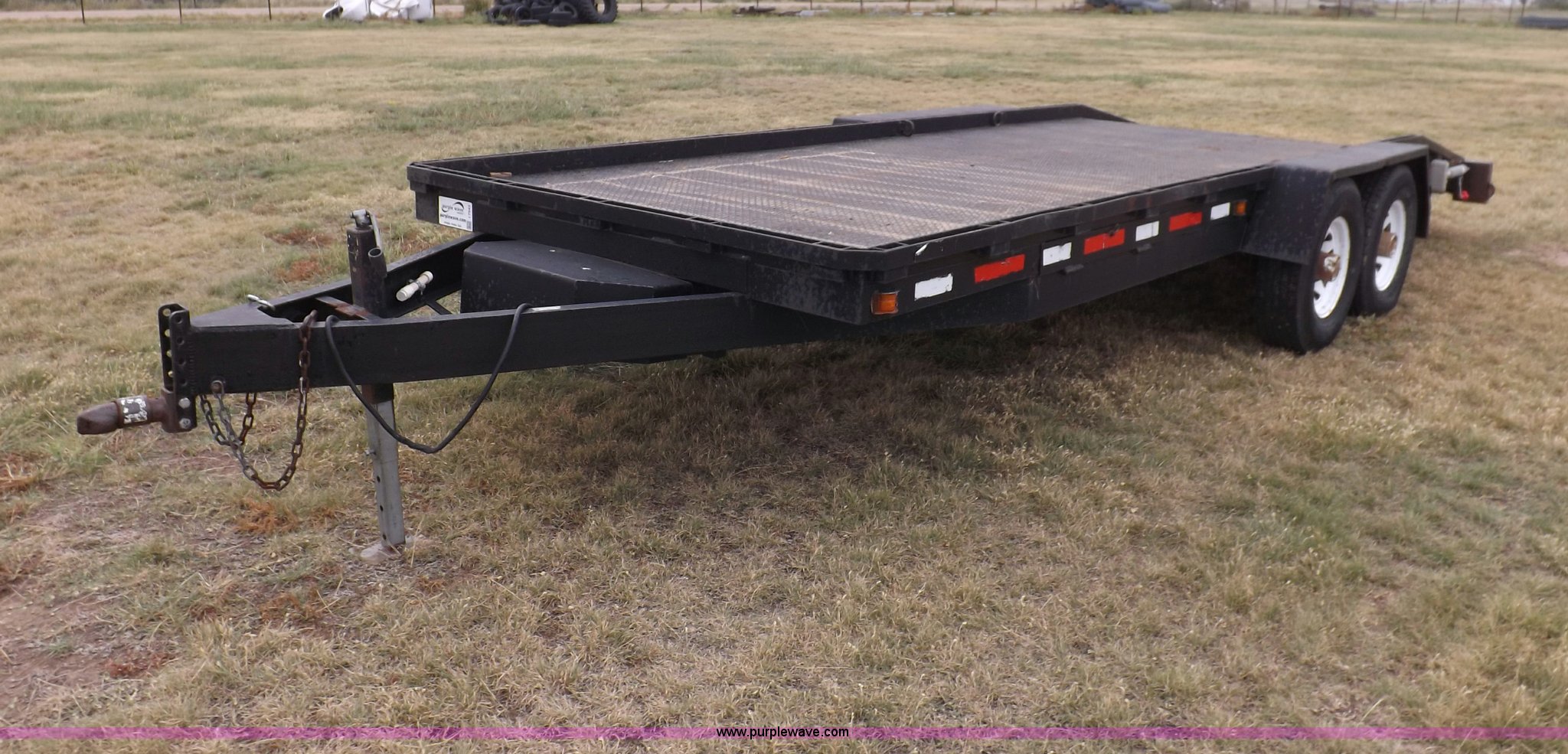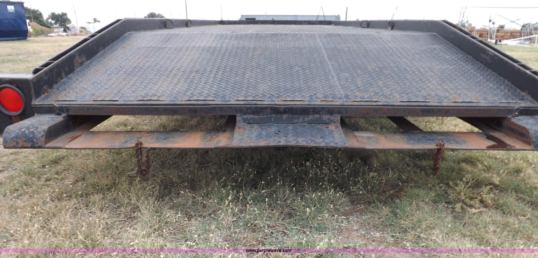 Purple Wave is selling a used Car or Utility Trailer in Kansas. This item is a 1998 shop built tandem axle trailer with the following: 20'8"L x 80"W, 4'L dovetail, Tread plate deck, Stake pockets, Rear stabilizers, Ramp pockets, Side D-ring tie downs, 2" adjustable height ball, Jack stand, Six pin trailer wiring, Safety chains, Eight bolt hubs, 235/85R16 tires, Weathered, Lights damaged, Tongue bent, Unit# GR217