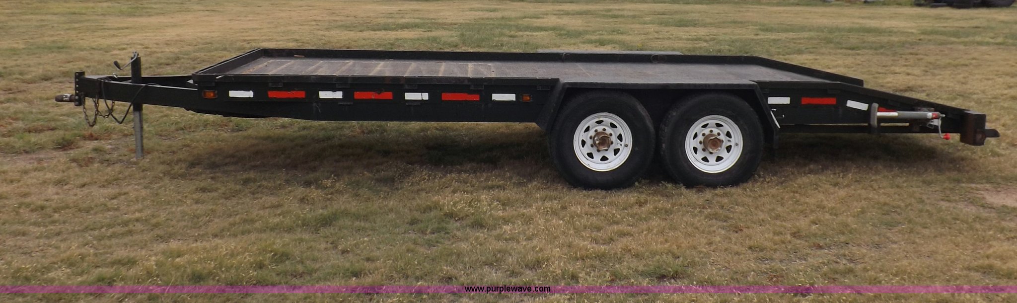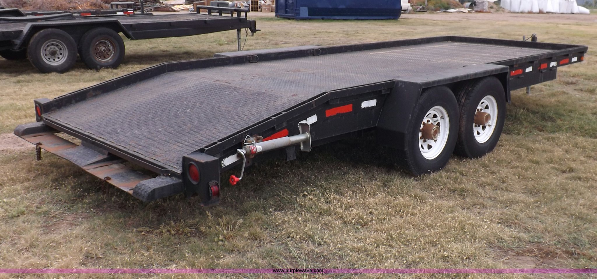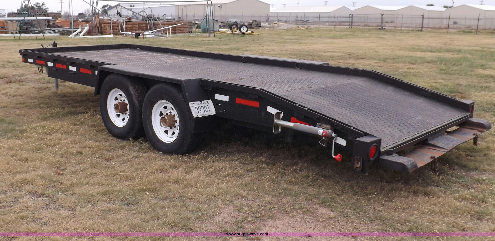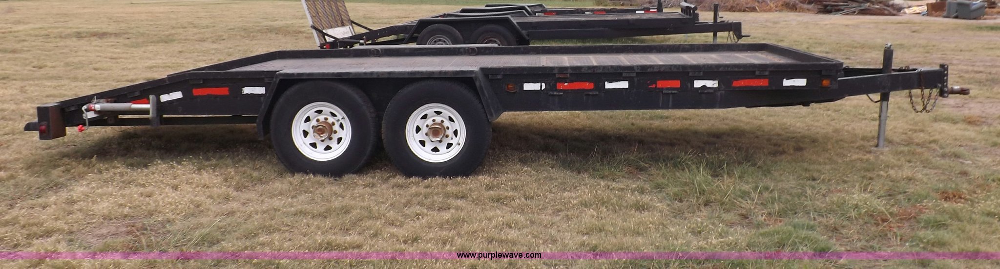 Purple Wave is selling a used Car or Utility Trailer in Kansas. This item is a 1998 shop built tandem axle trailer with the following: 20'8"L x 80"W, 4'L dovetail, Tread plate deck, Stake pockets, Rear stabilizers, Ramp pockets, Side D-ring tie downs, 2" adjustable height ball, Jack stand, Six pin trailer wiring, Safety chains, Eight bolt hubs, 235/85R16 tires, Weathered, Lights damaged, Tongue bent, Unit# GR217