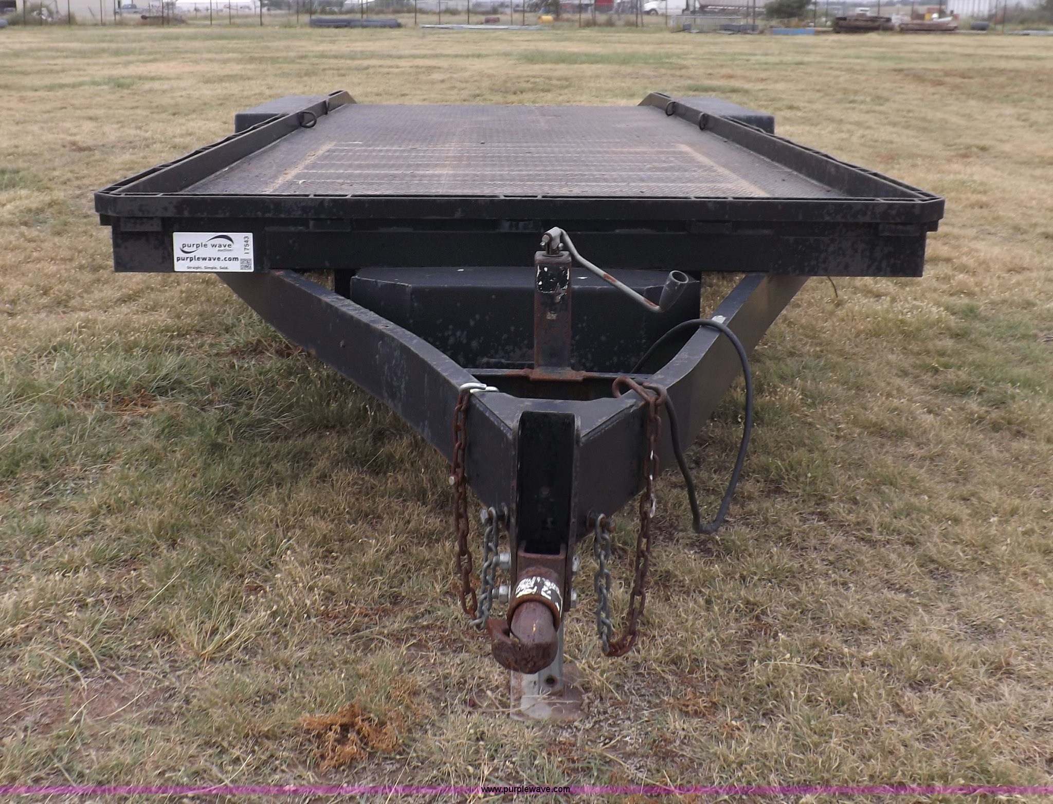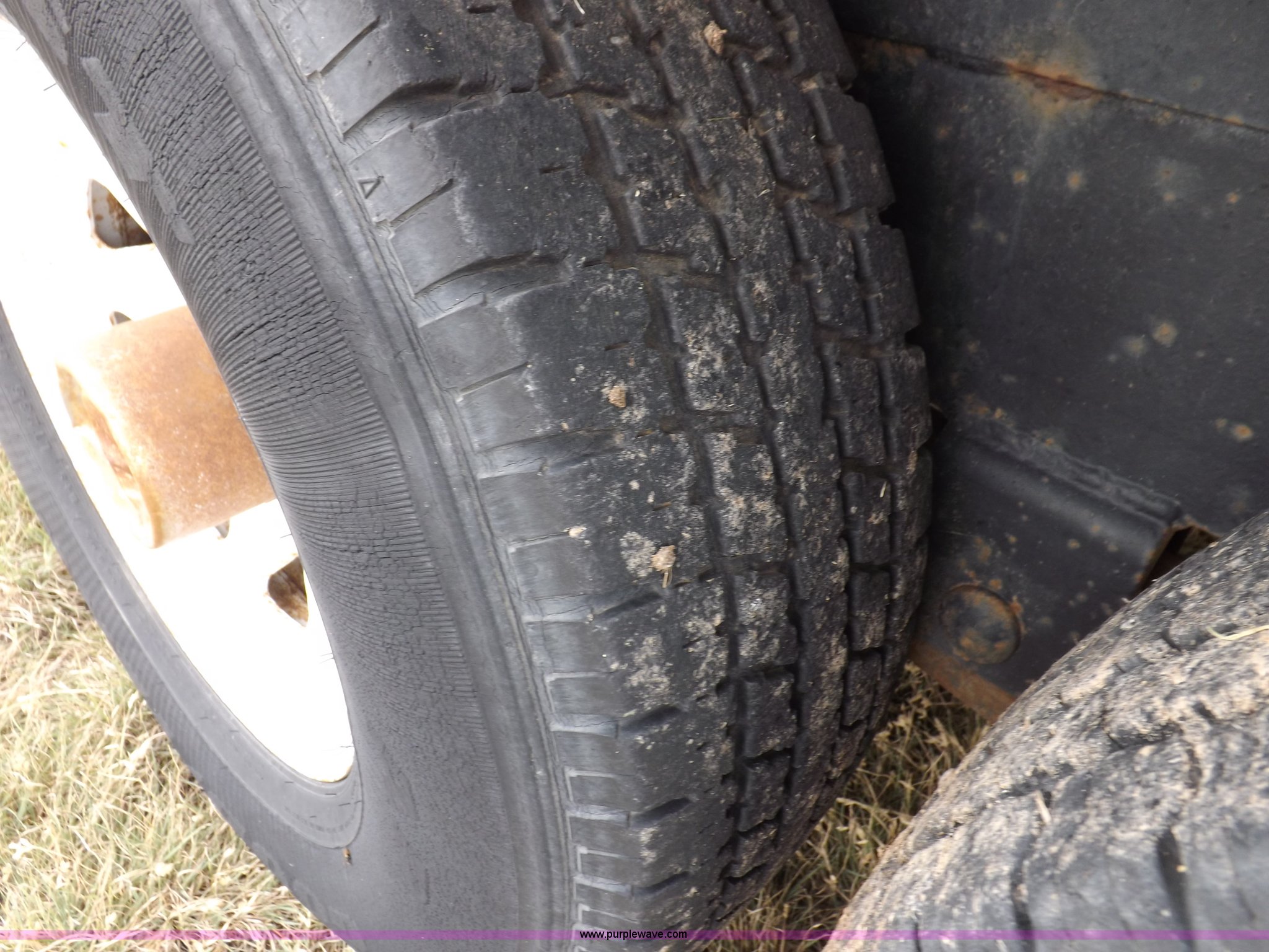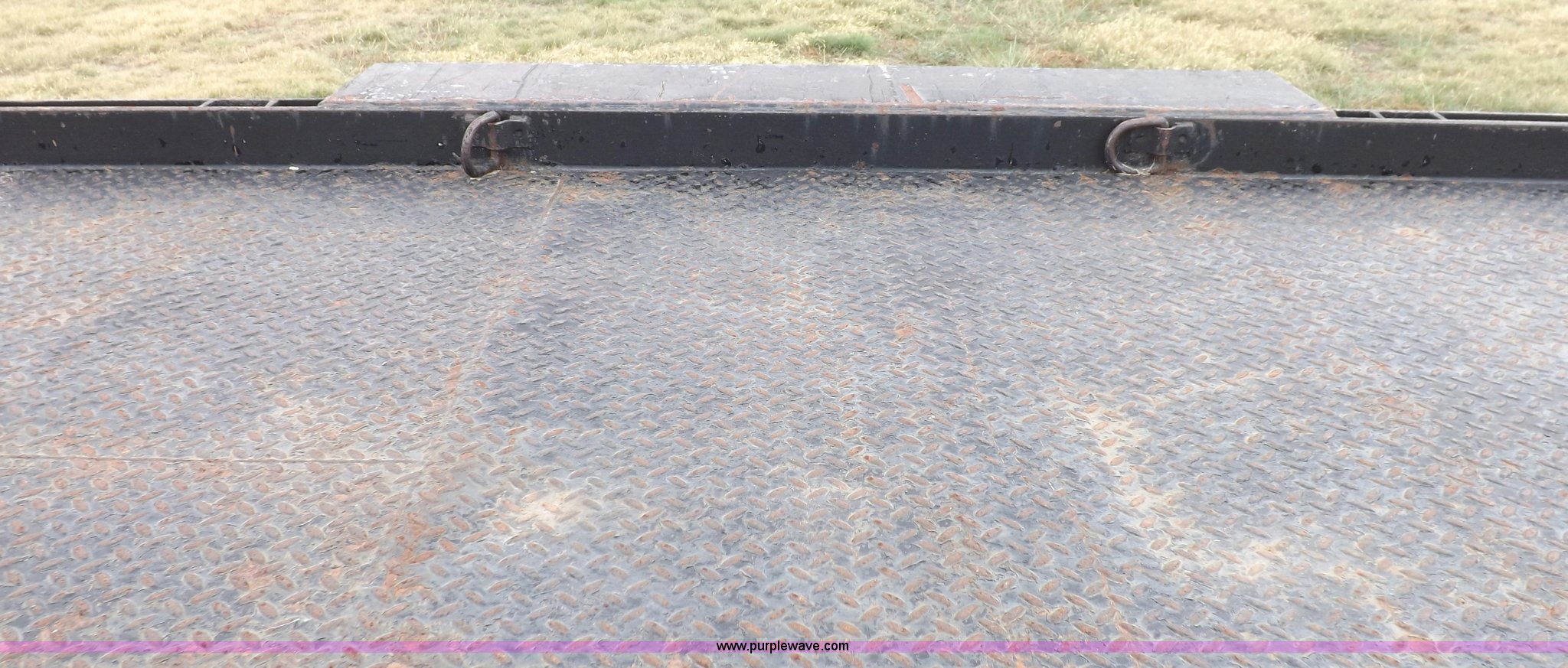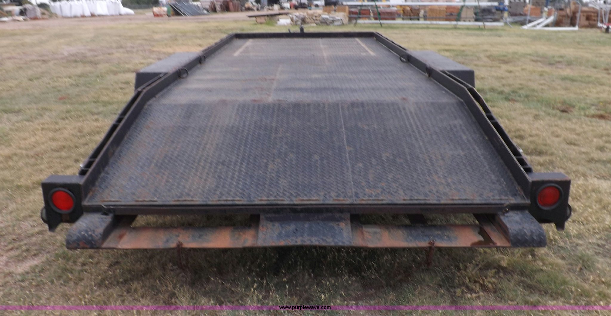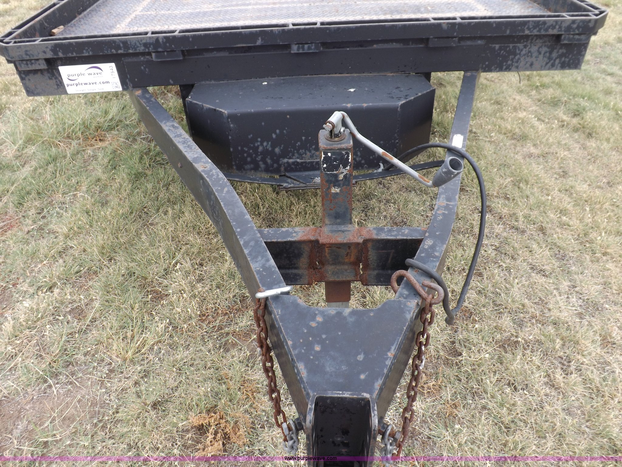 Purple Wave is selling a used Car or Utility Trailer in Kansas. This item is a 1998 shop built tandem axle trailer with the following: 20'8"L x 80"W, 4'L dovetail, Tread plate deck, Stake pockets, Rear stabilizers, Ramp pockets, Side D-ring tie downs, 2" adjustable height ball, Jack stand, Six pin trailer wiring, Safety chains, Eight bolt hubs, 235/85R16 tires, Weathered, Lights damaged, Tongue bent, Unit# GR217