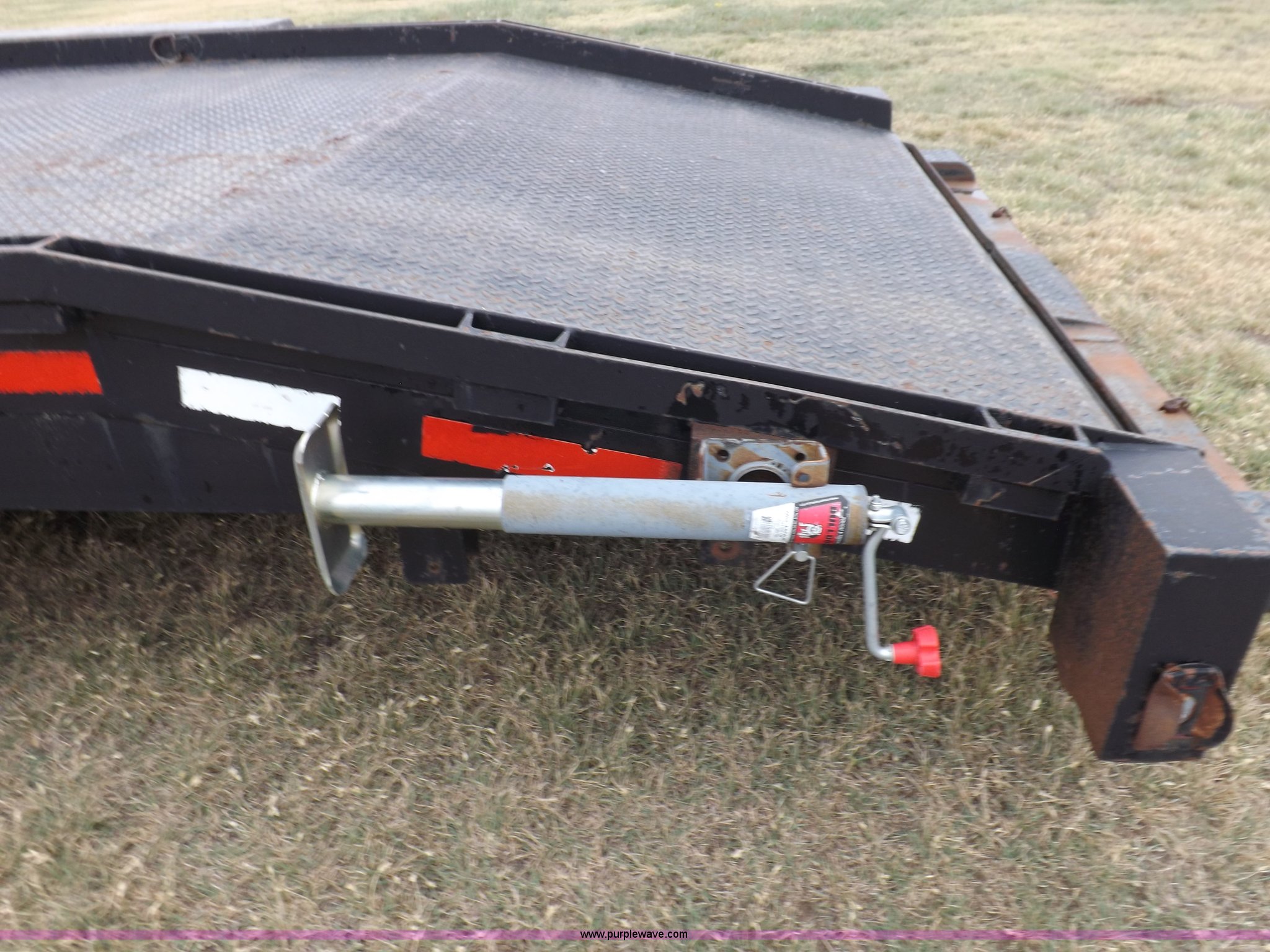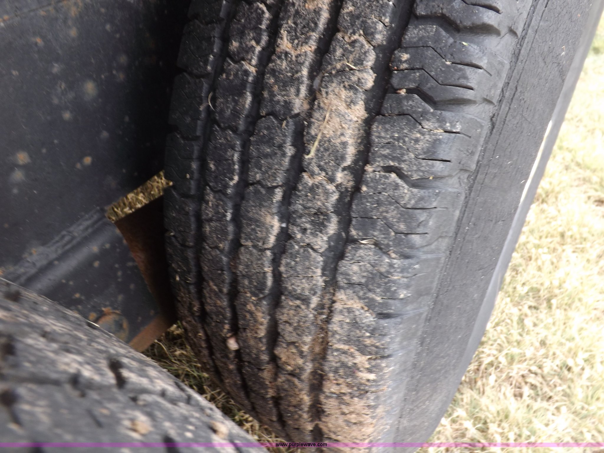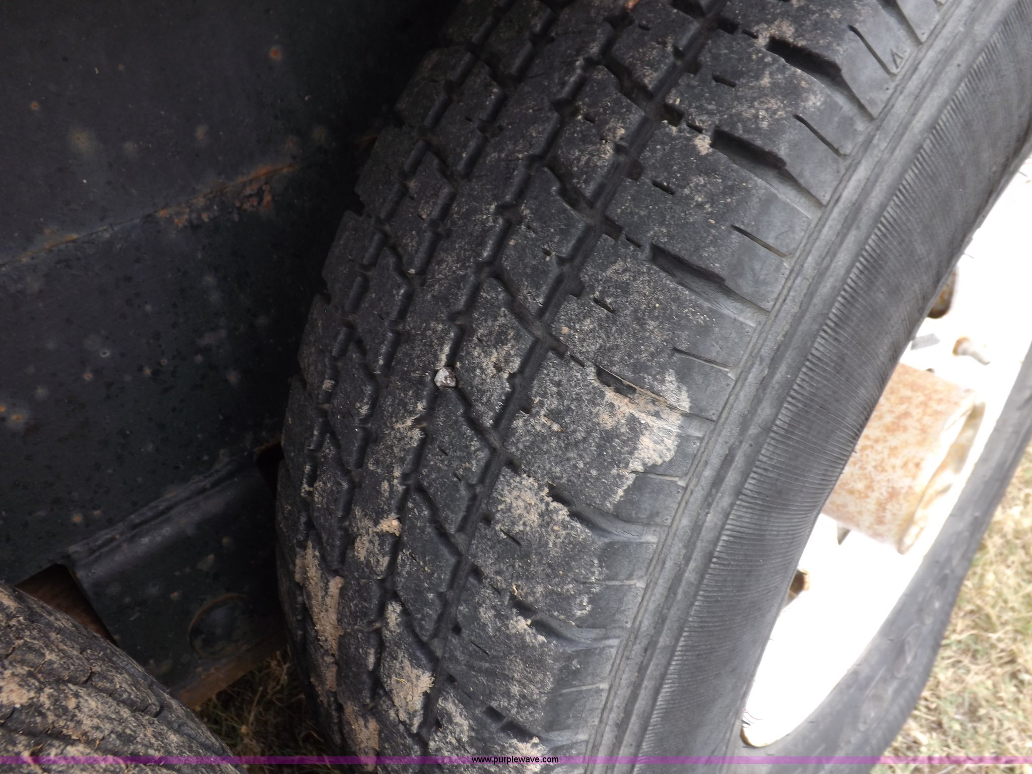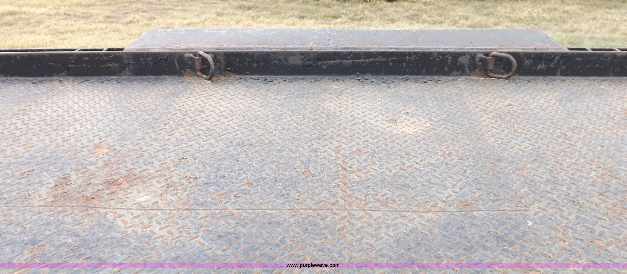 Purple Wave is selling a used Car or Utility Trailer in Kansas. This item is a 1998 shop built tandem axle trailer with the following: 20'8"L x 80"W, 4'L dovetail, Tread plate deck, Stake pockets, Rear stabilizers, Ramp pockets, Side D-ring tie downs, 2" adjustable height ball, Jack stand, Six pin trailer wiring, Safety chains, Eight bolt hubs, 235/85R16 tires, Weathered, Lights damaged, Tongue bent, Unit# GR217