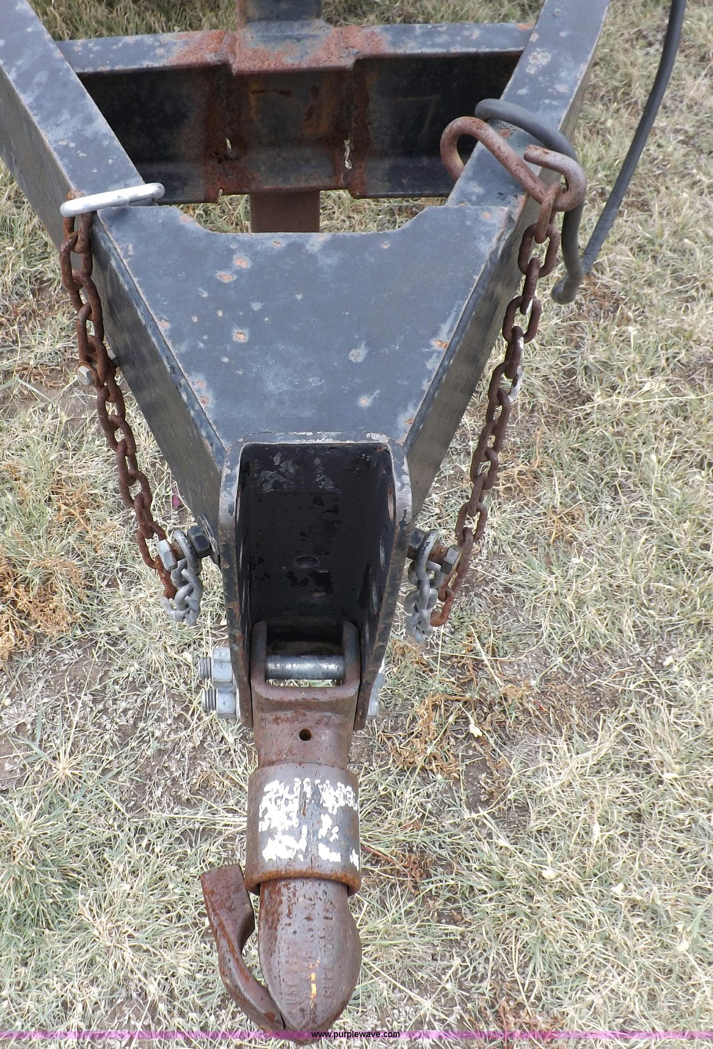 1998 shop built tandem axle trailer. 20'8"L x 80"W , 4'L dovetail, Tread plate deck, Stake pockets, Rear stabilizers, Ramp pockets, Side D-ring tie downs, 2" adjustable height ball, Jack stand, Six pin trailer wiring, Safety chains, Eight bolt hubs, 235/85R16 tires Weathered, Lights damaged, Tongue bent, Unit# GR217. KS118699. USD 457 - Plant Facilities. 4665 E Hwy 50. Garden City, KS 67846