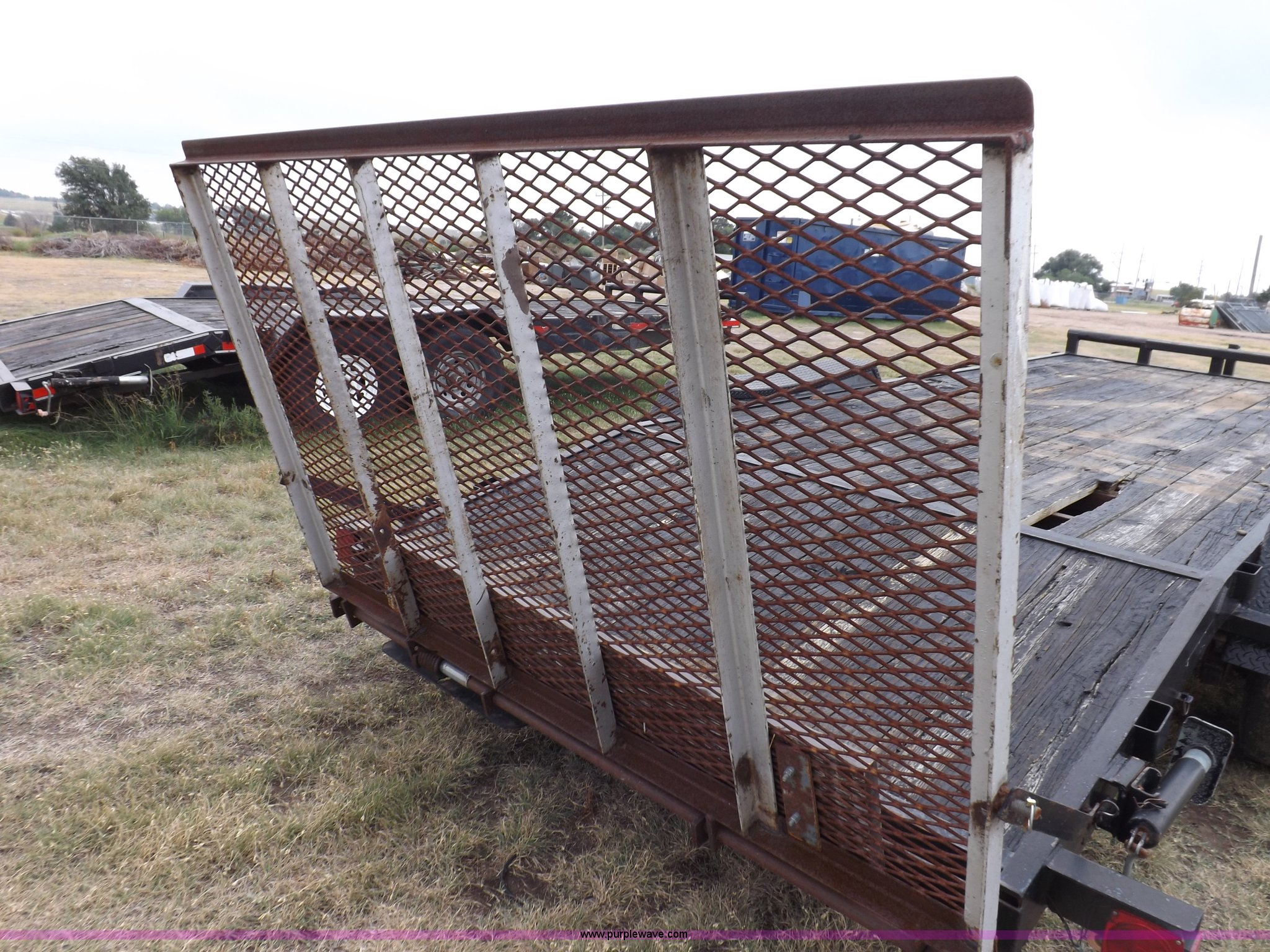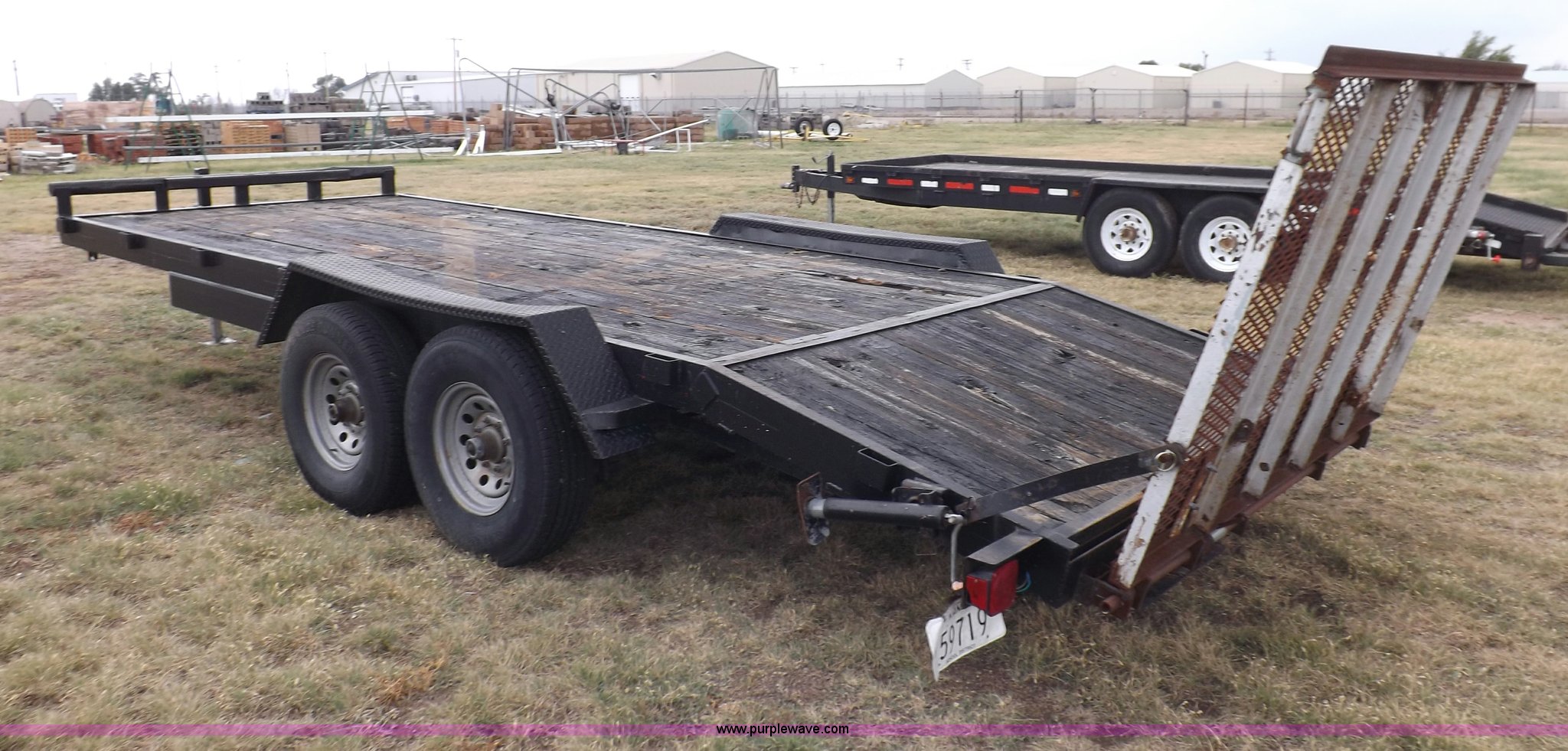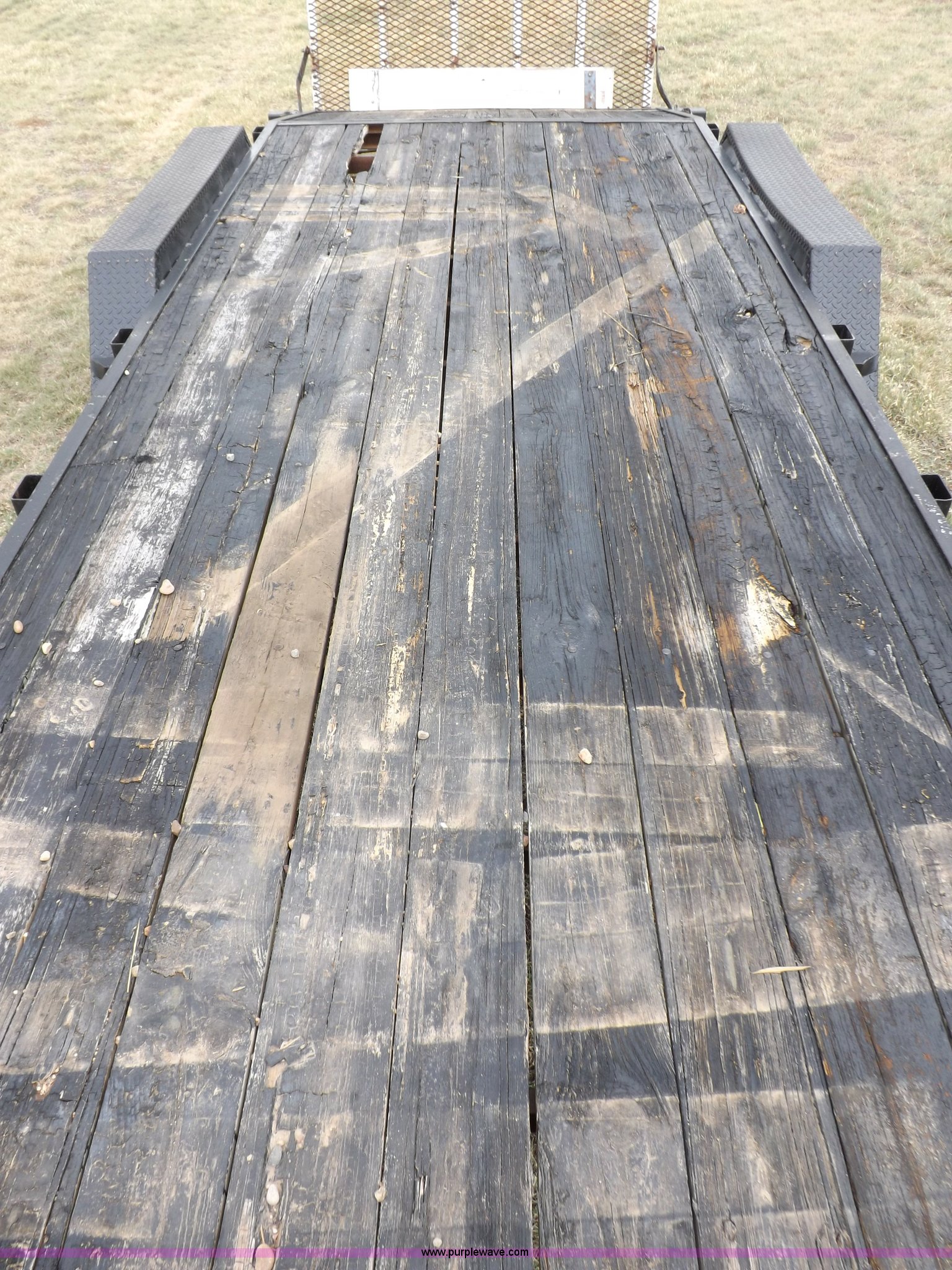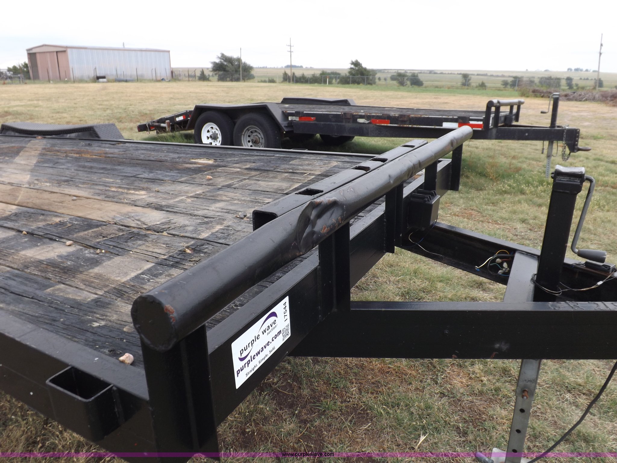 Purple Wave is selling a used Equip. Trailer in Kansas. This item is a 2003 Paris tandem axle trailer with the following: 20'L x 83"W, 4'L dovetail, Wood deck, 4'L x 81"W expanded metal ramp, Stake pockets, Rear stabilizers, Ramp pockets, Adjustable pintle hitch, Jack stand, Break-away device, Safety chains, Six pin trailer wiring, Eight bolt hubs, 235/85R16 tires, Side rail bent, Deck needs replaced, Fenders damaged, Lights damaged, Unit# GR219