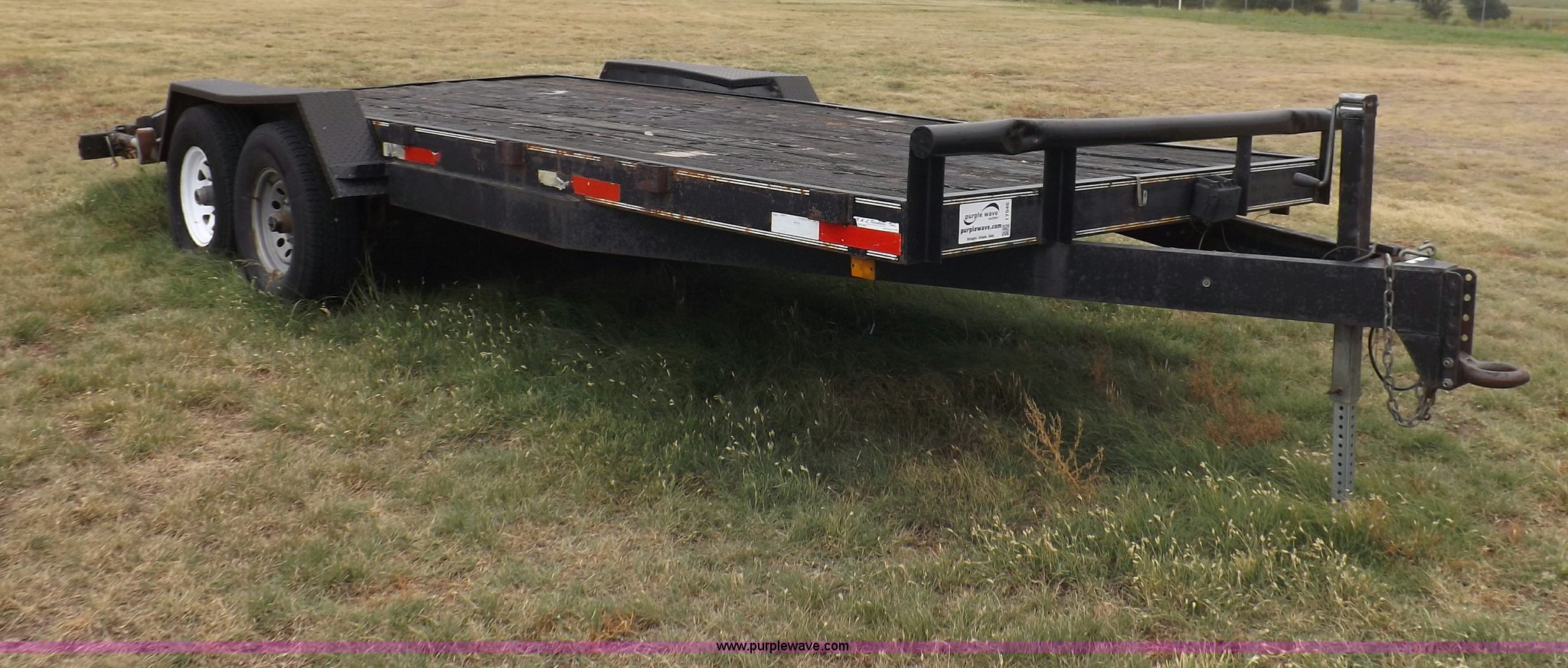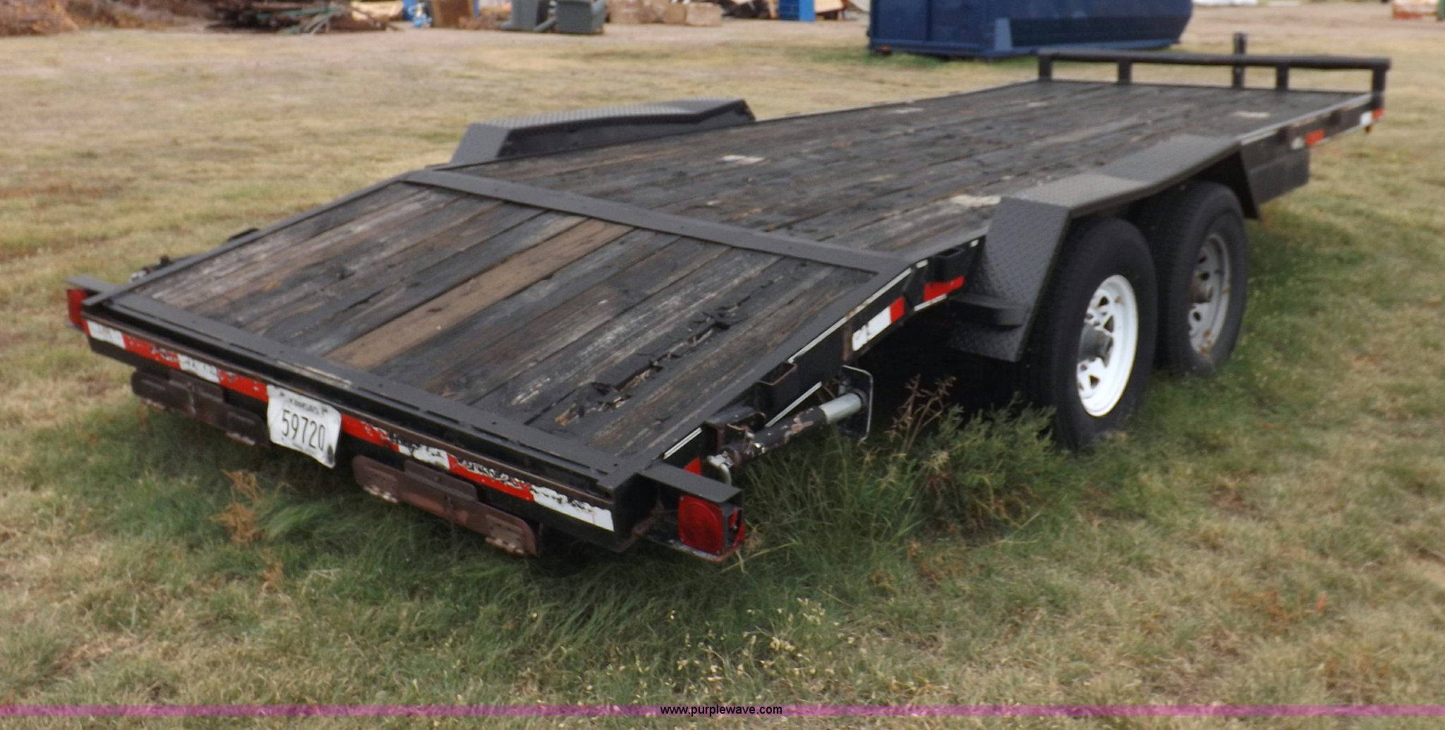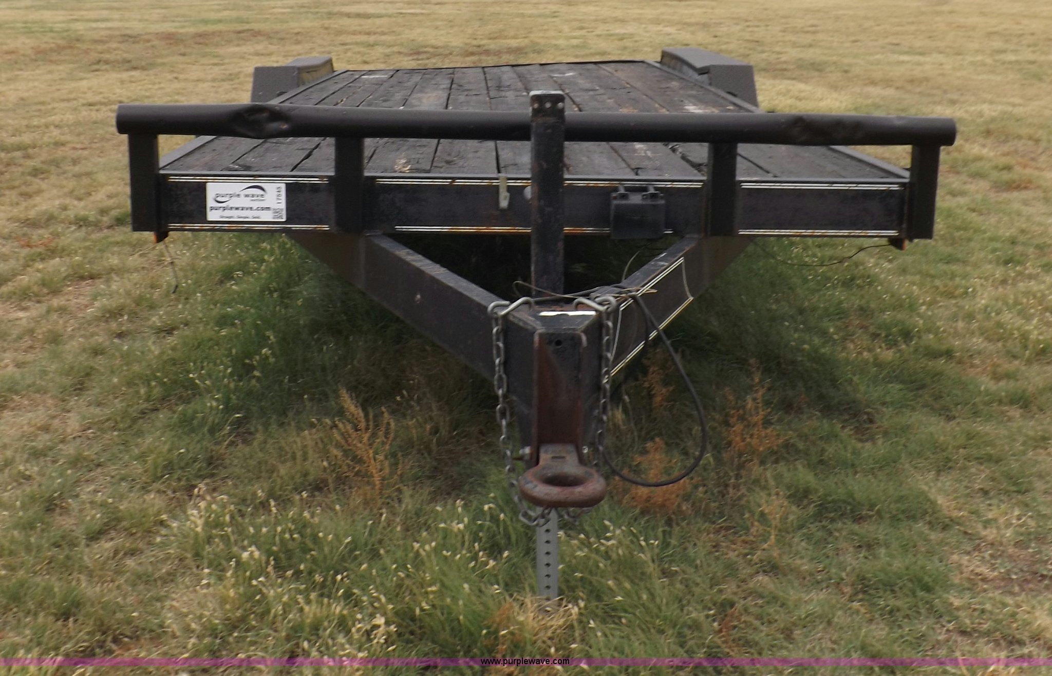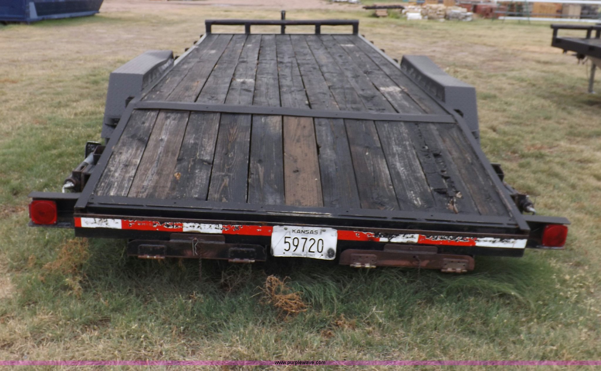 Purple Wave is selling a used Car or Utility Trailer in Kansas. This item is a 2003 Paris tandem axle trailer with the following: 20'L x 83"W, 4'L dovetail, Wood deck, Stake pockets, Rear stabilizers, Ramp pockets, Adjustable pintle hitch, Jack stand, Break-away device, Not wired, Safety chains, Six pin trailer wiring, Eight bolt hubs, 235/85R16 tires, Side rail bent, Deck needs replaced, Fenders damaged, Lights damaged, Unit# GR218