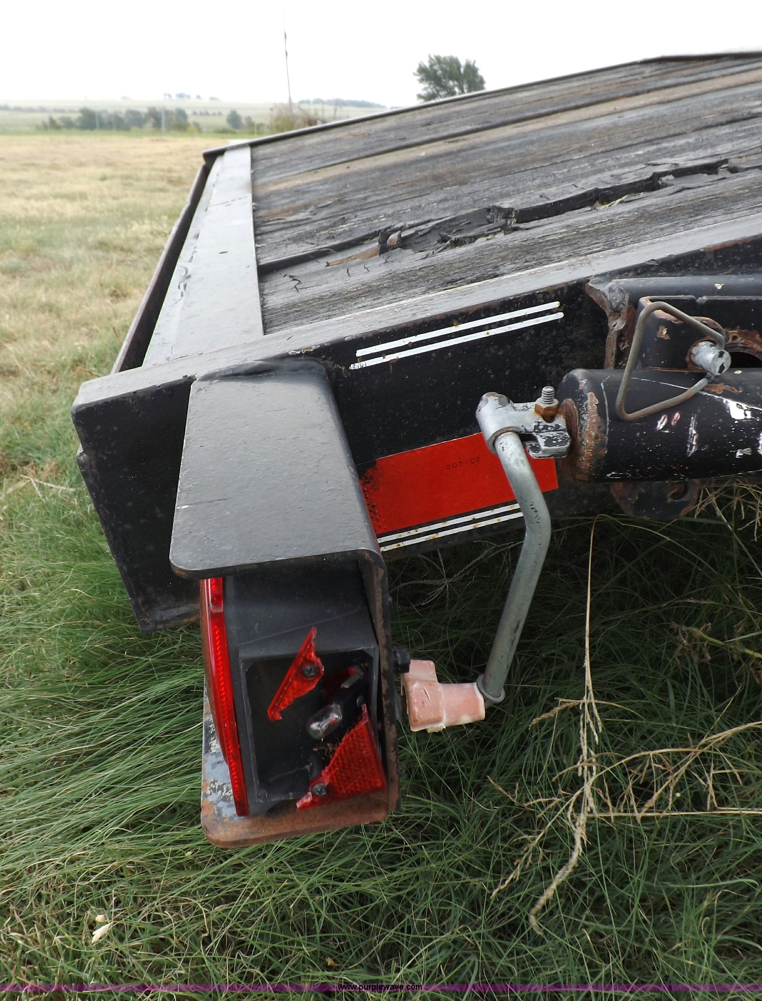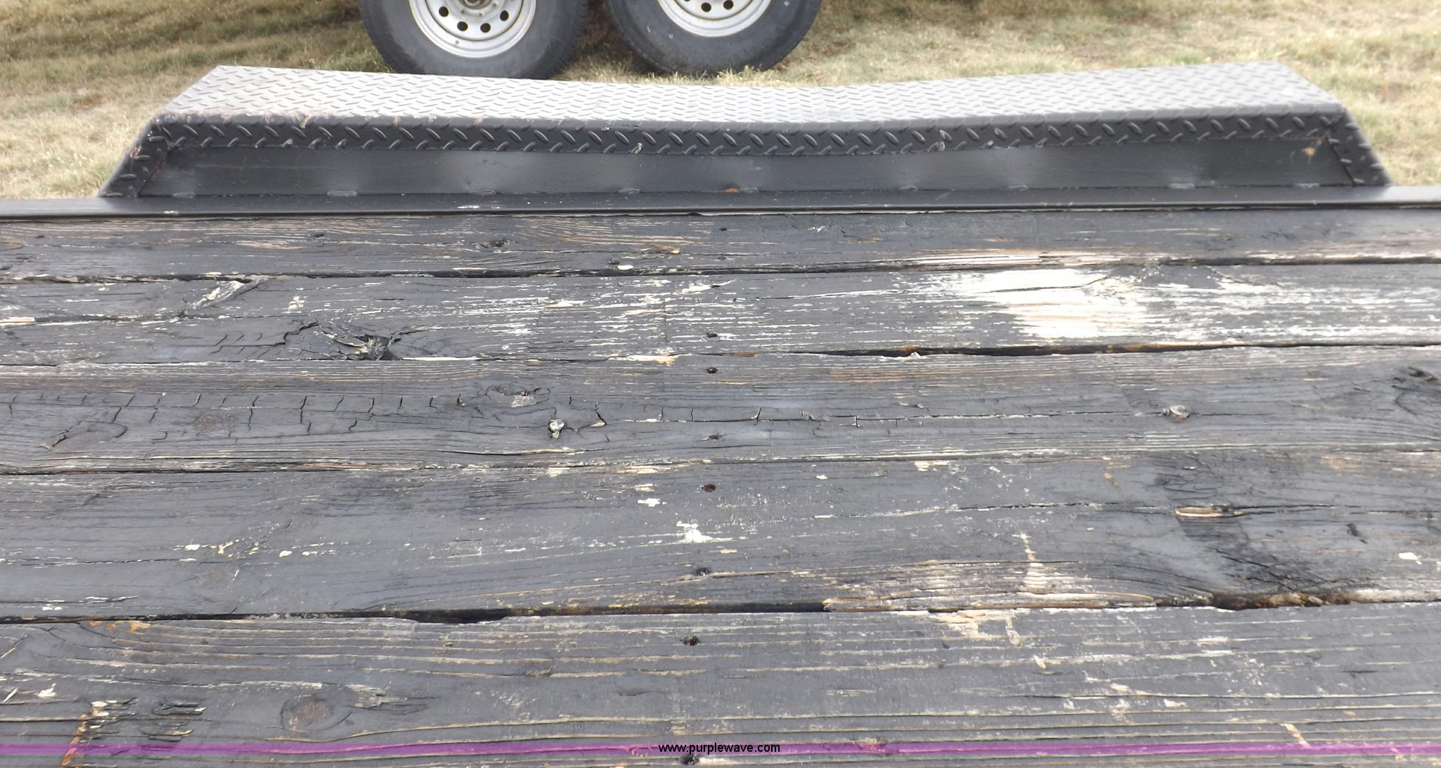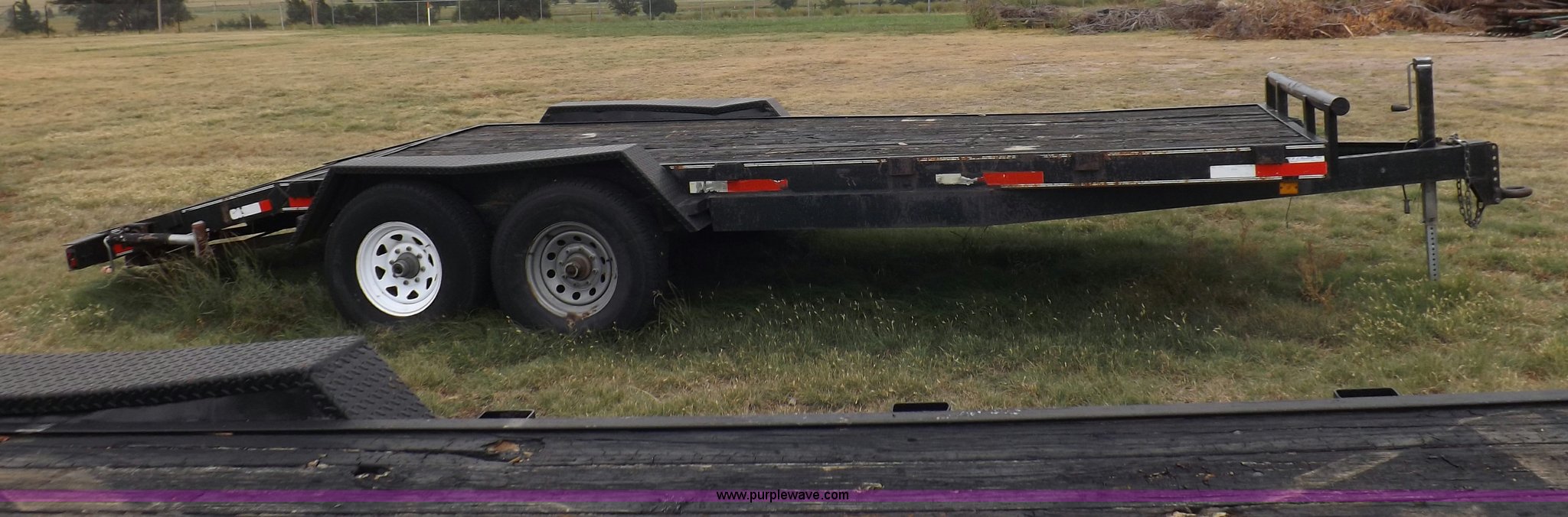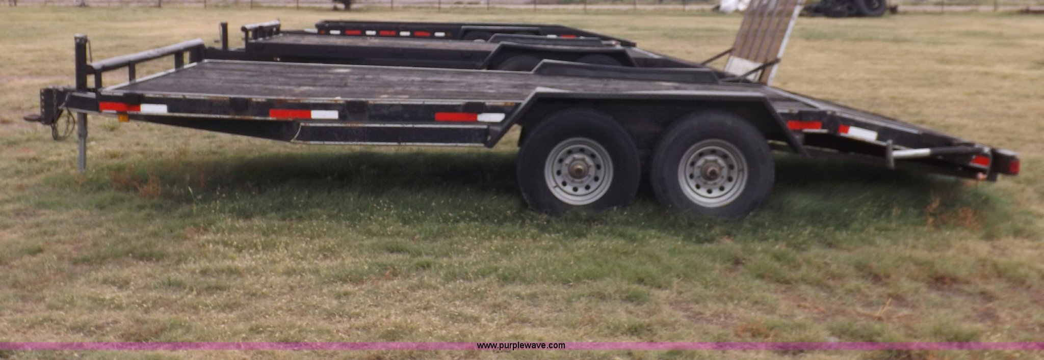 Purple Wave is selling a used Car or Utility Trailer in Kansas. This item is a 2003 Paris tandem axle trailer with the following: 20'L x 83"W, 4'L dovetail, Wood deck, Stake pockets, Rear stabilizers, Ramp pockets, Adjustable pintle hitch, Jack stand, Break-away device, Not wired, Safety chains, Six pin trailer wiring, Eight bolt hubs, 235/85R16 tires, Side rail bent, Deck needs replaced, Fenders damaged, Lights damaged, Unit# GR218