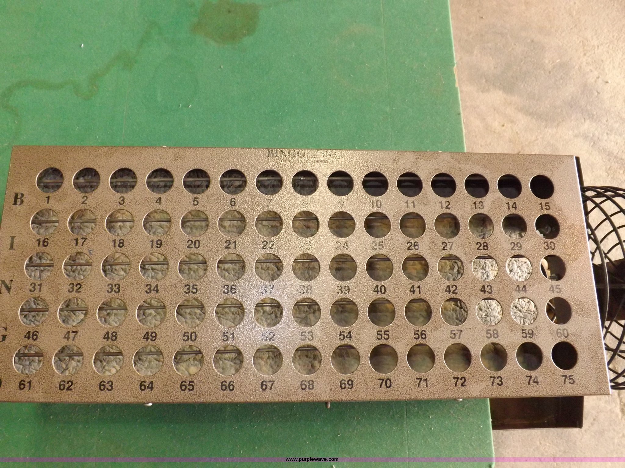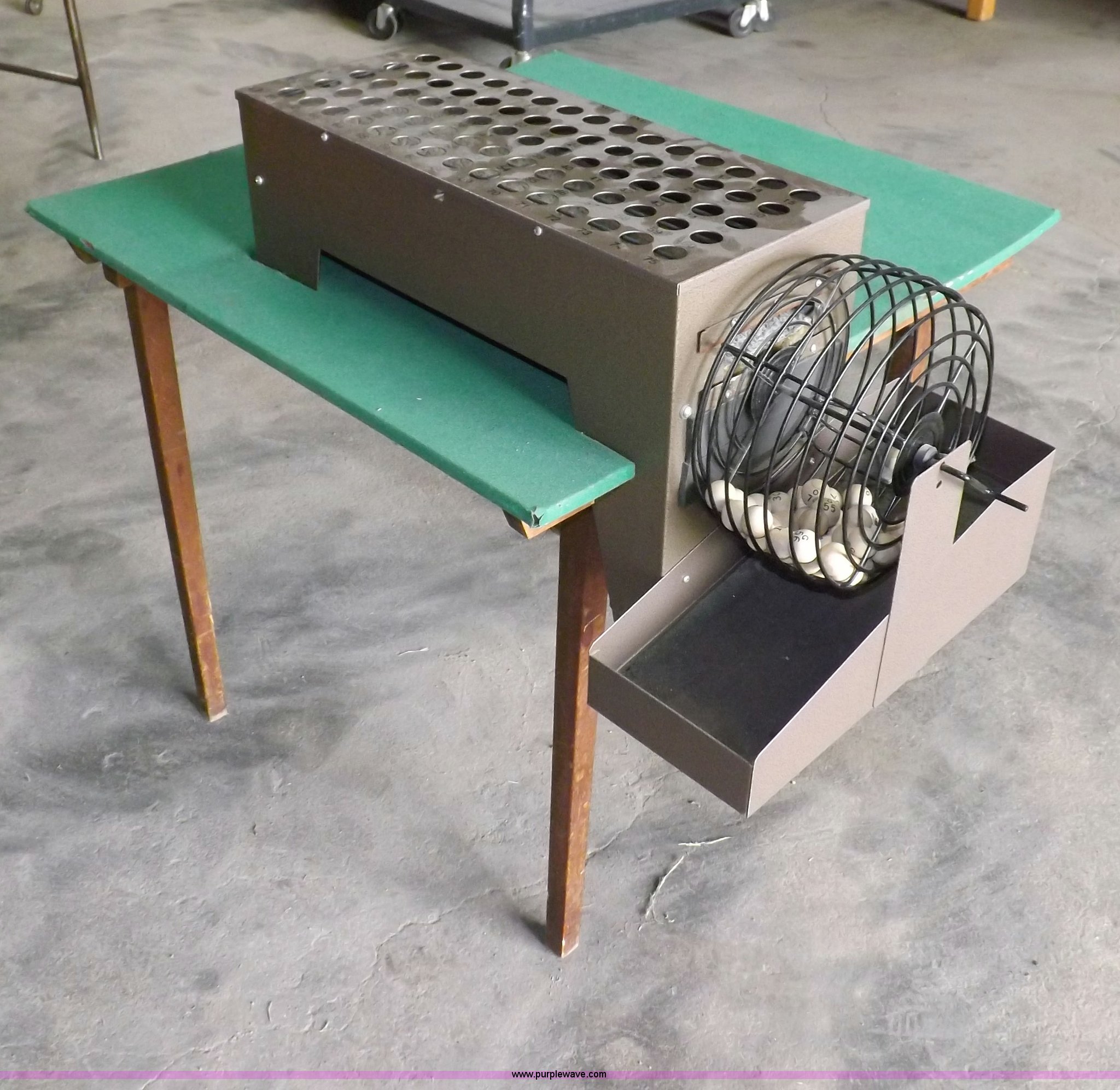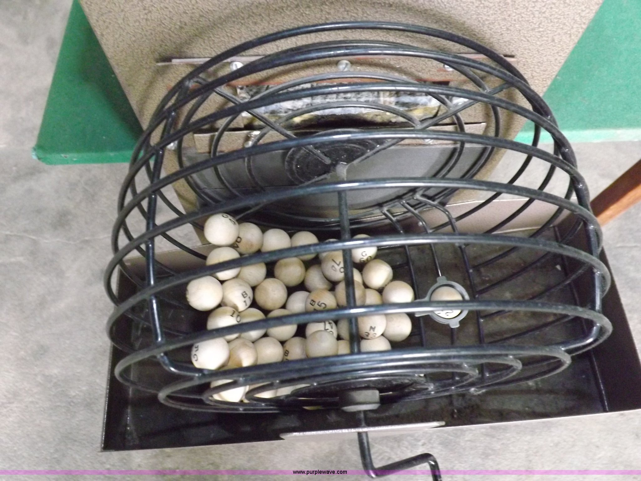 Purple Wave is selling a used Sporting Goods in Kansas. This item is a Bingo game with the following: Ball cage roller, Ball tray, Table, Table legs are weak, Balls may be missing