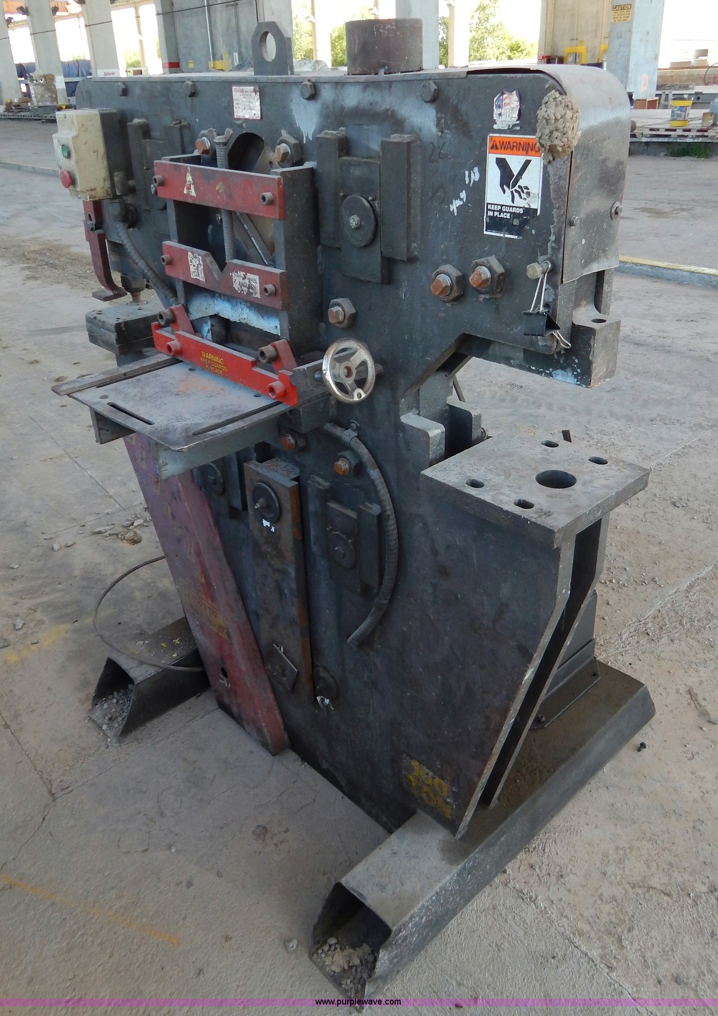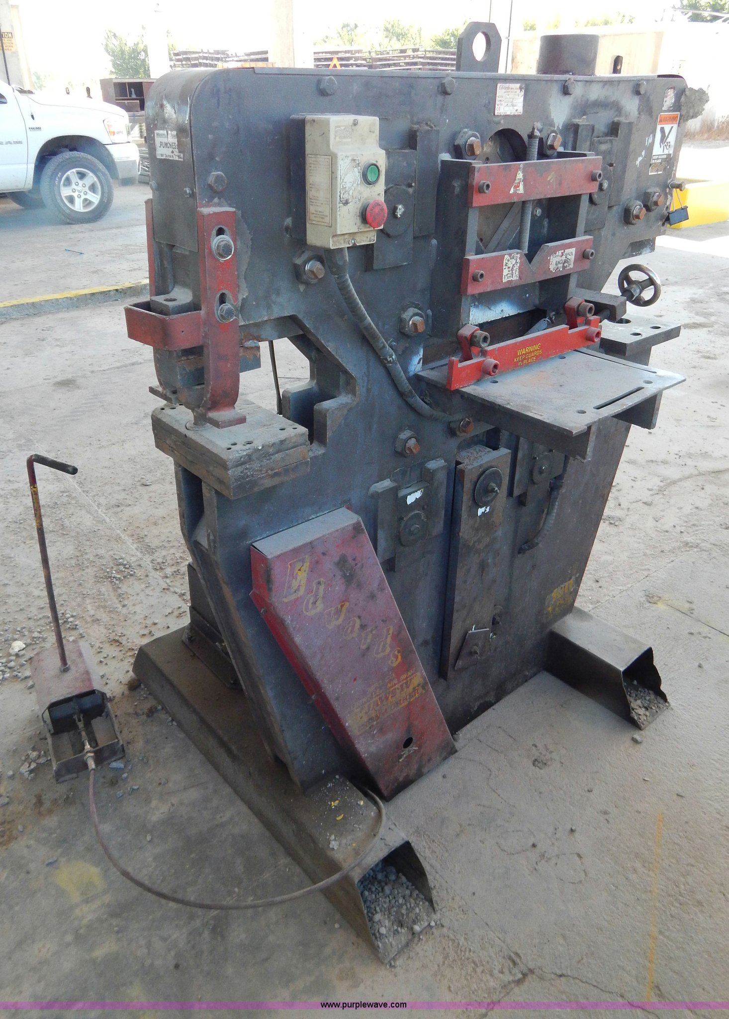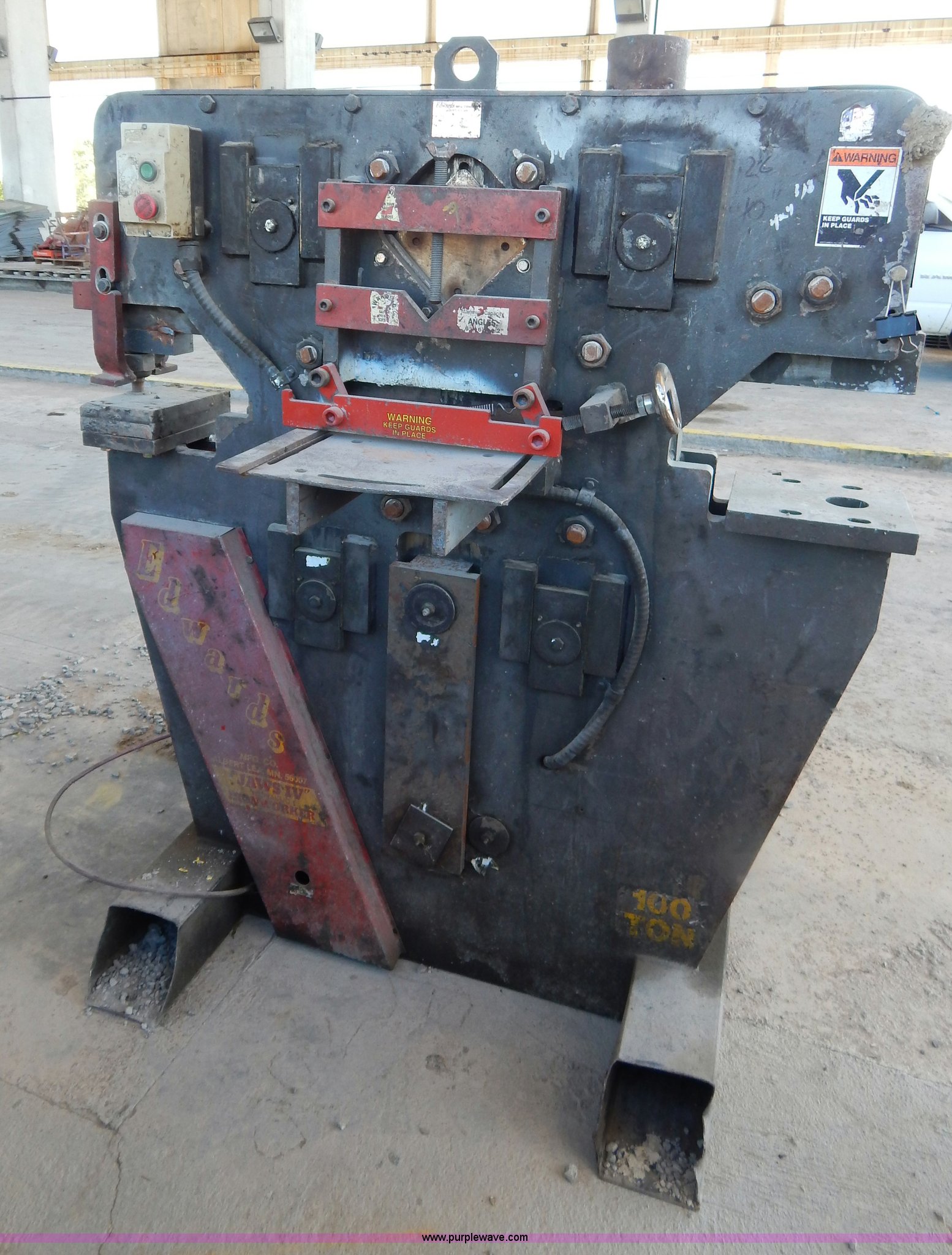 Purple Wave is selling a used Tools in Oklahoma. This item is a Edwards 100 ton iron worker with the following: 220V, Three phase, Serial 12521000