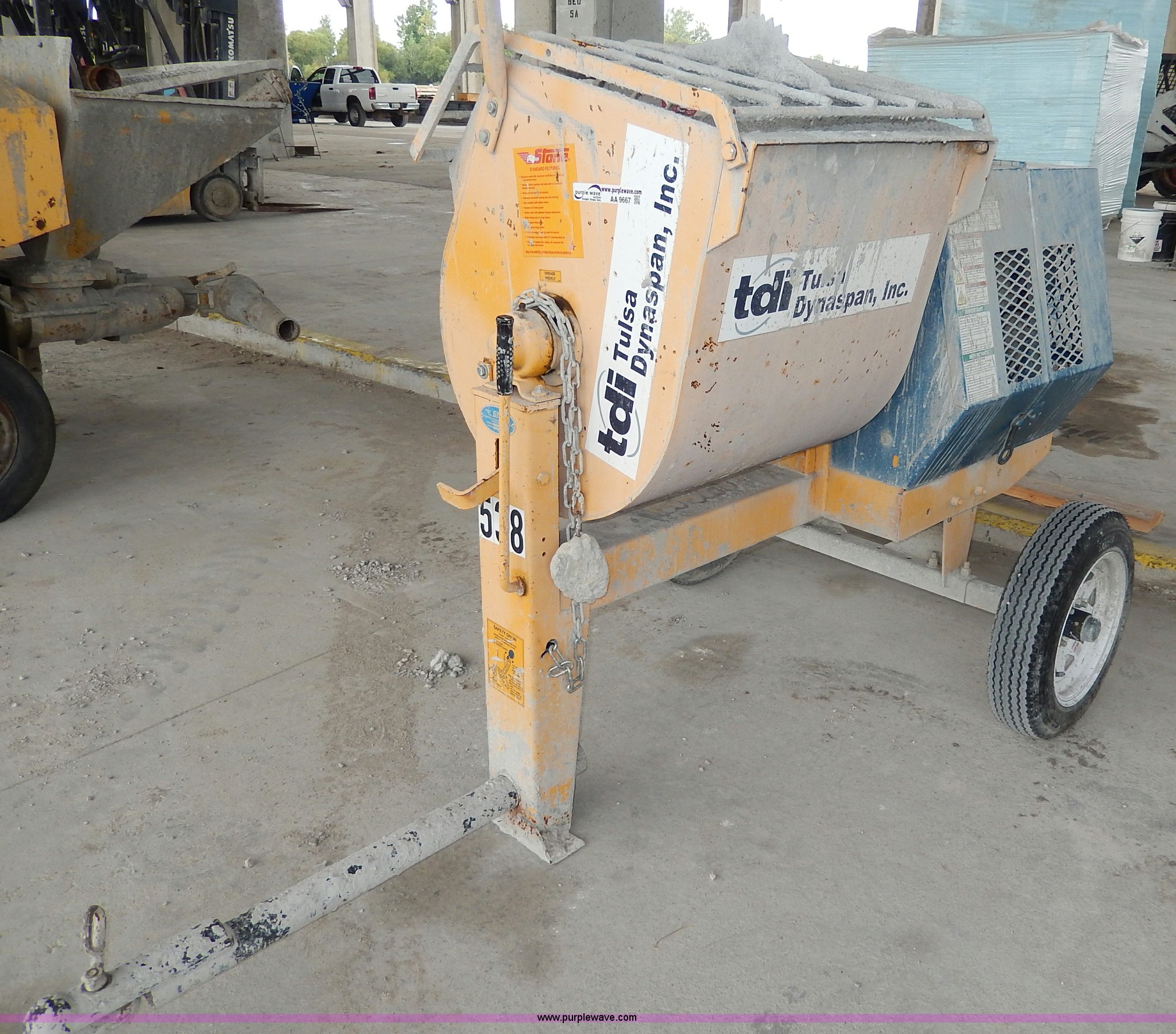 Stone 655PM portable concrete mixer. Honda GX240 gas engine, 2" ball receiver, 4.80-12 tires, Serial 202008146, TDI 538. Tulsa Dynaspan, Inc.. 1601 E Houston Street. Broken Arrow, OK 74012
