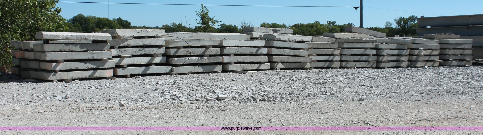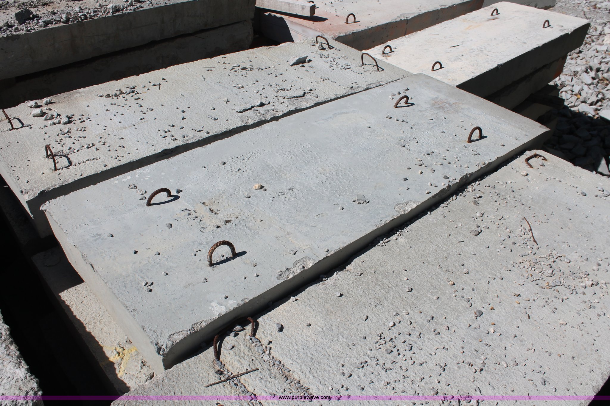 Purple Wave is selling a used Building Materials in Oklahoma. This item is a (15) concrete dunnage blocks with the following: Approximately 98"L x 38"W x 10" thick, Embedded rebar hooks, Approximately 3,200 lbs each