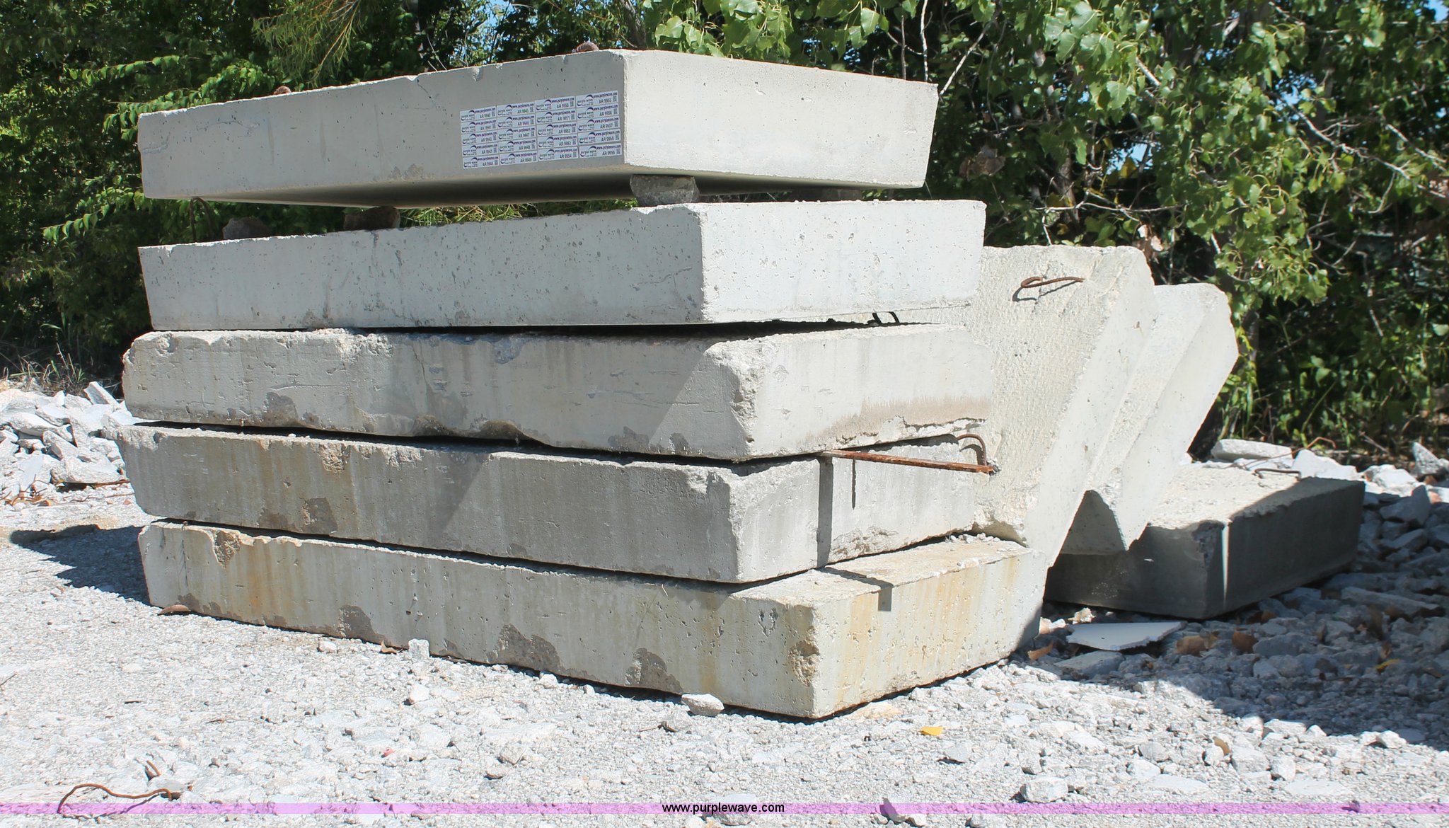 Purple Wave is selling a used Building Materials in Oklahoma. This item is a (15) concrete dunnage blocks with the following: Approximately 98"L x 38"W x 10" thick, Embedded rebar hooks, Approximately 3,200 lbs each