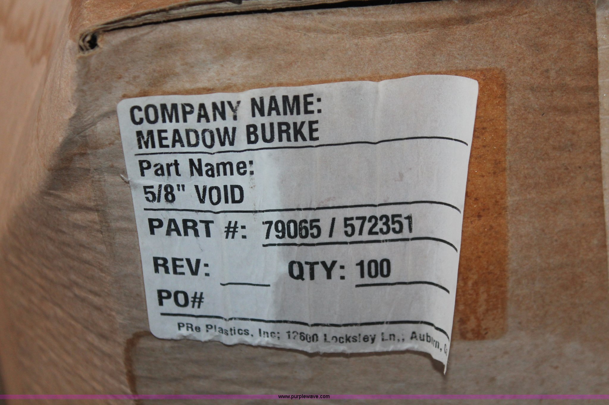 Assorted concrete hardware materials. Meadow Burke plastic recess members (1,692) four ton Part No. 79067, Eight boxes, (1,157) four ton Part No. 79065, (12) boxes, (1,509) four ton Part No. 6160, (1,410) Burkes 4/5 ton Part No. 79548, Five barrels, (124) Burkes 4/5 ton Part No. 79077, (36) Burkes 4/5 ton Part No. 79589-SPHS, (782) Burkes 4/5 ton One barrel, (115) Burkes 4/5 ton Part No. 79044, One barrel, Shear bars (279) four ton Part No. 45847, (1,509) four ton Part No. 79141, Tension bars (103) 38" No. 5, (166) 25" No. 4, (365) 26" No. 4.. Tulsa Dynaspan, Inc.. 1601 E Houston Street. Broken Arrow, OK 74012