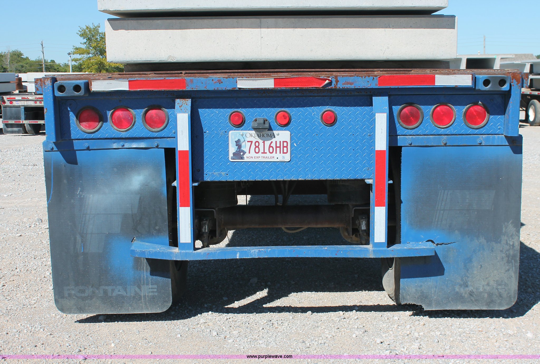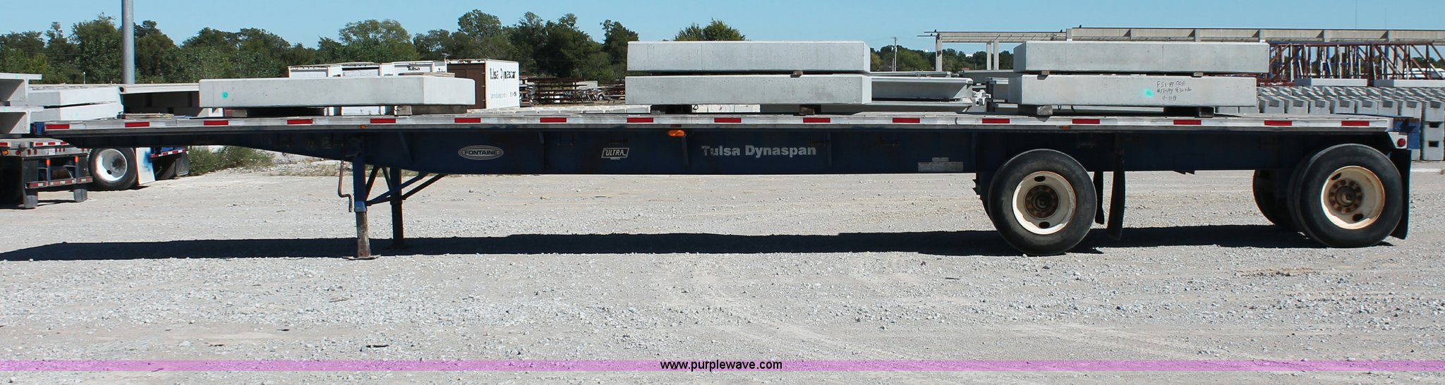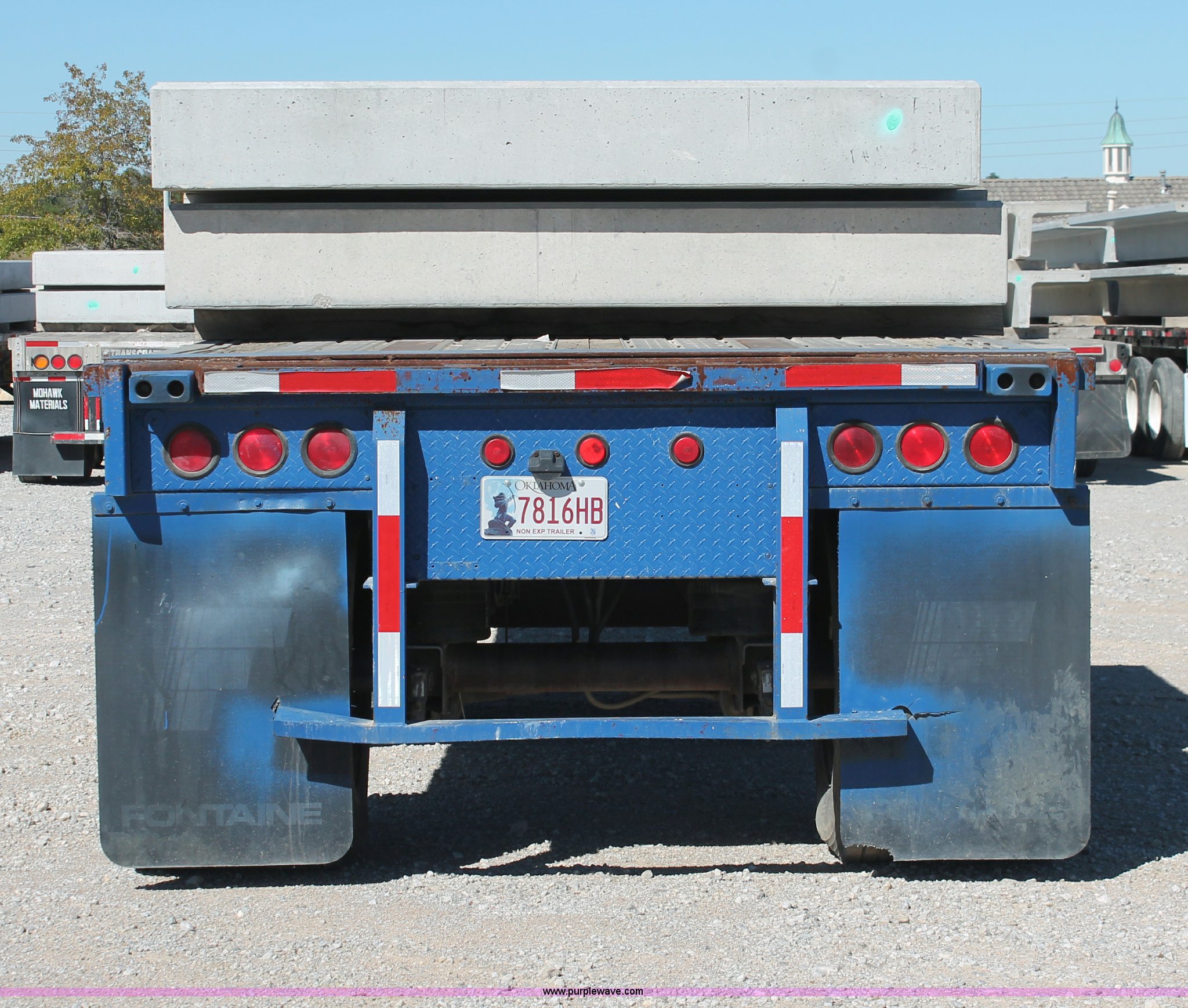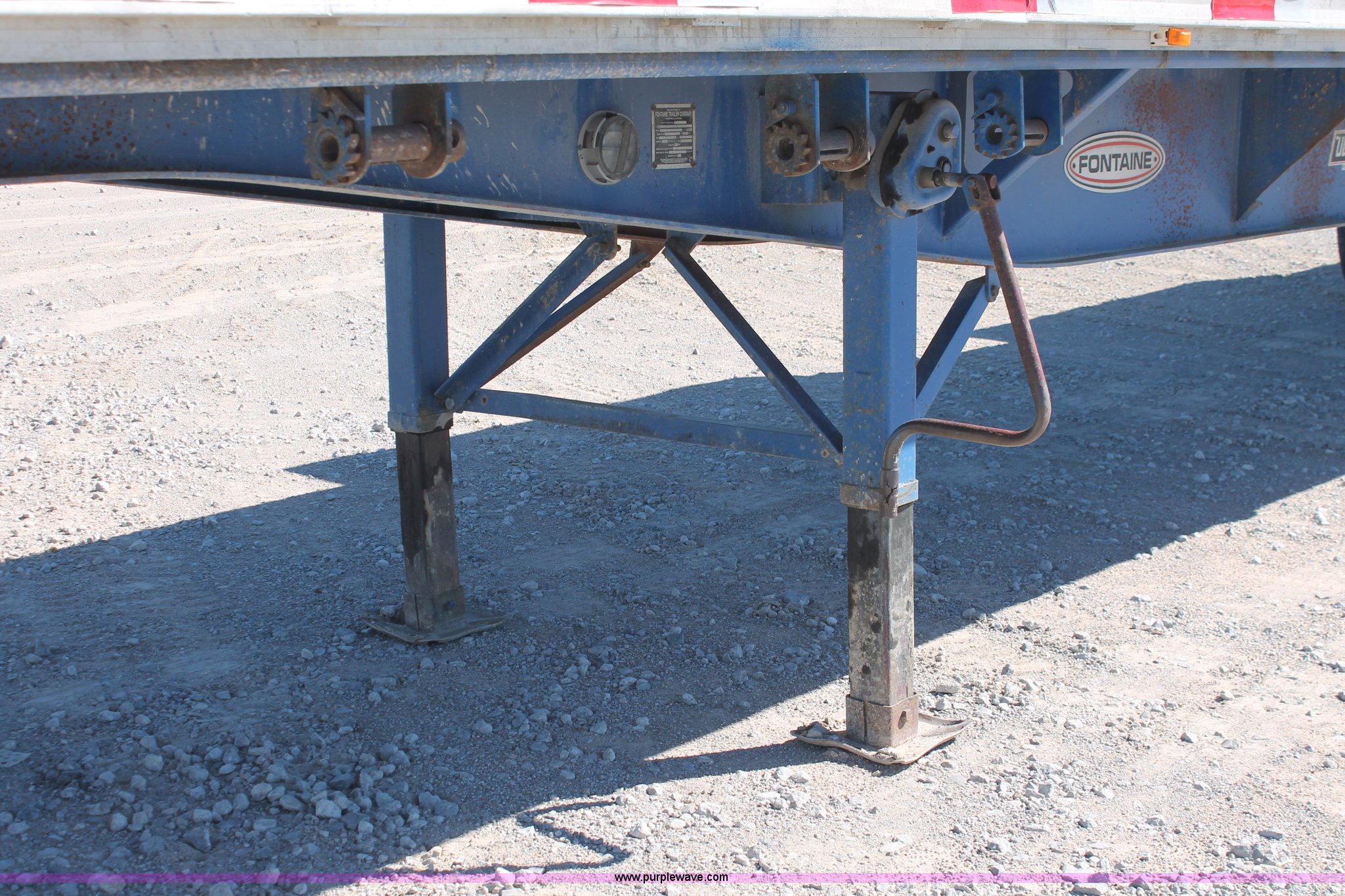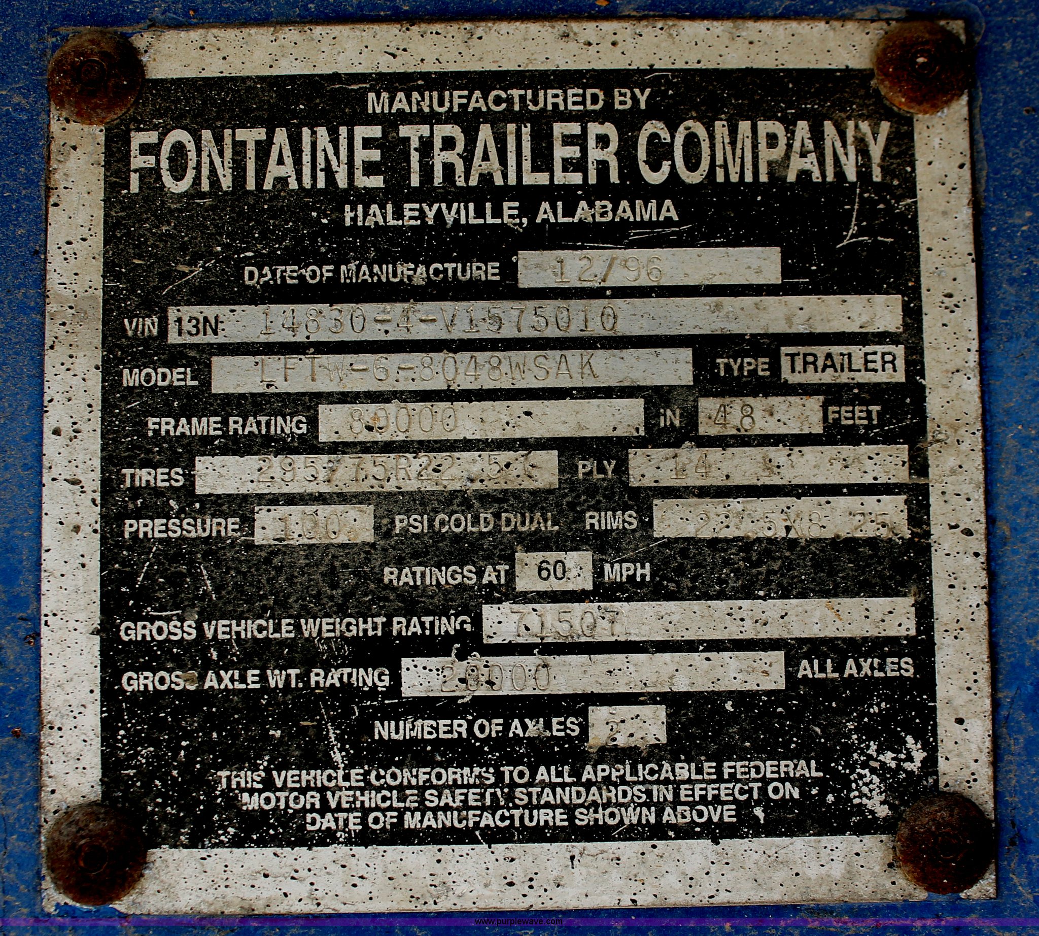 Purple Wave is selling a used Flat or Drop Deck Trailer in Oklahoma. This item is a 1997 Fontaine LFTN-6-8048WSAK flatbed spread axle trailer with the following: 10' axle spread, 96"W, Steel frame, Wood and aluminum deck, Stake side pockets, Manual landing gear, Trailer wiring, Air suspension, Air brakes, 11R24.5 tires, GVWR 80,000 lbs, GAWR 20,000 lbs, TDI 601