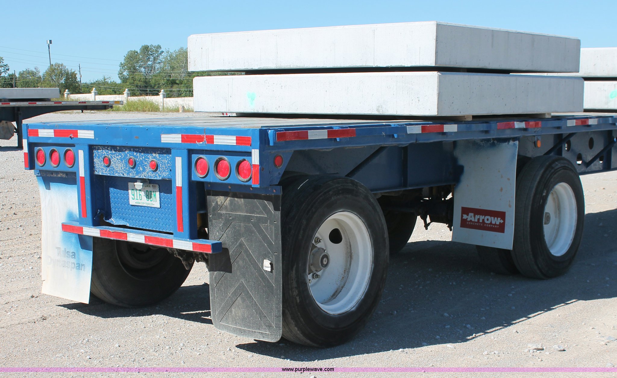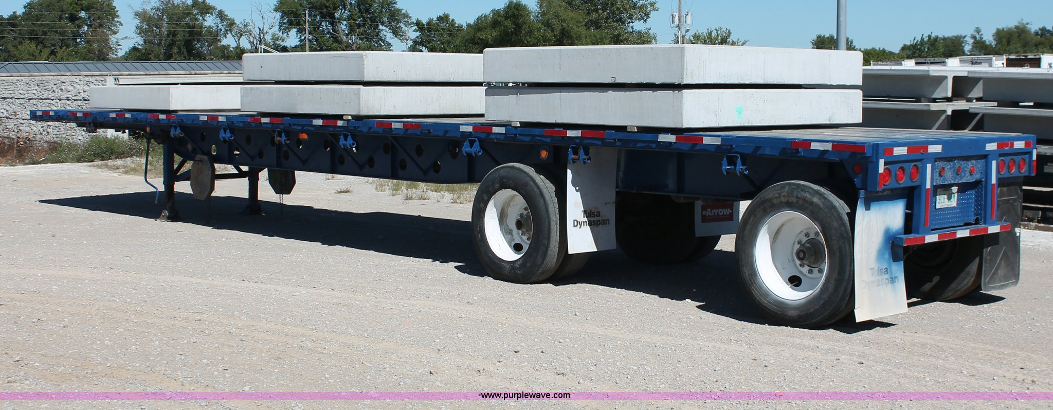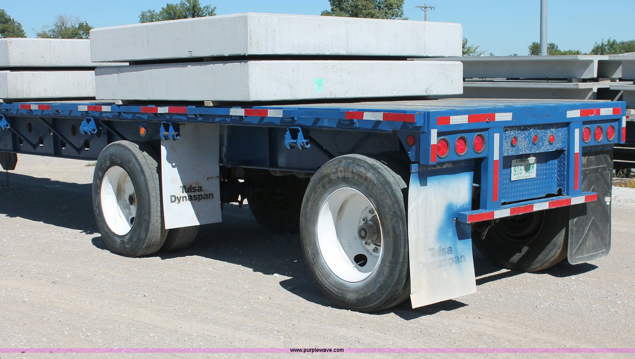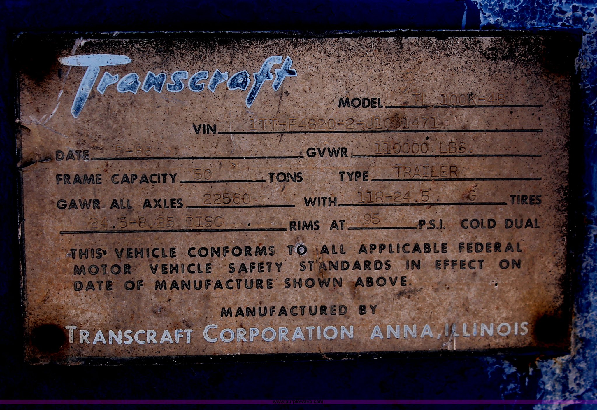 Purple Wave is selling a used Flat or Drop Deck Trailer in Oklahoma. This item is a 1988 Transcraft TL-100K-48 flatbed spread axle trailer with the following: 10' axle spread, 96"W, Steel frame, Wood and aluminum deck, Stake side pockets, Manual landing gear, Trailer wiring, Air suspension, Air brakes, 11R22.5 tires, GVWR 110,000 lbs, 22,500 GAWR, TDI 688