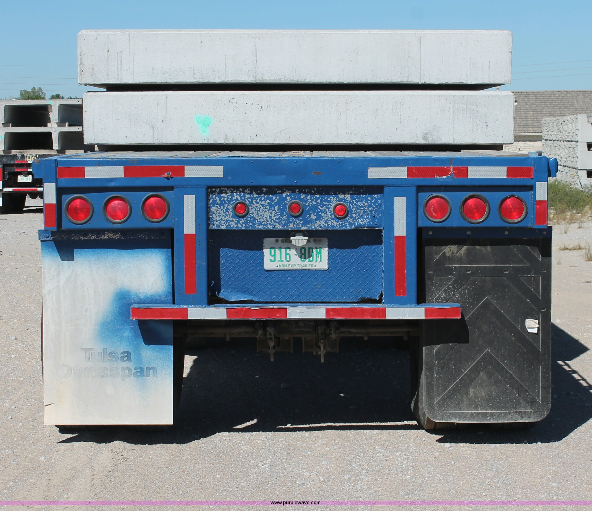 1988 Transcraft TL-100K-48 flatbed spread axle trailer. 10' axle spread, 96"W, Steel frame , Wood and aluminum deck, Stake side pockets, Manual landing gear, Trailer wiring, Air suspension, Air brakes, 11R22.5 tires, GVWR 110,000 lbs, 22,500 GAWR, TDI 688. Contents not included. 1TTF48202J1031471. Tulsa Dynaspan, Inc.. 1601 E Houston Street. Broken Arrow, OK 74012