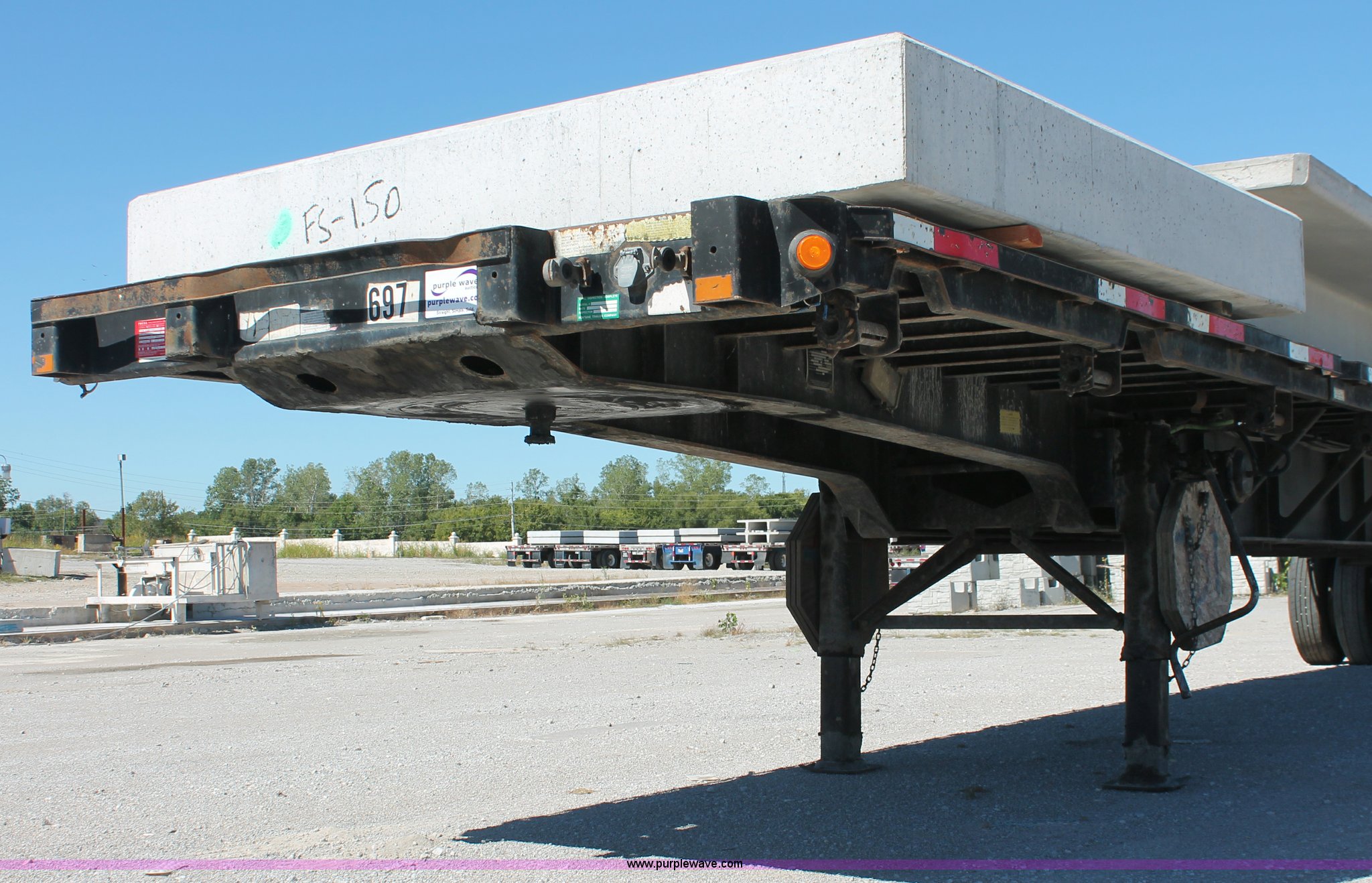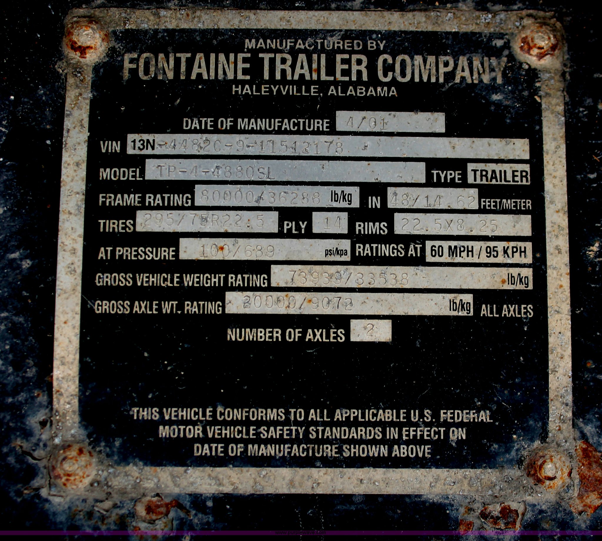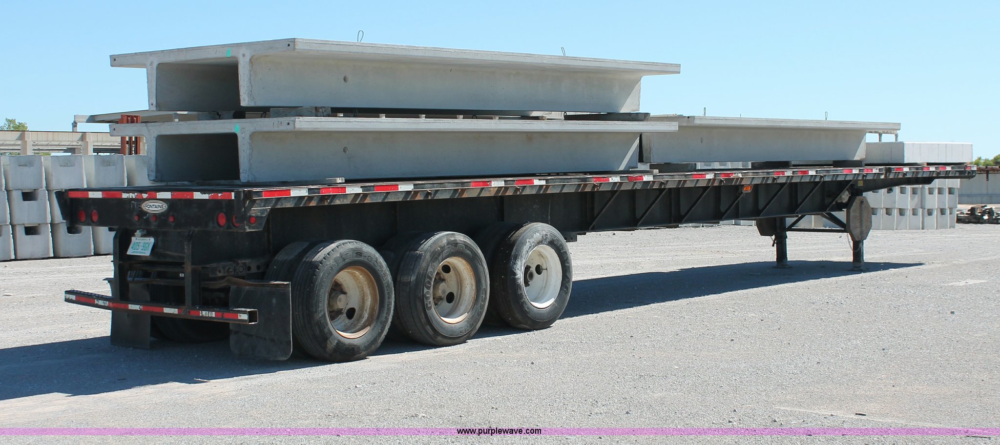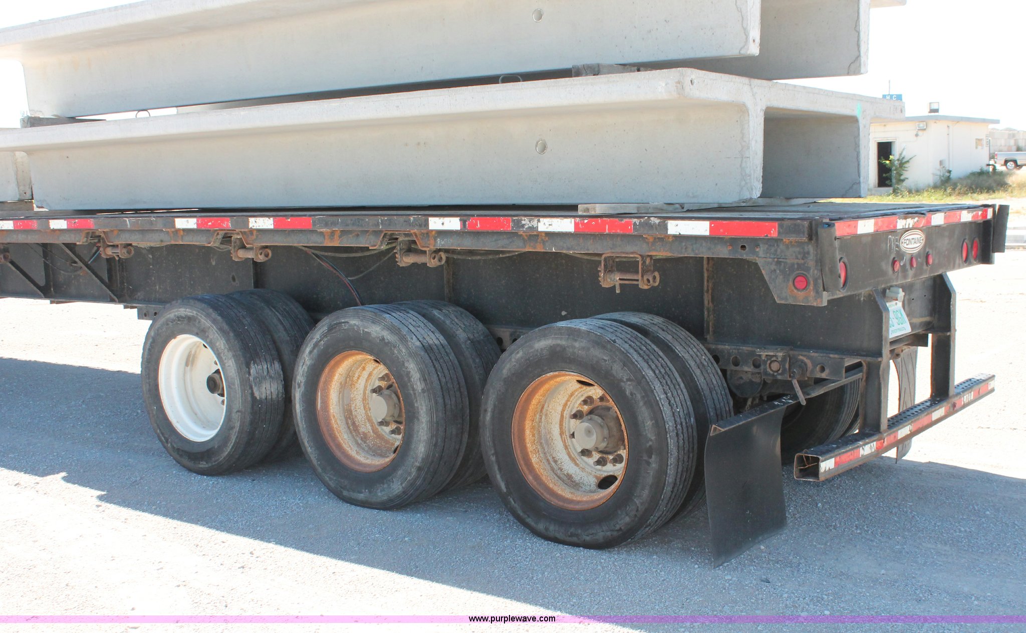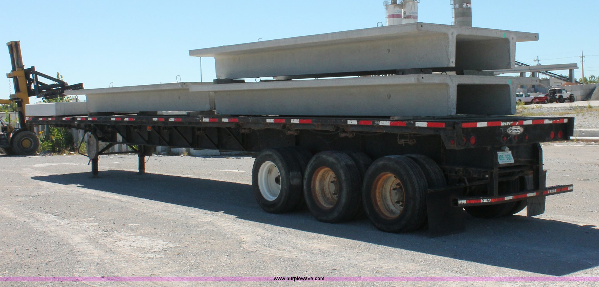Purple Wave is selling a used Flat or Drop Deck Trailer in Oklahoma. This item is a 2001 Fontaine TP-4-4880SL flatbed tri axle stretch trailer with the following: 96"W, Steel frame, Wood and aluminum deck, Stake side pockets, Manual landing gear, Trailer wiring, Spring suspension, Air brakes, 295/75R22.5 tires, GVWR 74,000 lbs, GAWR 20,000 lbs, TDI 697