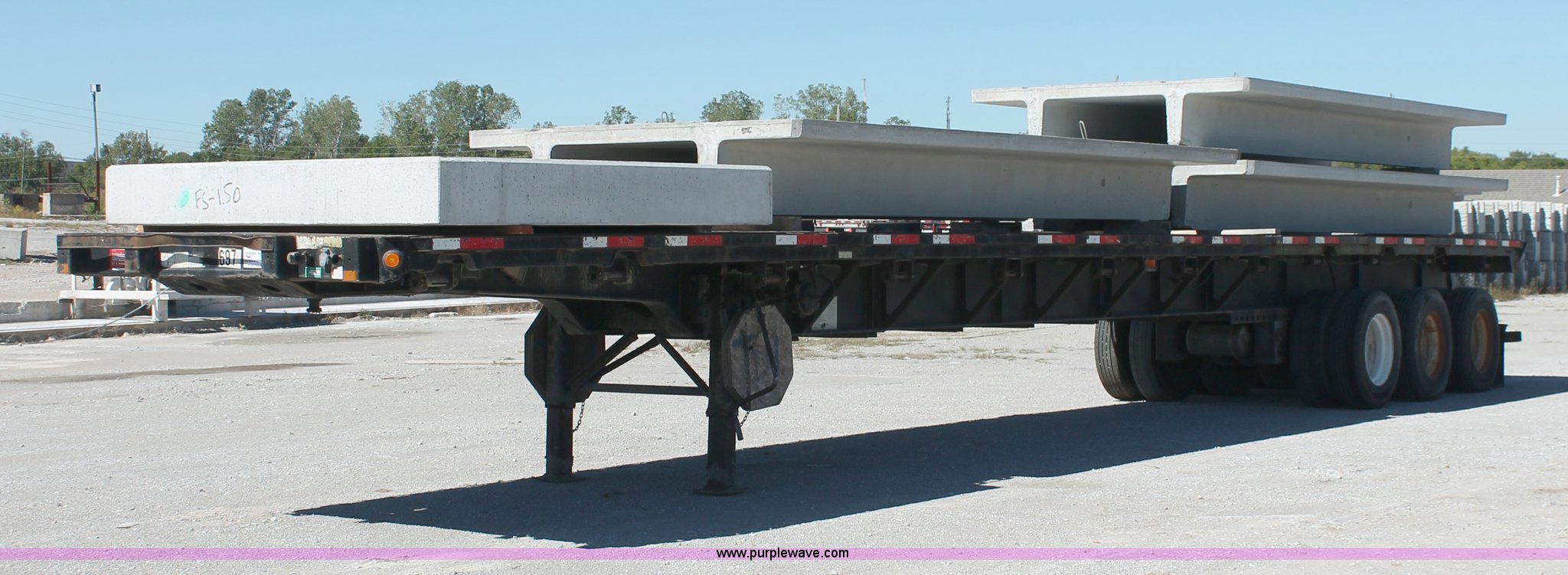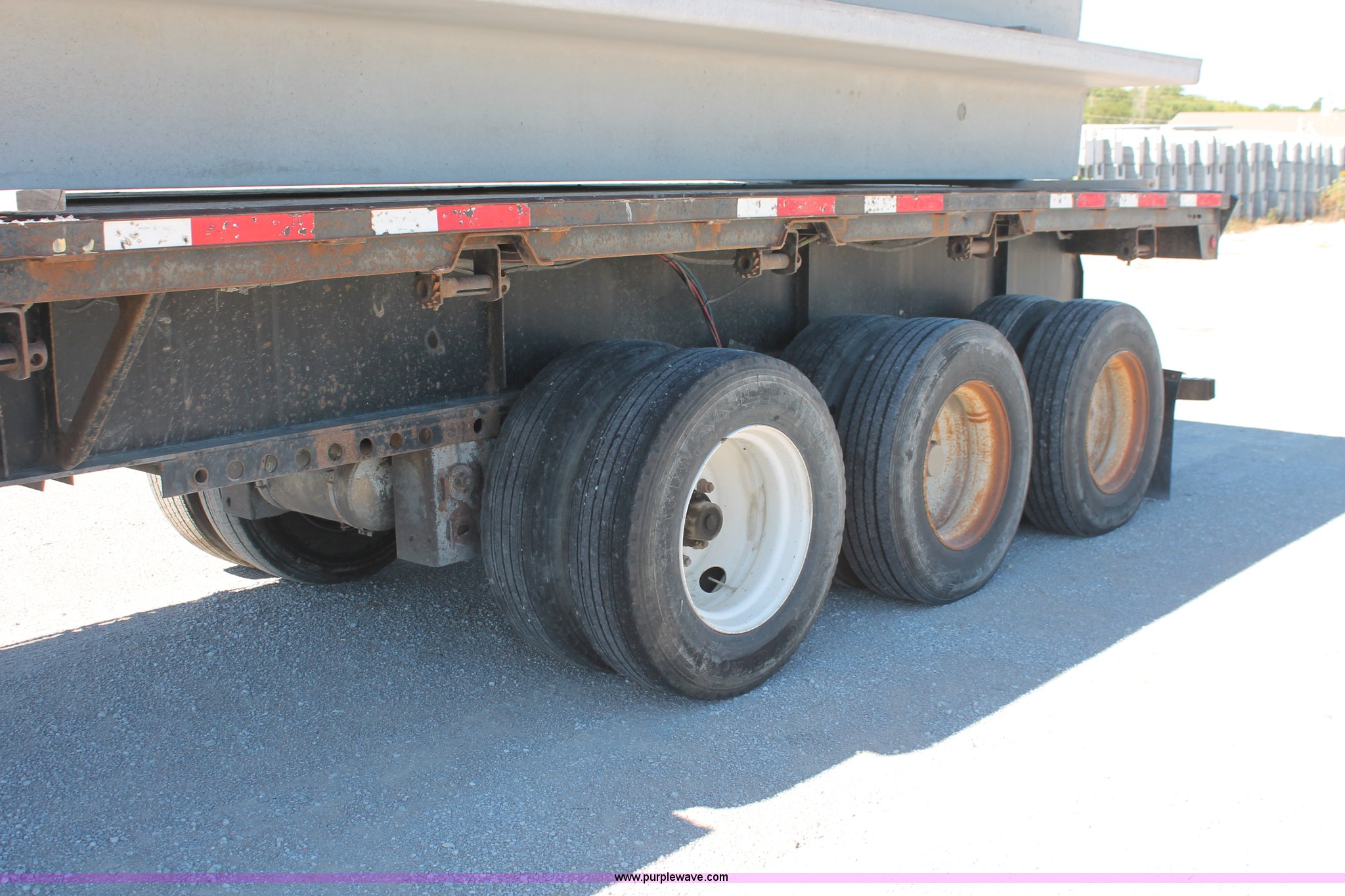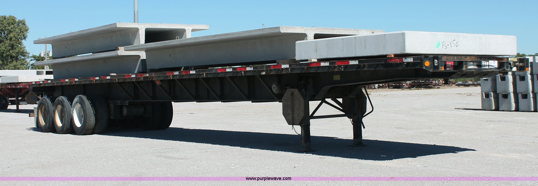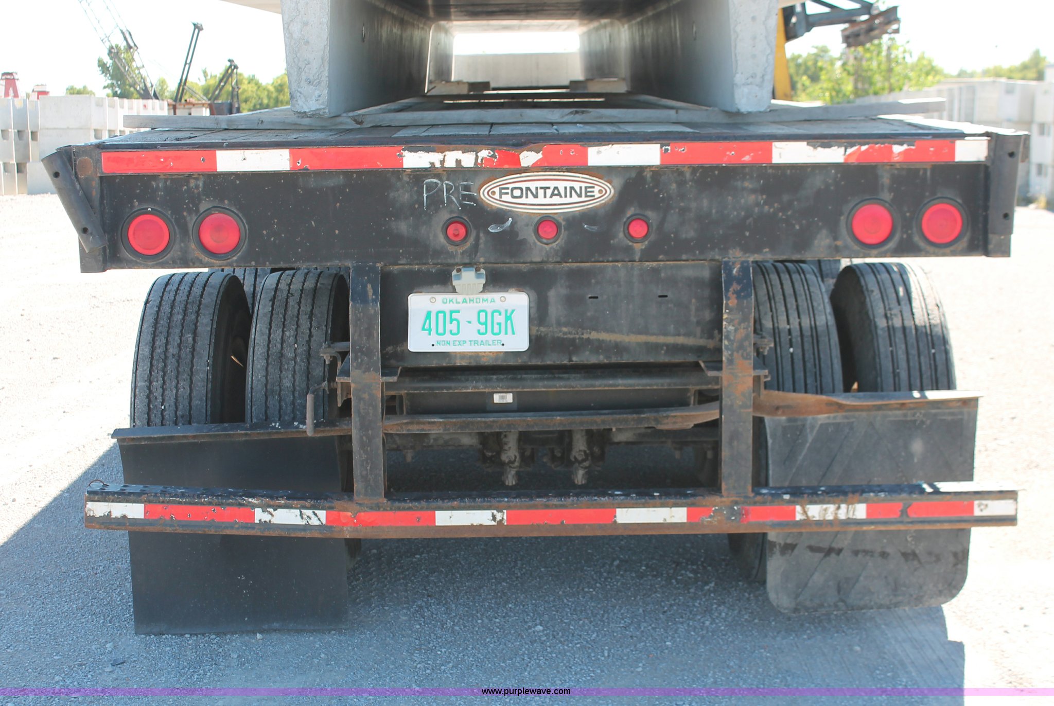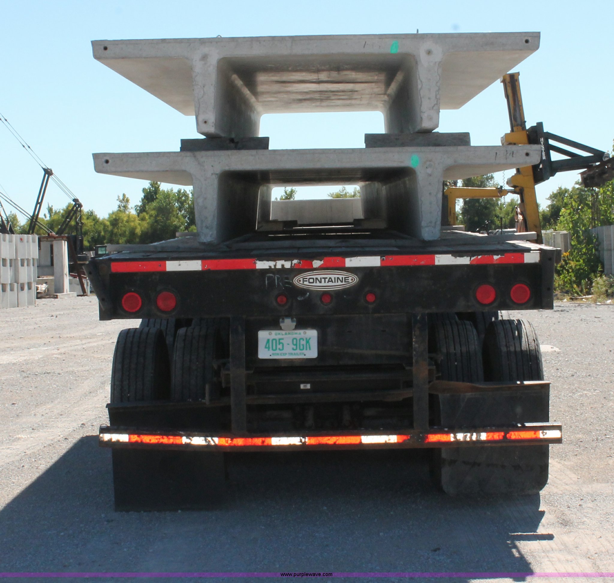 Purple Wave is selling a used Flat or Drop Deck Trailer in Oklahoma. This item is a 2001 Fontaine TP-4-4880SL flatbed tri axle stretch trailer with the following: 96"W, Steel frame, Wood and aluminum deck, Stake side pockets, Manual landing gear, Trailer wiring, Spring suspension, Air brakes, 295/75R22.5 tires, GVWR 74,000 lbs, GAWR 20,000 lbs, TDI 697