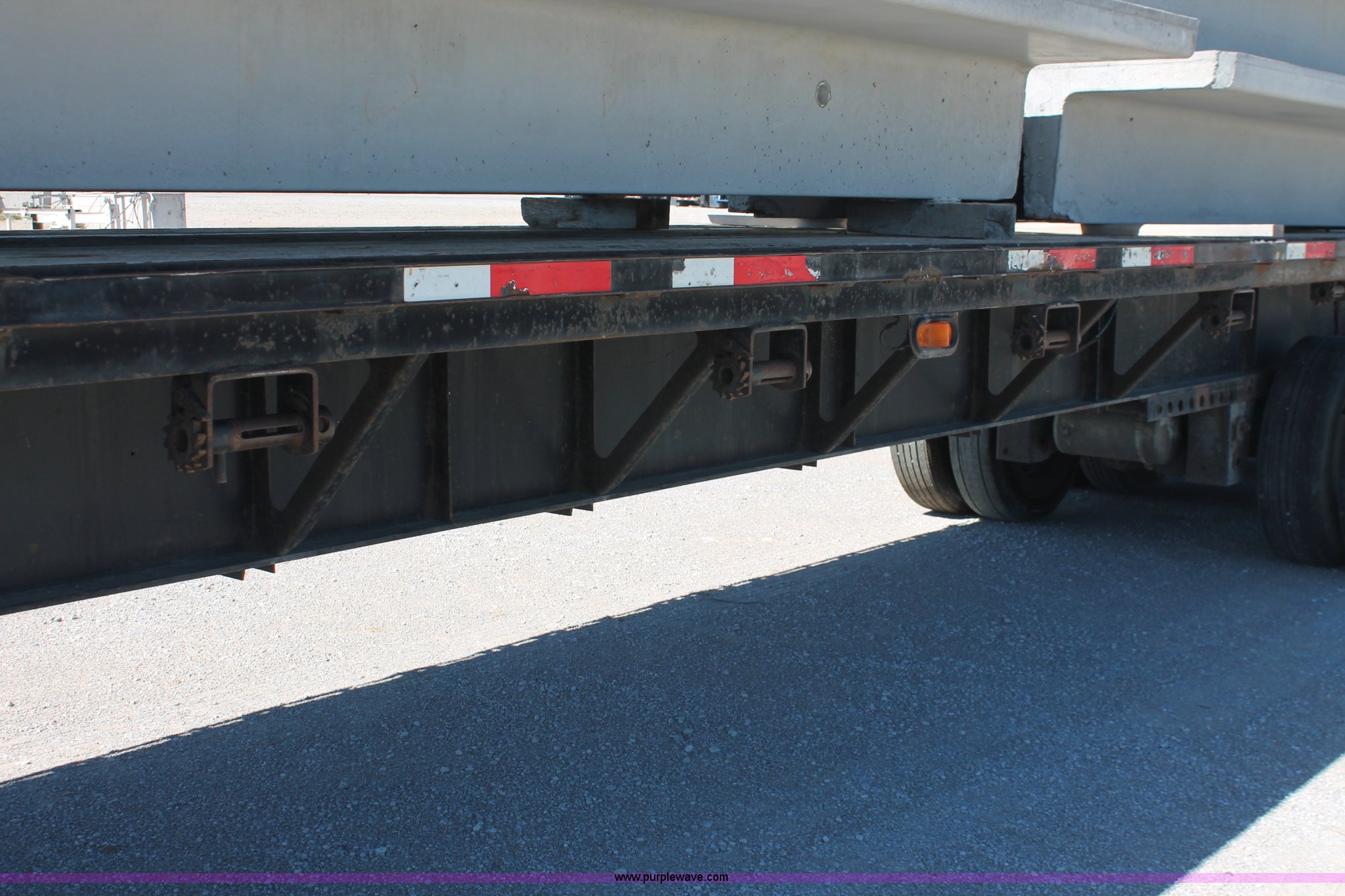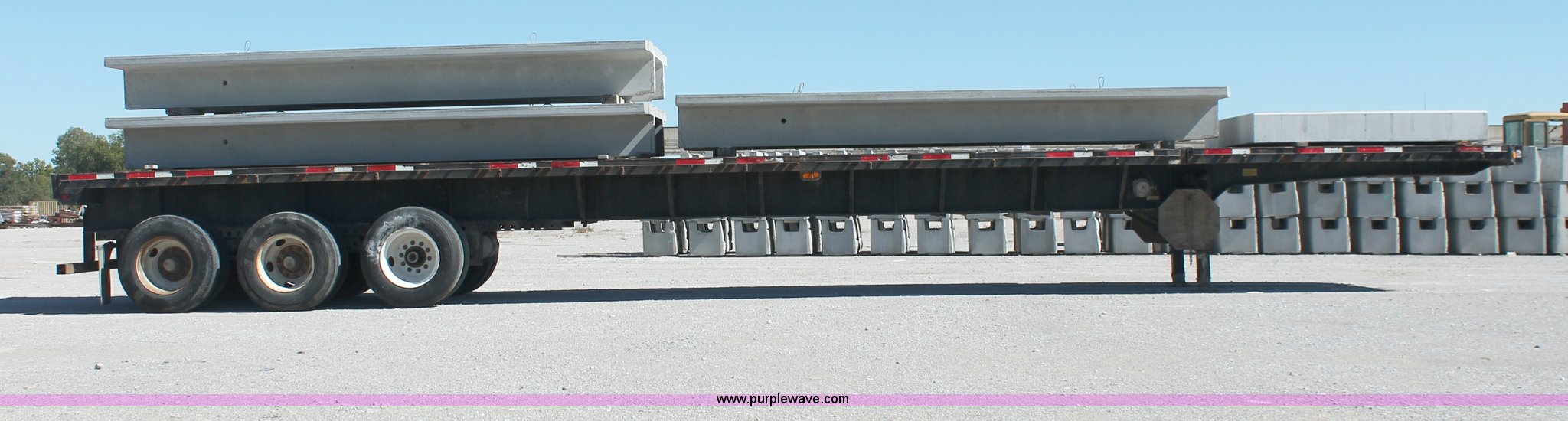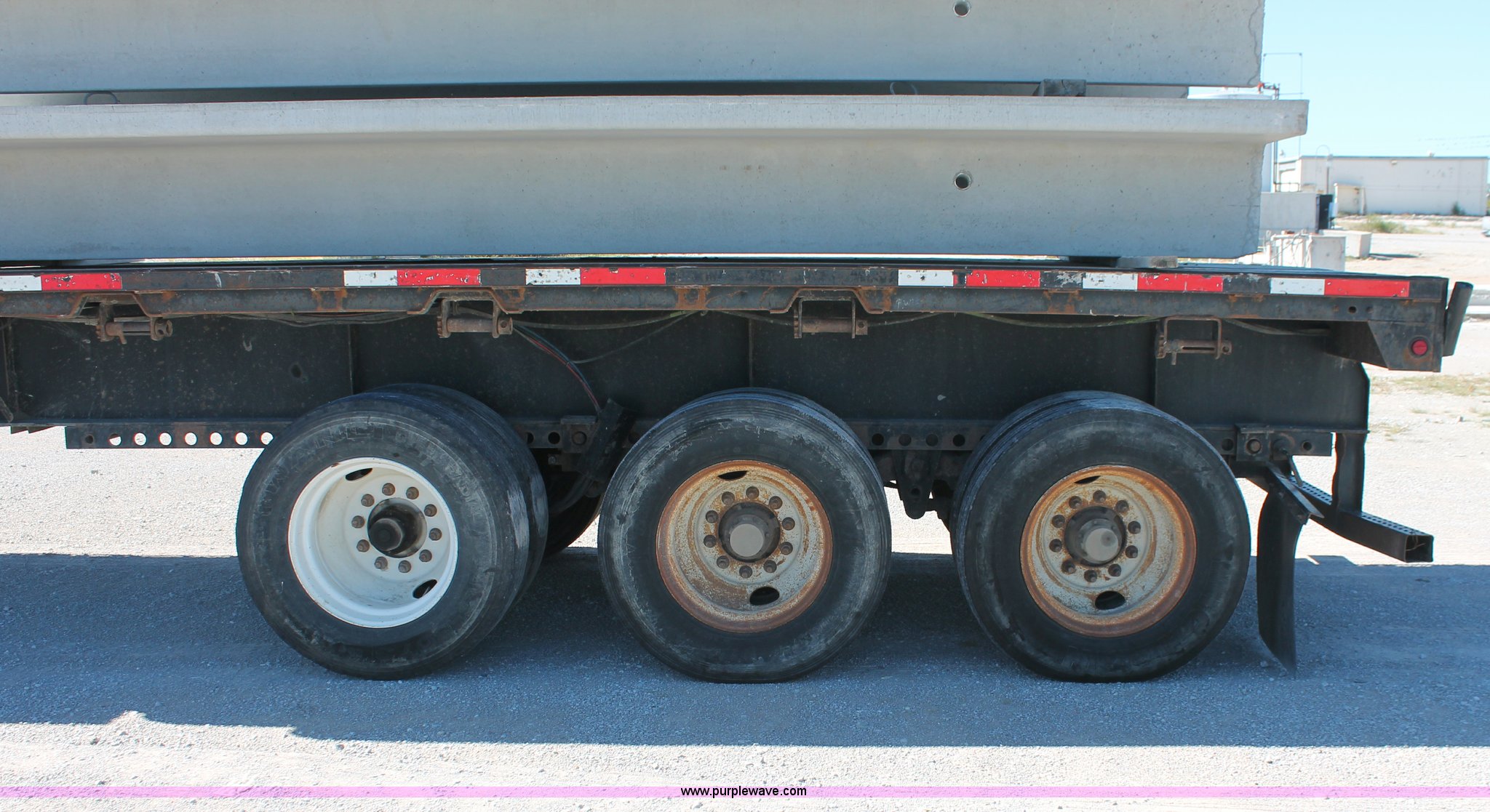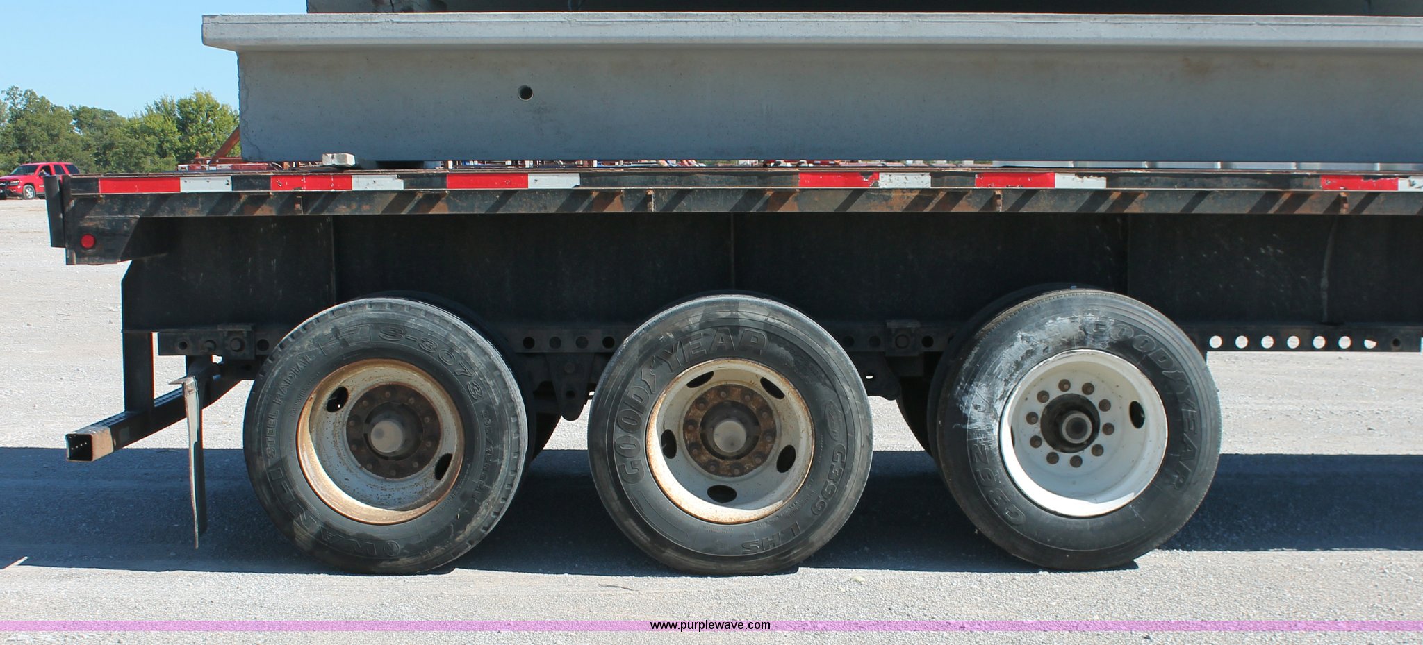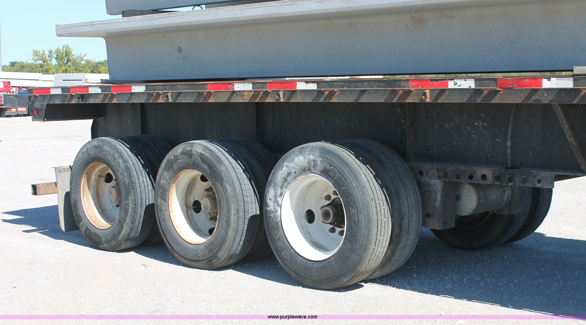 Purple Wave is selling a used Flat or Drop Deck Trailer in Oklahoma. This item is a 2001 Fontaine TP-4-4880SL flatbed tri axle stretch trailer with the following: 96"W, Steel frame, Wood and aluminum deck, Stake side pockets, Manual landing gear, Trailer wiring, Spring suspension, Air brakes, 295/75R22.5 tires, GVWR 74,000 lbs, GAWR 20,000 lbs, TDI 697