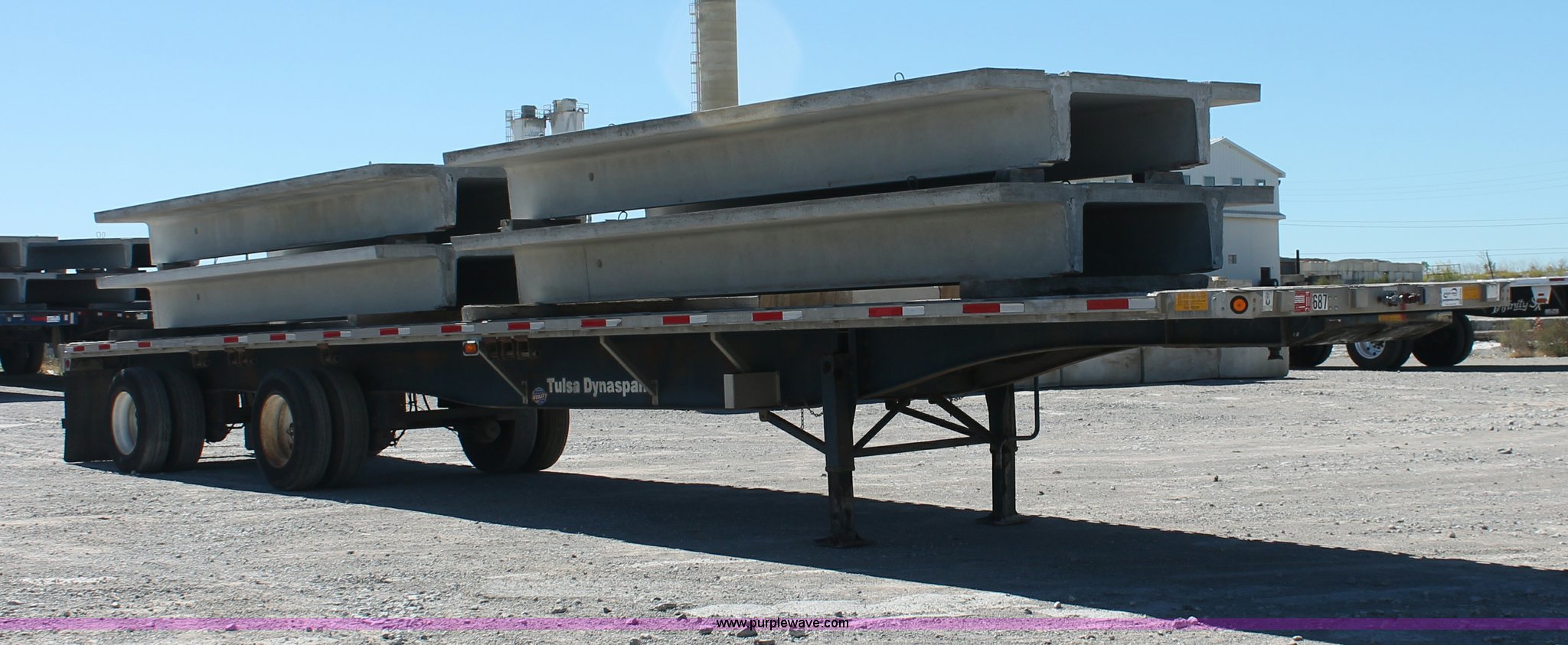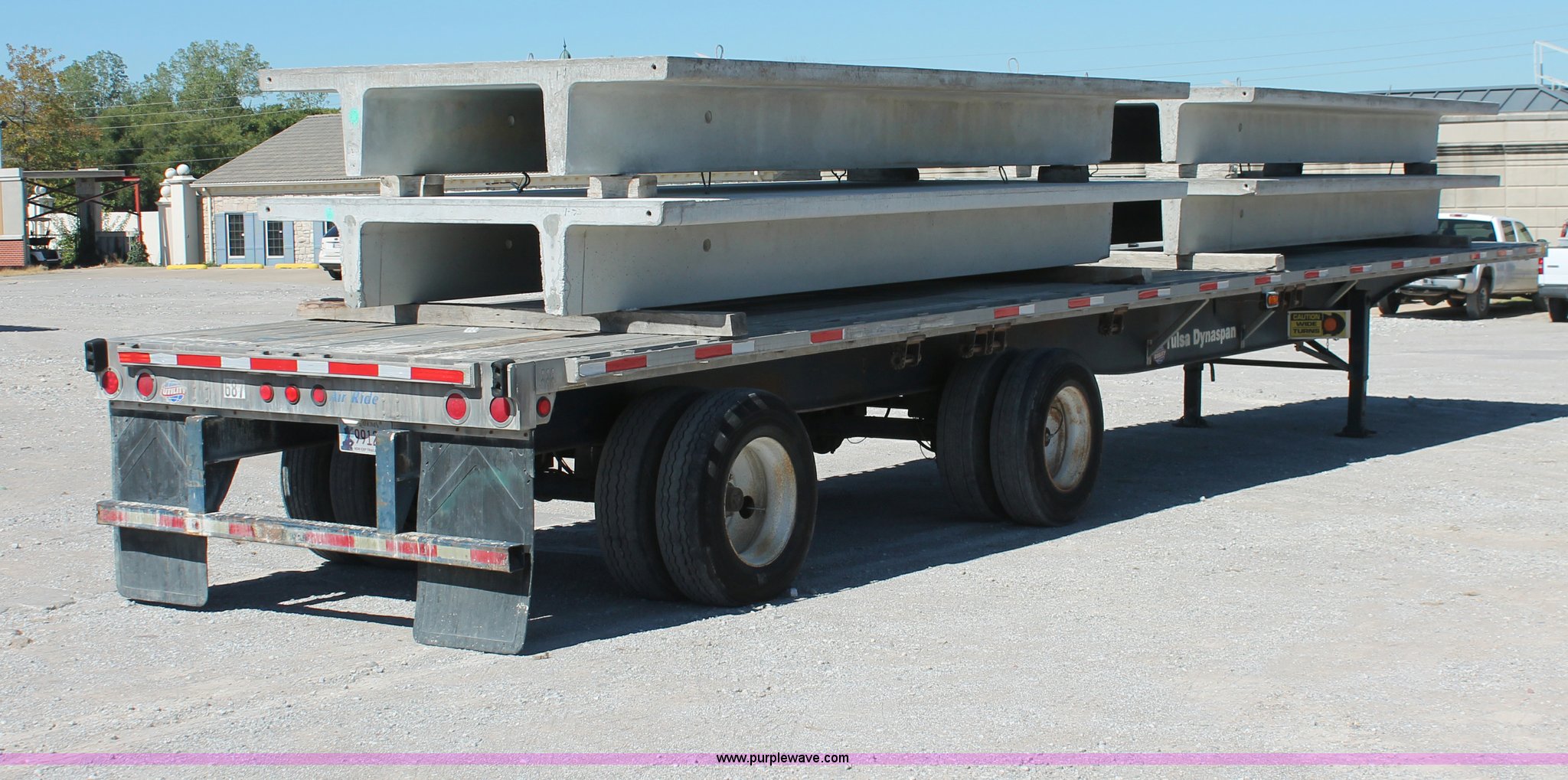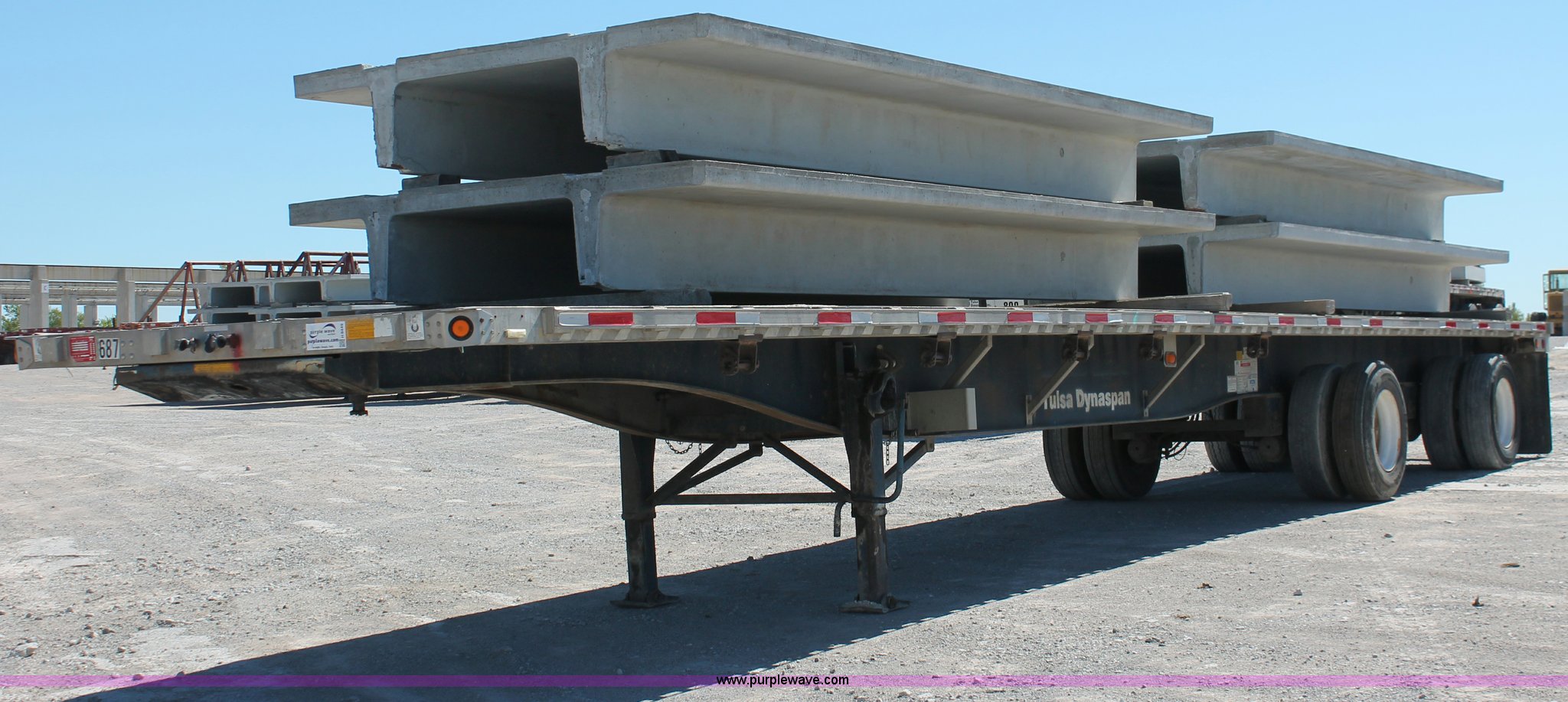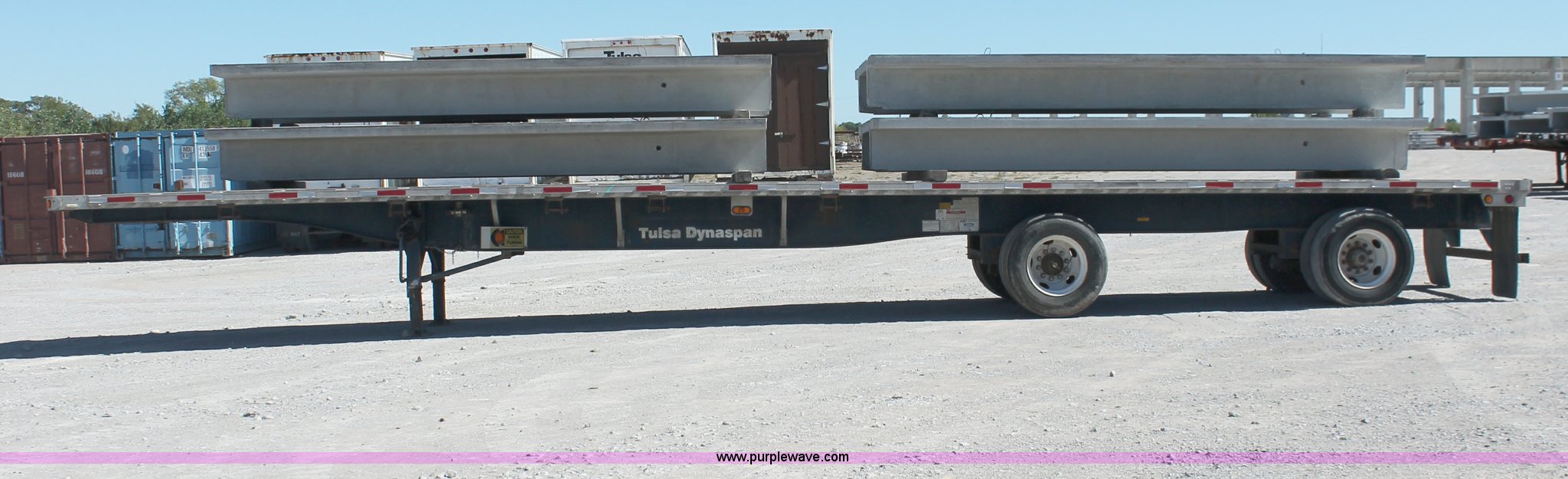2000 Utility flatbed spread axle float trailer. 10' spread, 102"W, Steel frame , Wood and aluminum deck, Stake side pockets, Manual landing gear, Trailer wiring, Air suspension, Air brakes, 295/75R22.5 tires, GVWR 80,000 lbs, TDI 687. Contents not included. 1UYFS2482YA317110. Tulsa Dynaspan, Inc.. 1601 E Houston Street. Broken Arrow, OK 74012