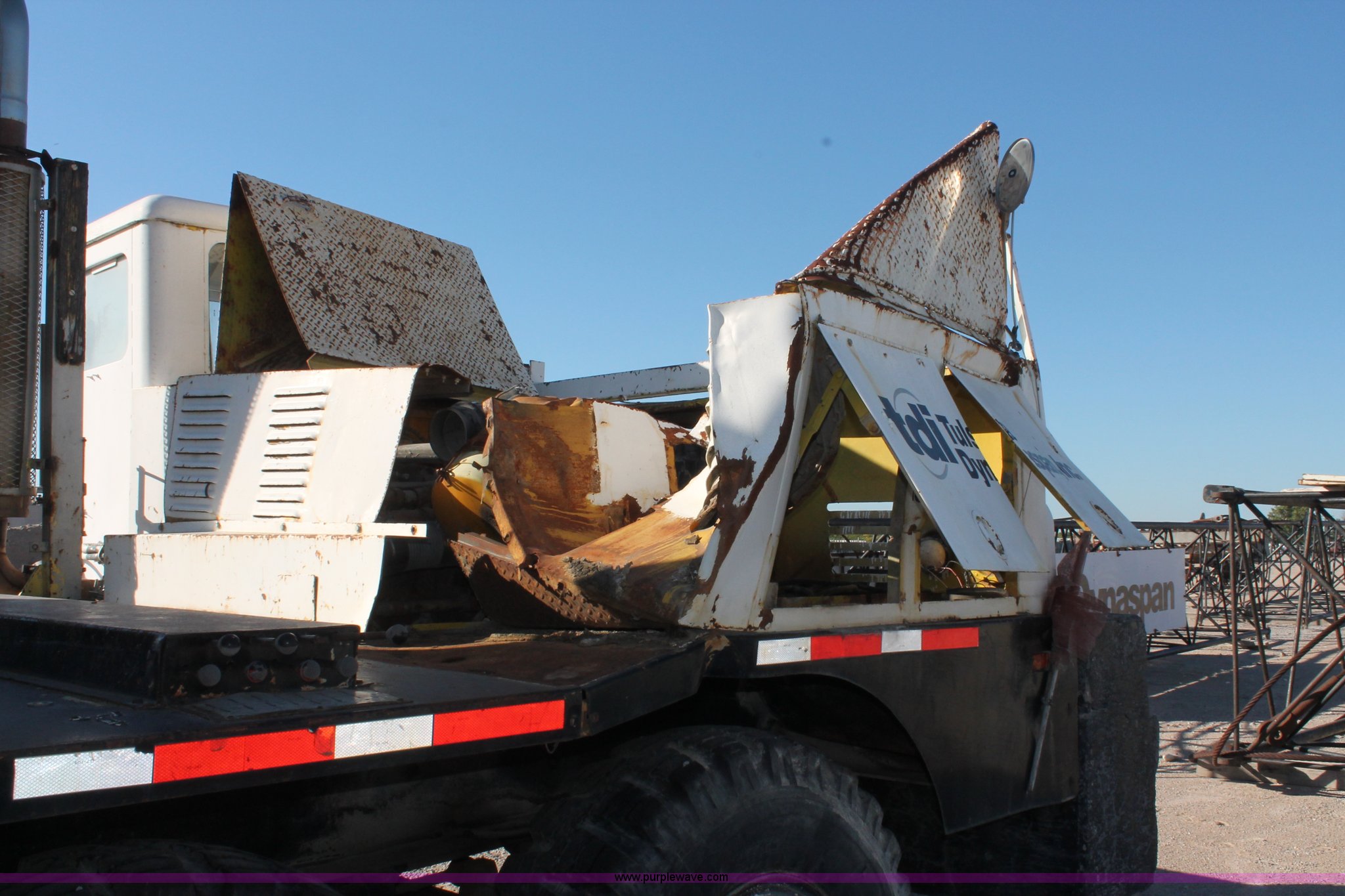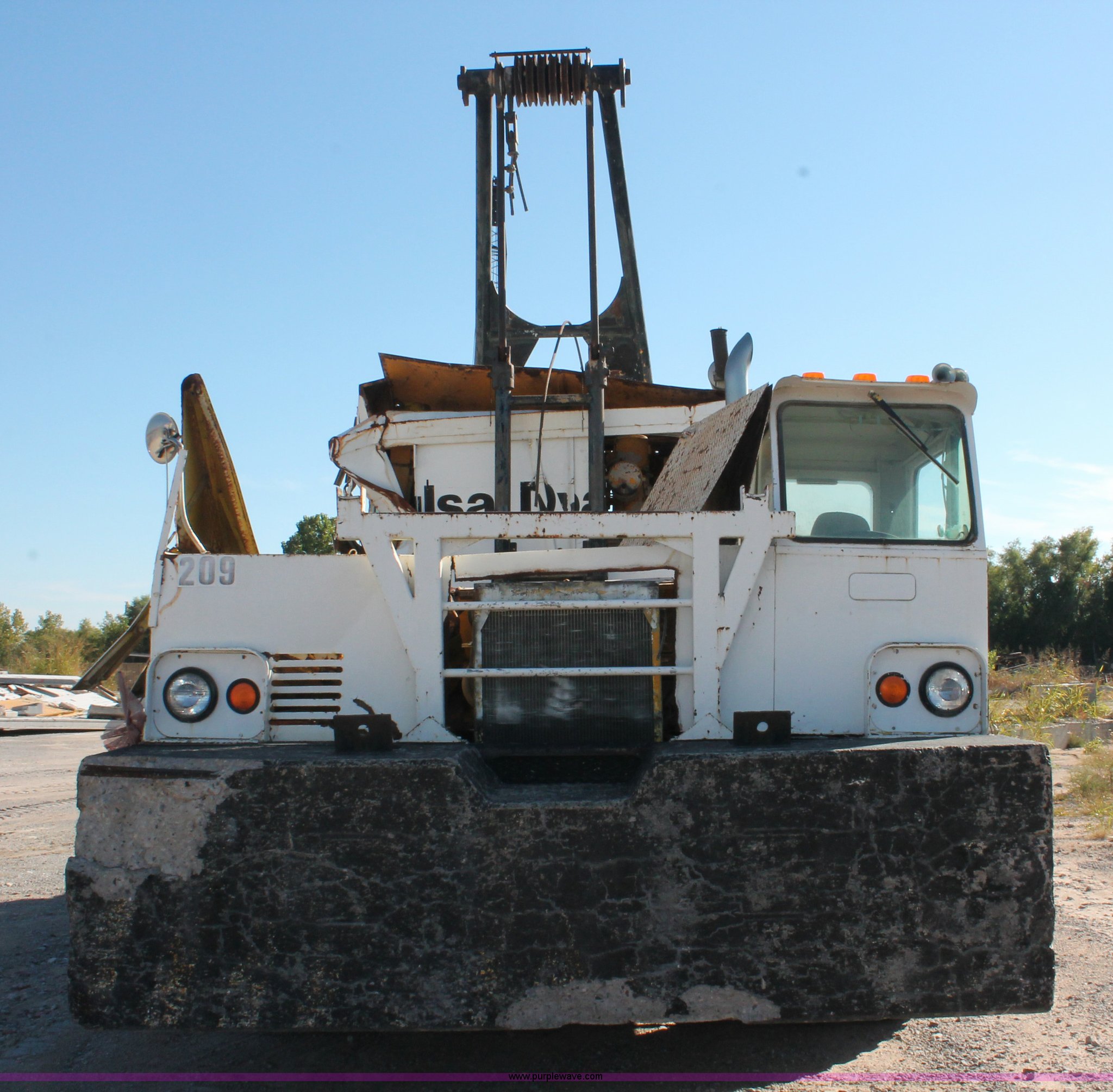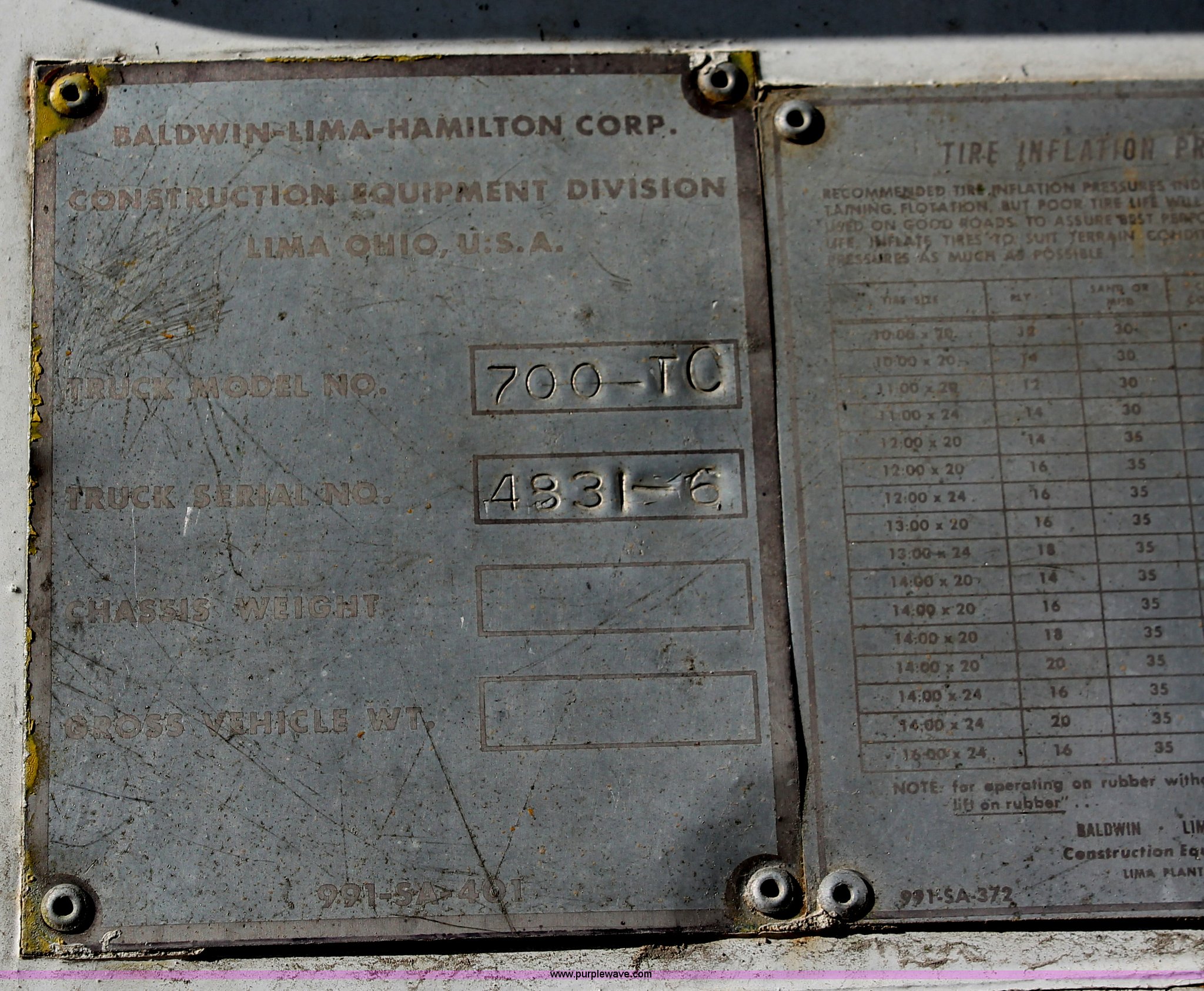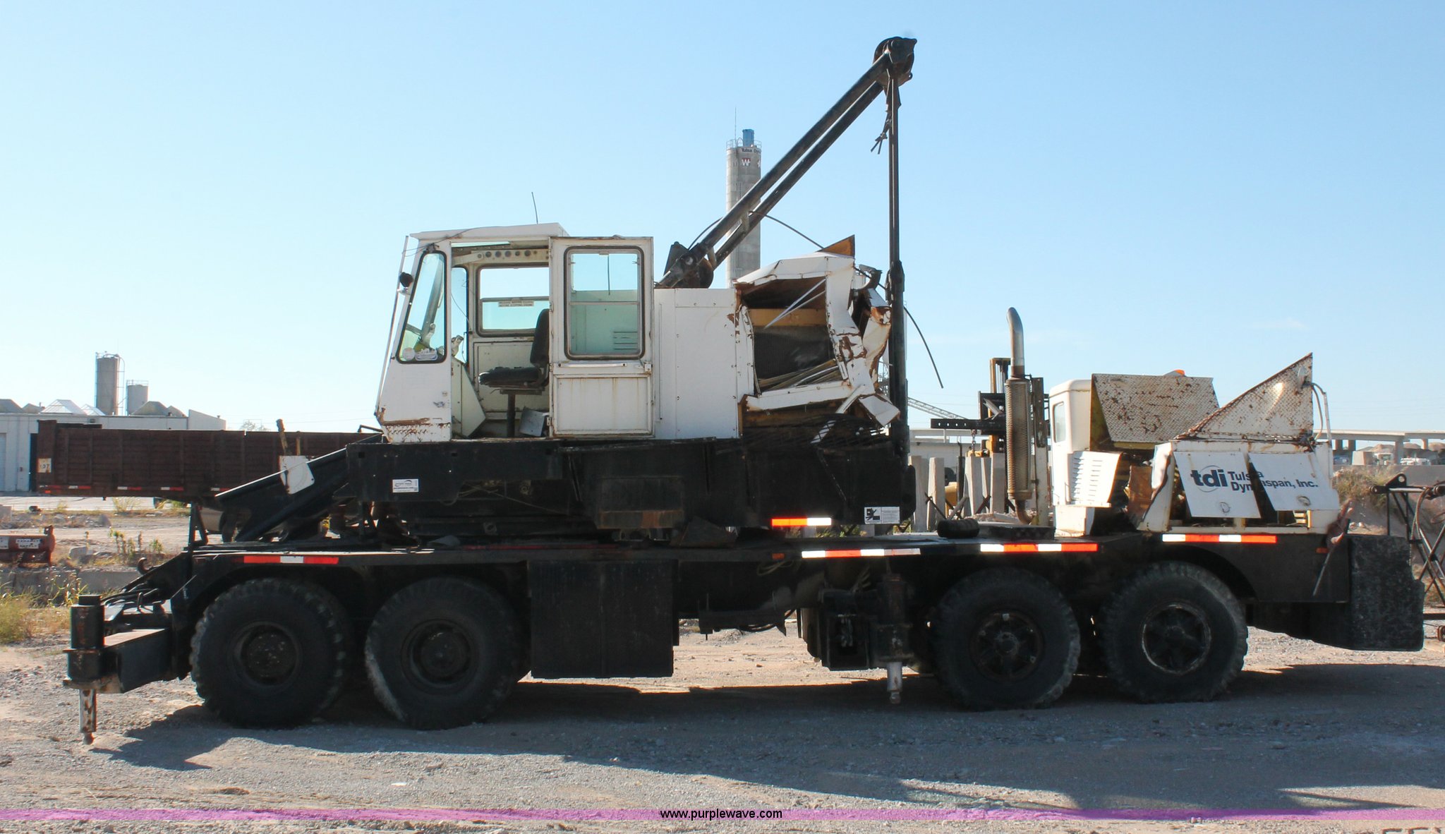 Purple Wave is selling a used Truck Crane in Oklahoma. This item is a 1972 Lima 700-TC lattice boom truck crane with the following: 9,726 miles on odometer, Cummins six cylinder diesel engine, Five speed manual transmission, Four speed auxiliary transmission, Locking differential, Jake Brake, PTO, Air brakes, Bostrom 715E seat, 75 ton crane capacity, Cummins H743P160 six cylinder diesel engine, Serial 779535, Five stick hydraulic control, Front drum, rear drum, boom, and swivel controls, 270 degrees of rotation, (3) lattice boom sections, 40', 30', and 20' respectively, Counter weight, Assorted cables, Dual eight stick hydraulic outriggers, Partially disassembled,, Single rear exhaust stack, Front counter weight, 14.00-20 tires, Interior/exterior cosmetic damage, Roll over damage, Unknown operating condition, Serial 36026L1MA, TDI 209