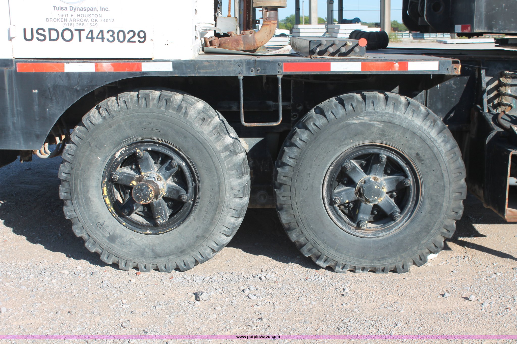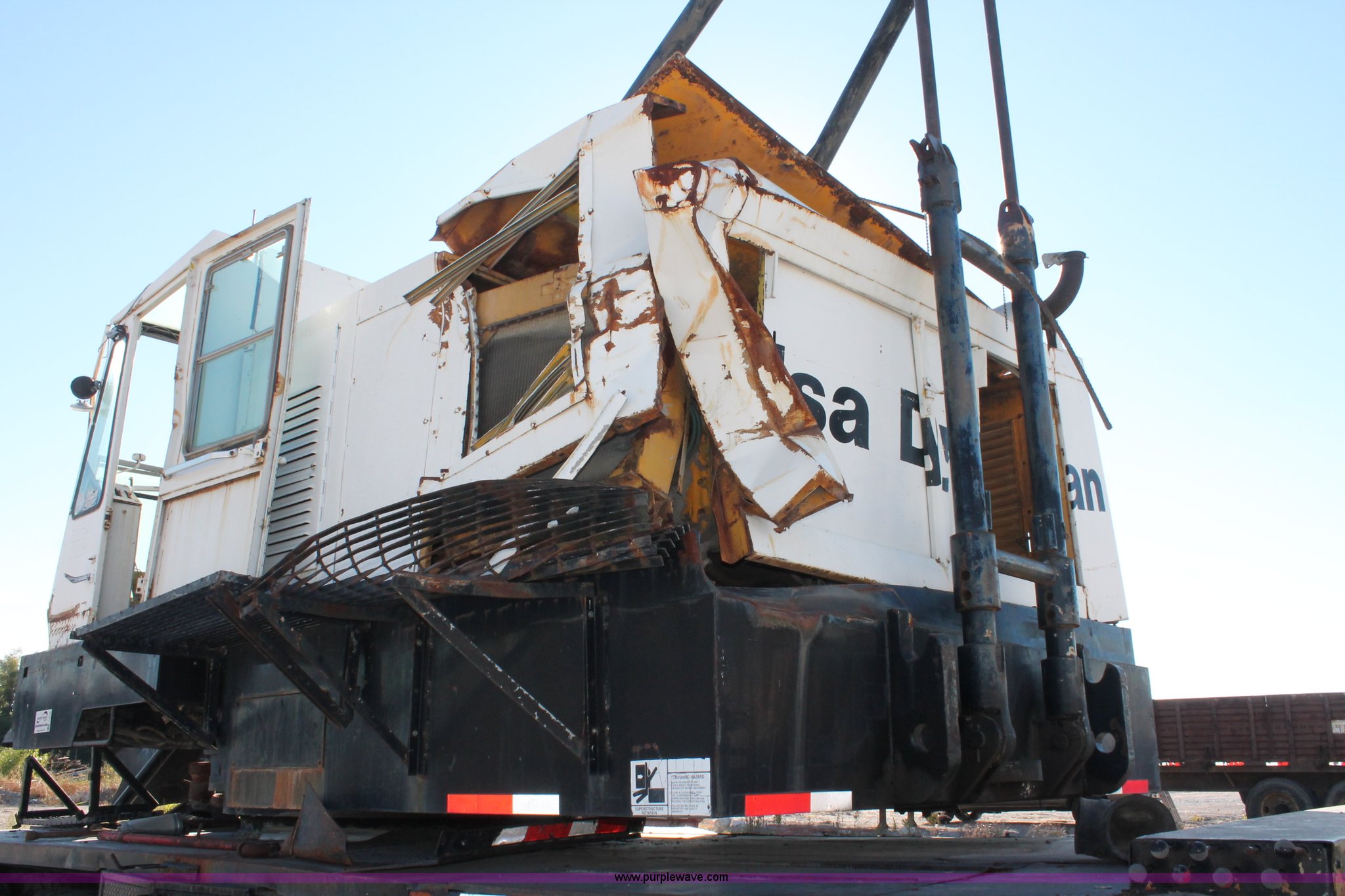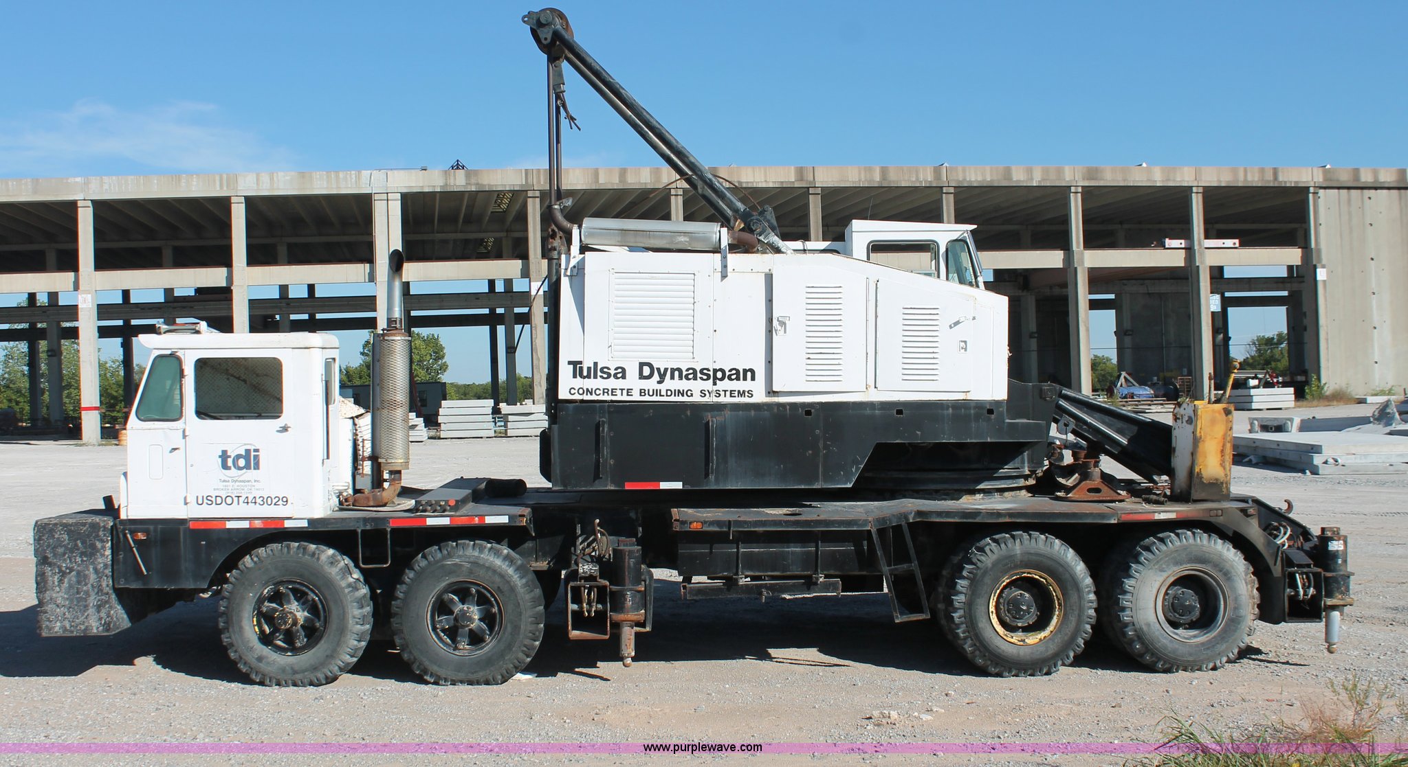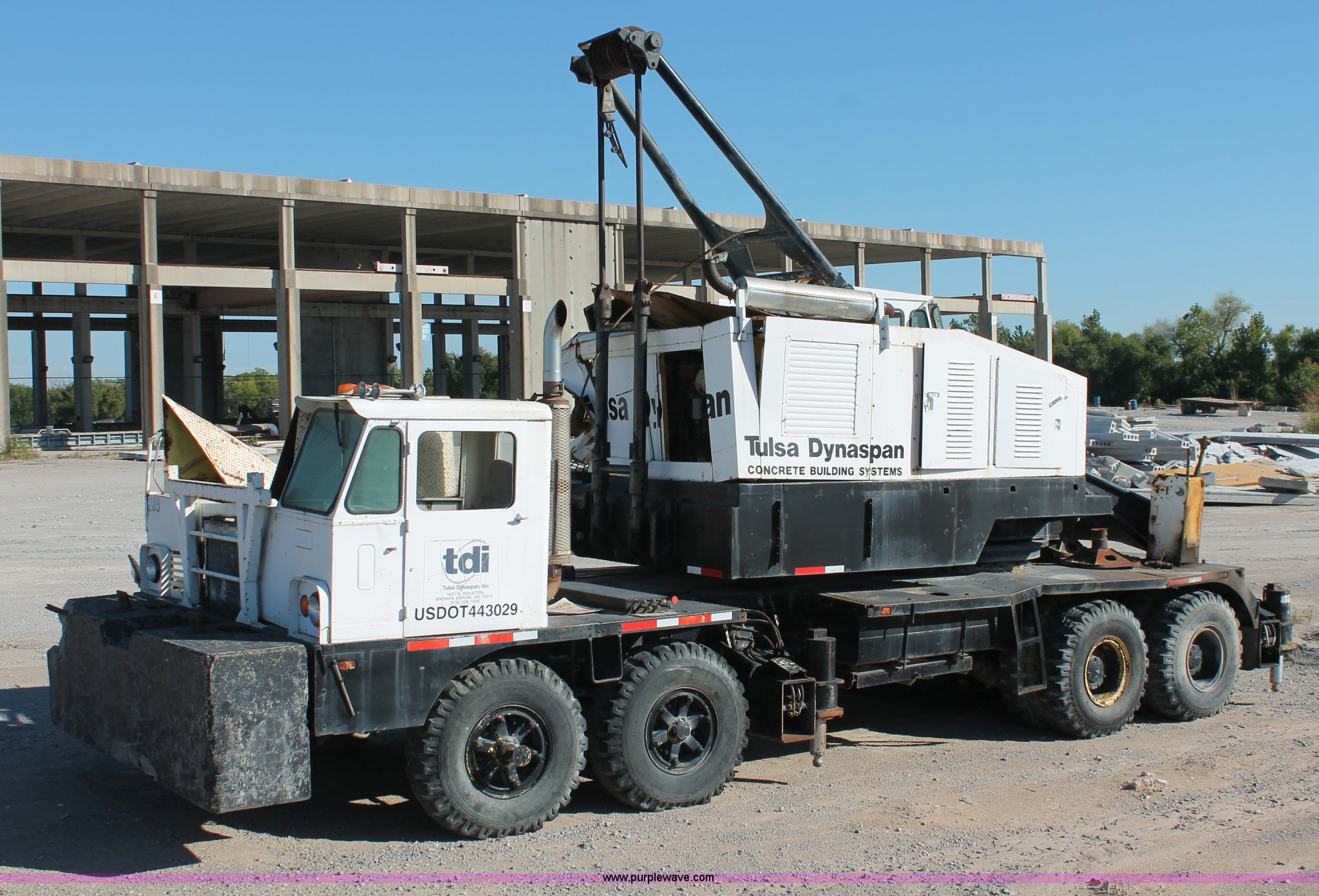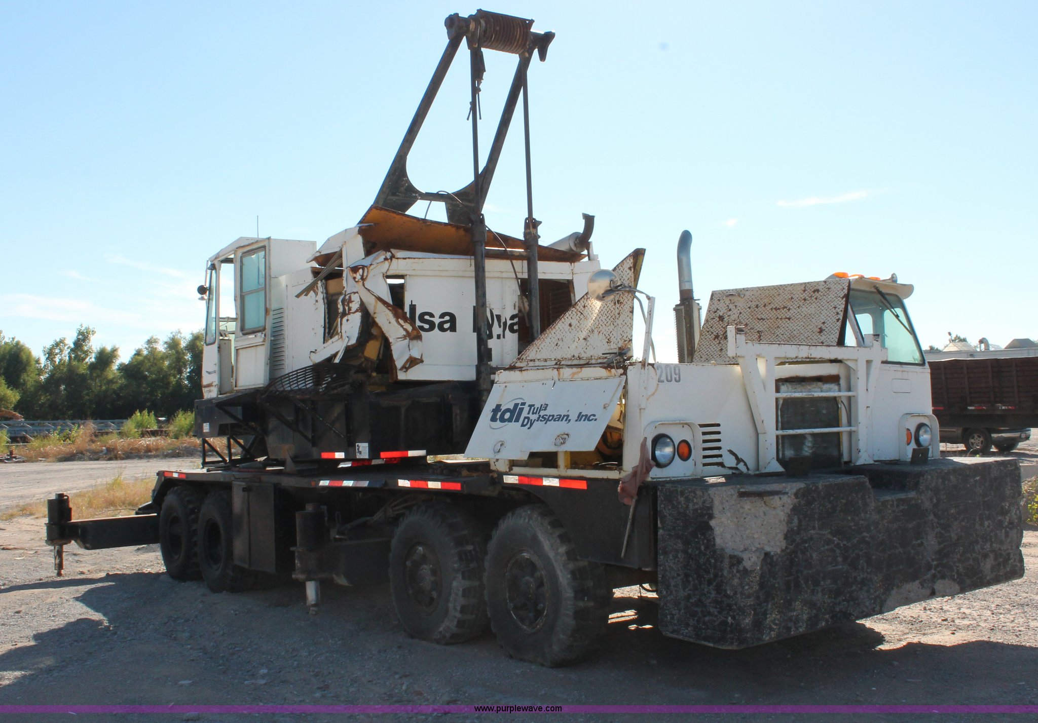 1972 Lima 700-TC lattice boom truck crane. 9,726 miles on odometer, Cummins six cylinder diesel engine, Five speed manual transmission, Four speed auxiliary transmission, Locking differential, Jake Brake, PTO, Air brakes, Bostrom 715E seat, 75 ton crane capacity Cummins H743P160 six cylinder diesel engine Serial 779535, Five stick hydraulic control Front drum, rear drum, boom, and swivel controls, 270 degrees of rotation, (3) lattice boom sections 40', 30', and 20' respectively, Counter weight, Assorted cables, Dual eight stick hydraulic outriggers Partially disassembled, Single rear exhaust stack, Front counter weight, 14.00-20 tires, Interior/exterior cosmetic damage, Roll over damage, Unknown operating condition, Serial 36026L1MA, TDI 209. Tulsa Dynaspan, Inc.. 1601 E Houston Street. Broken Arrow, OK 74012