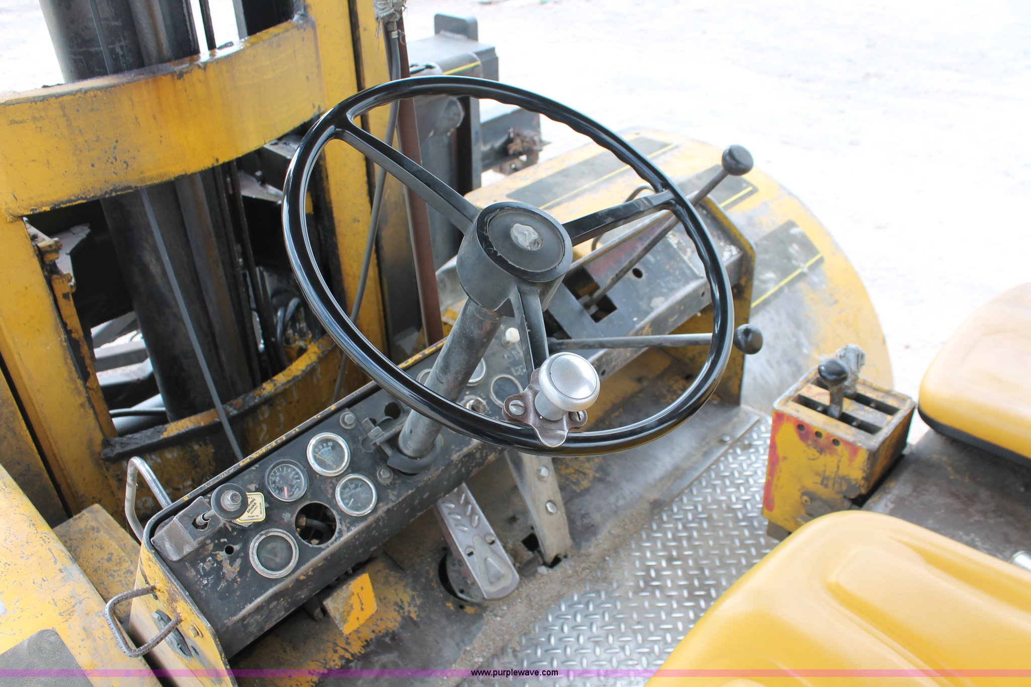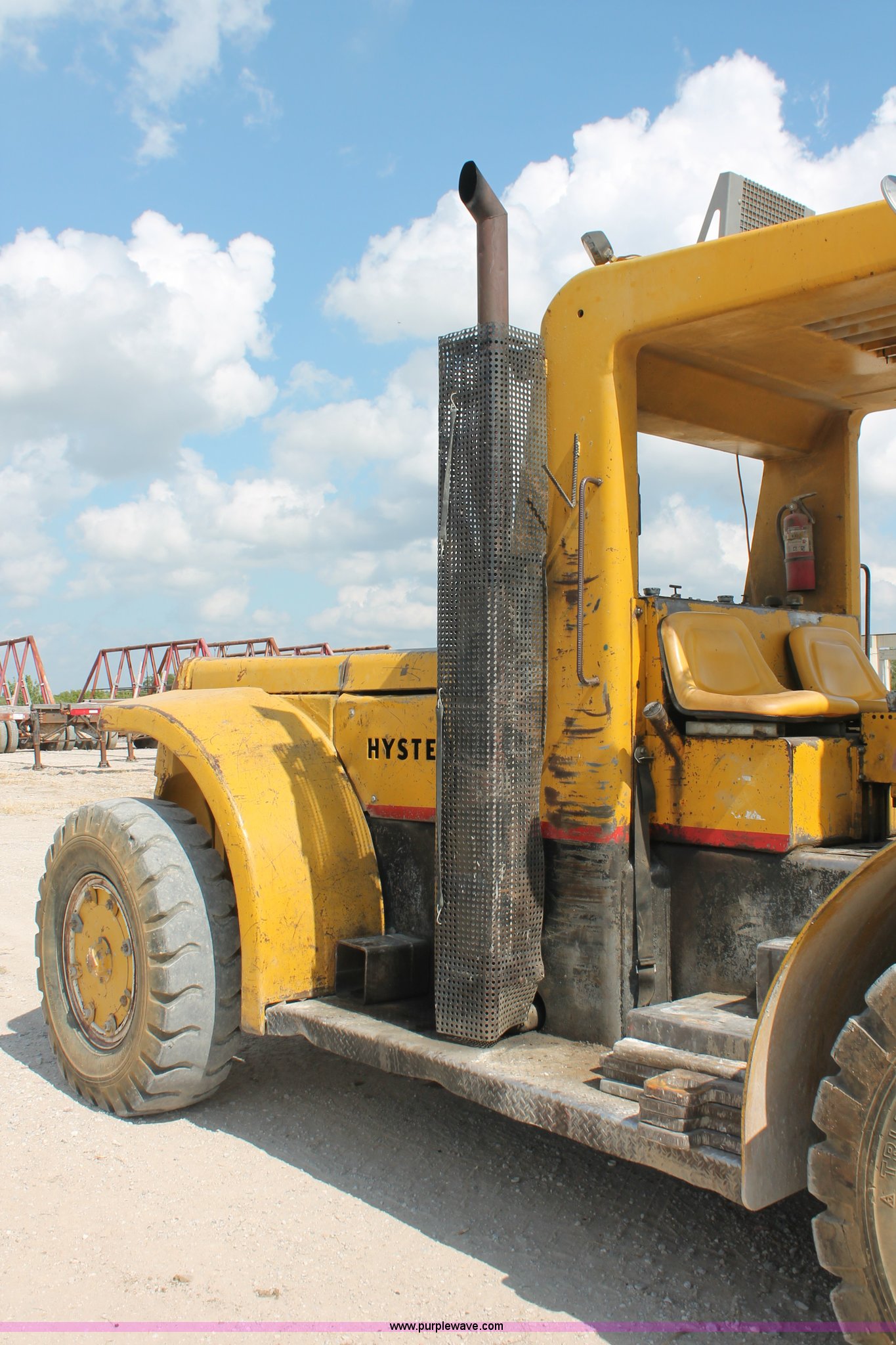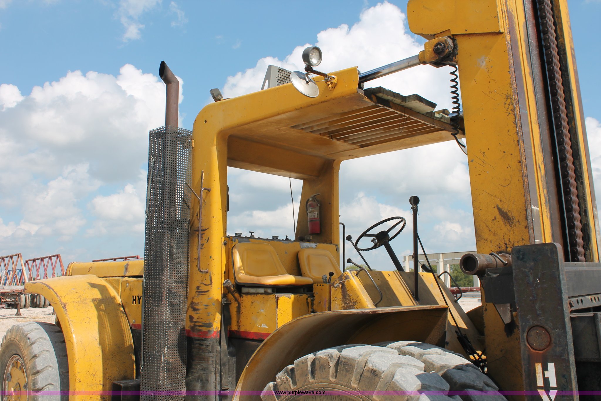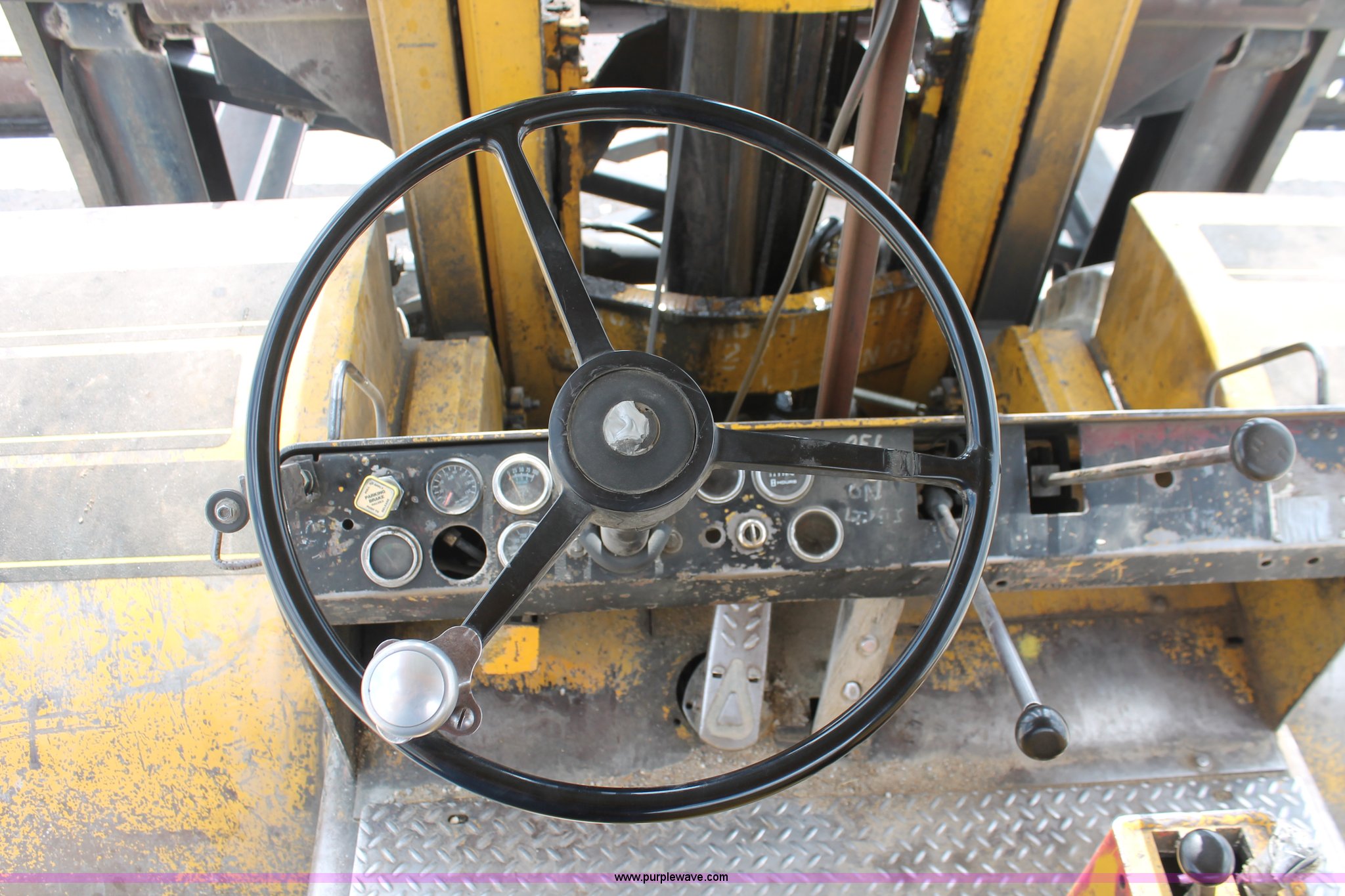 Purple Wave is selling a used Strt. Mast Rough Terr. Forklift in Oklahoma. This item is a 1974 Hyster lift truck with the following: 3,433 hours on meter, Hours may vary, unit is still in use, Detroit Diesel six cylinder diesel engine, OROPS, Work lights, Two stick hydraulic controls, Lift, tilt, and side shift, 25'W lifting beam, 25,000 lbs maximum lift capacity, Four point lifting anchors, 14.00-24 tires, Serial B008P0-1878V, TDI 606