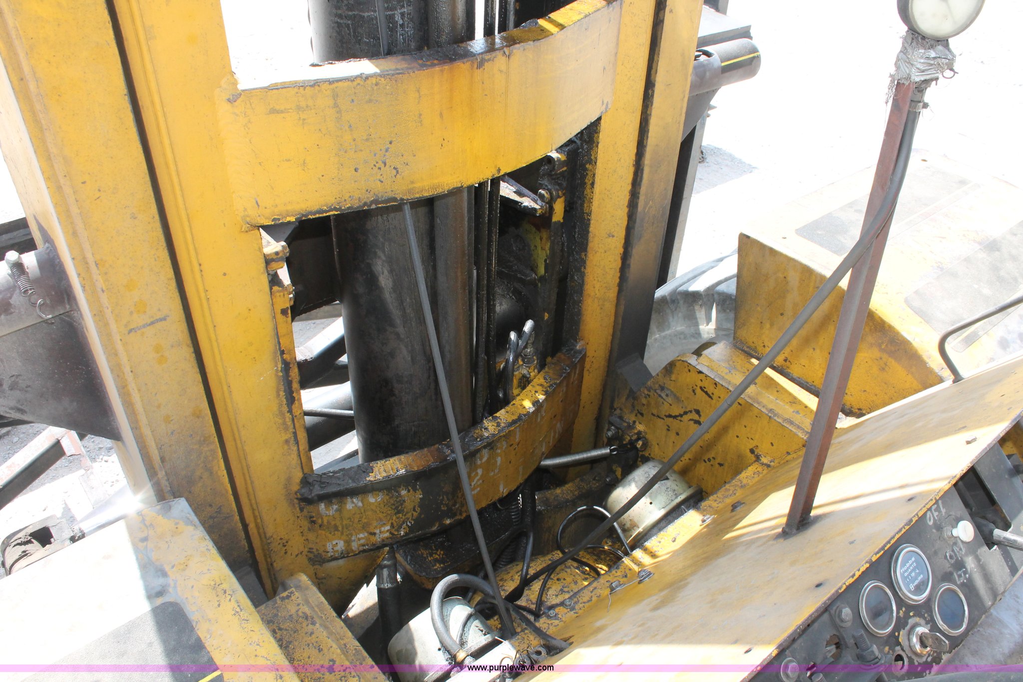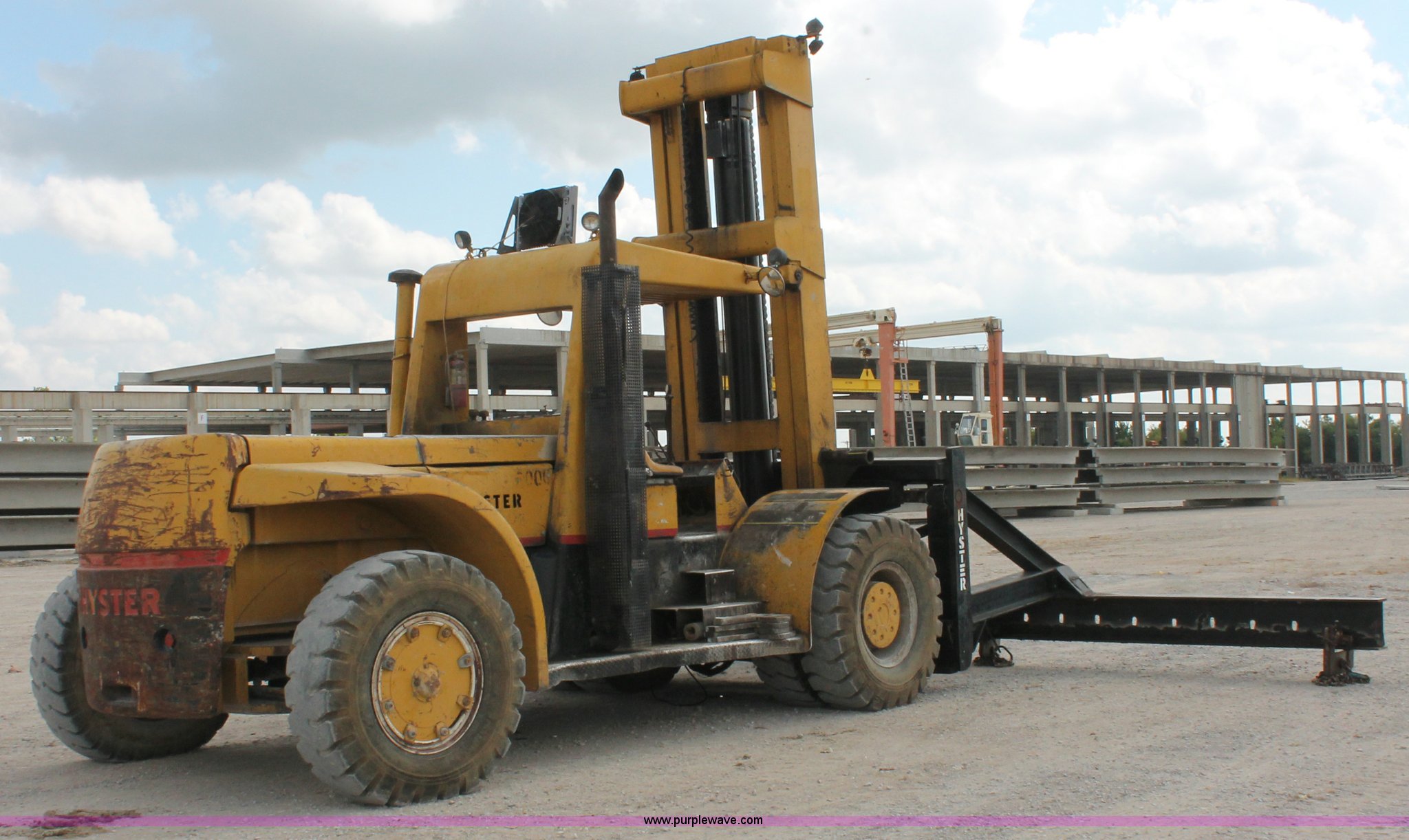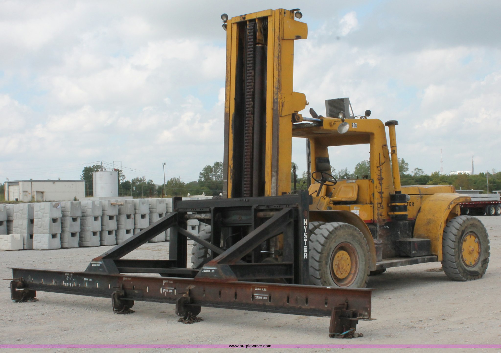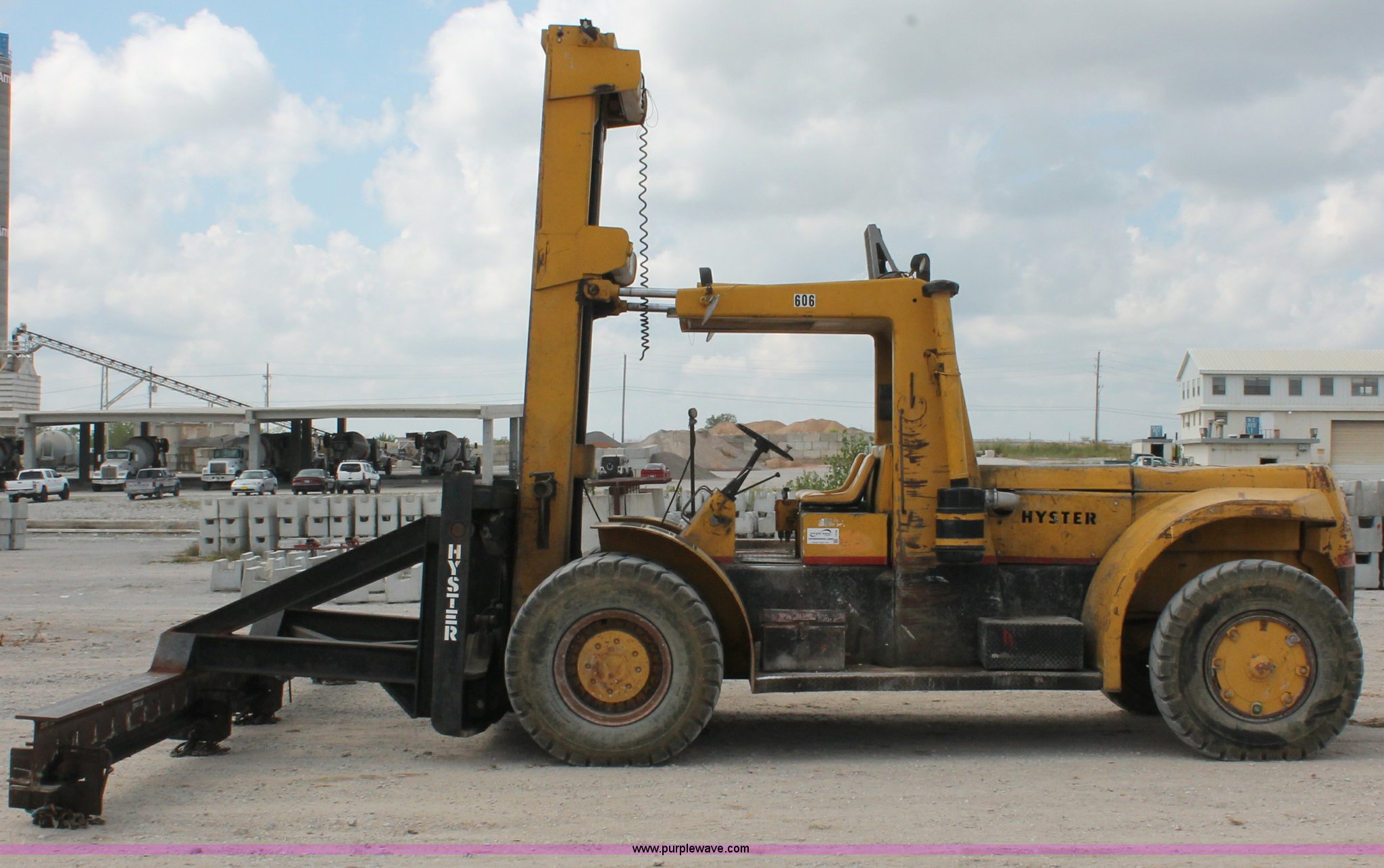 Purple Wave is selling a used Strt. Mast Rough Terr. Forklift in Oklahoma. This item is a 1974 Hyster lift truck with the following: 3,433 hours on meter, Hours may vary, unit is still in use, Detroit Diesel six cylinder diesel engine, OROPS, Work lights, Two stick hydraulic controls, Lift, tilt, and side shift, 25'W lifting beam, 25,000 lbs maximum lift capacity, Four point lifting anchors, 14.00-24 tires, Serial B008P0-1878V, TDI 606