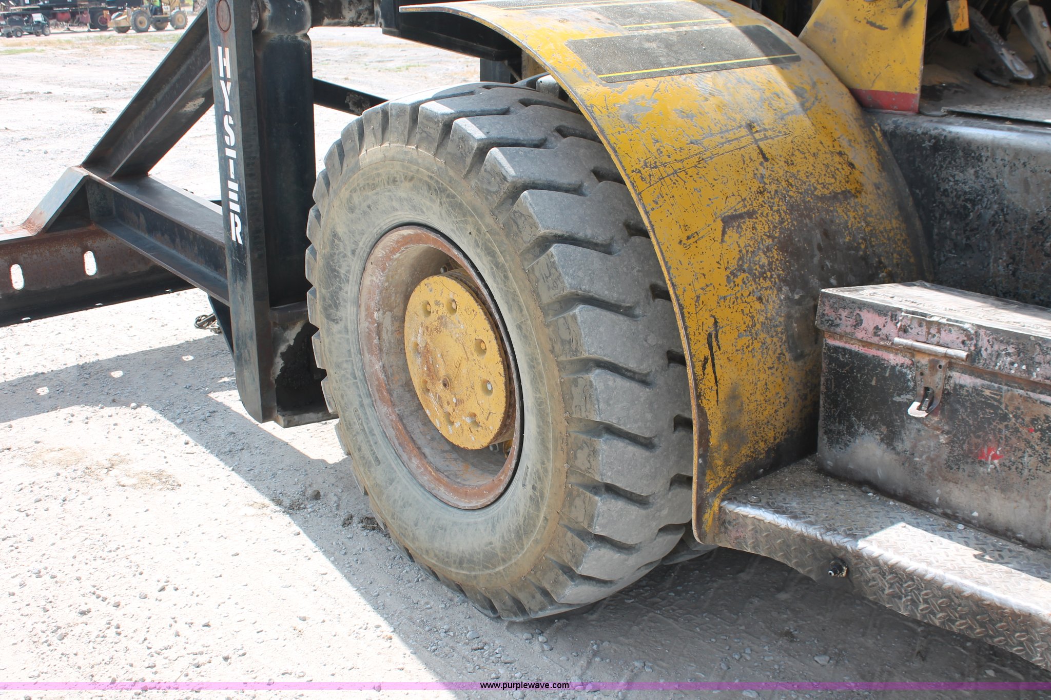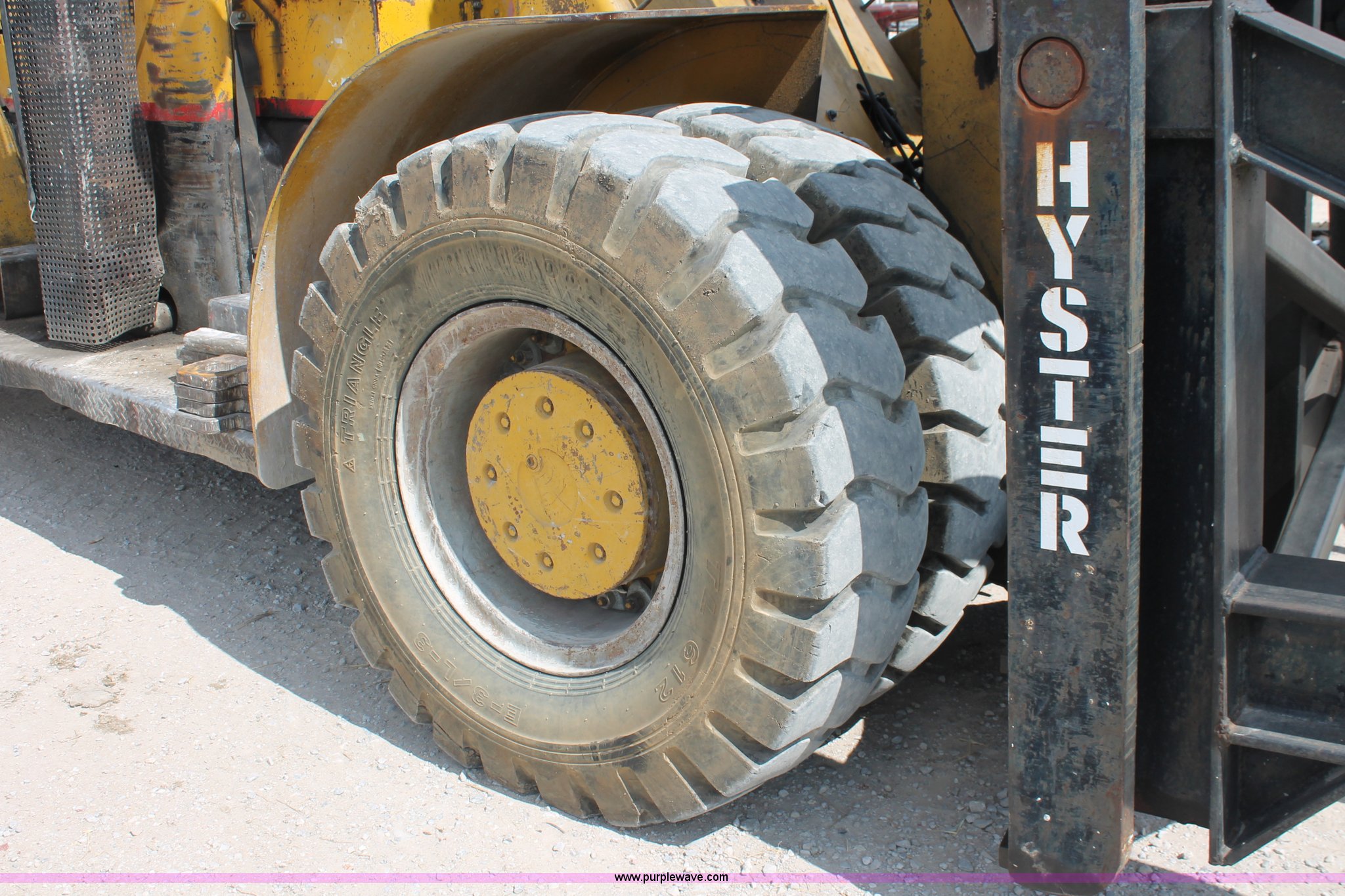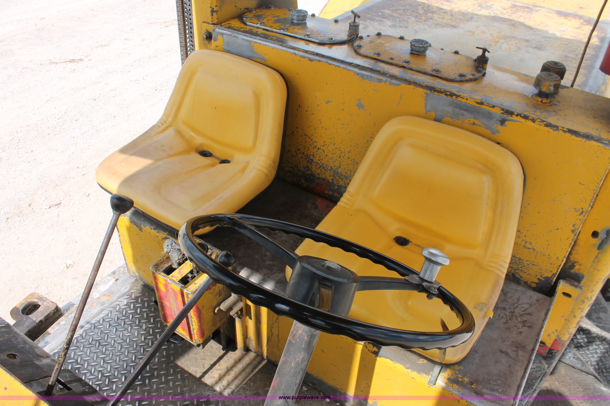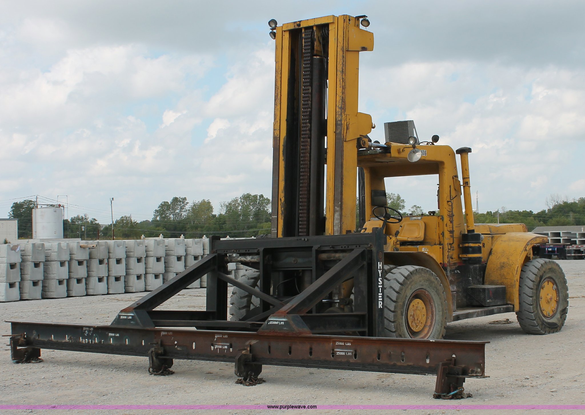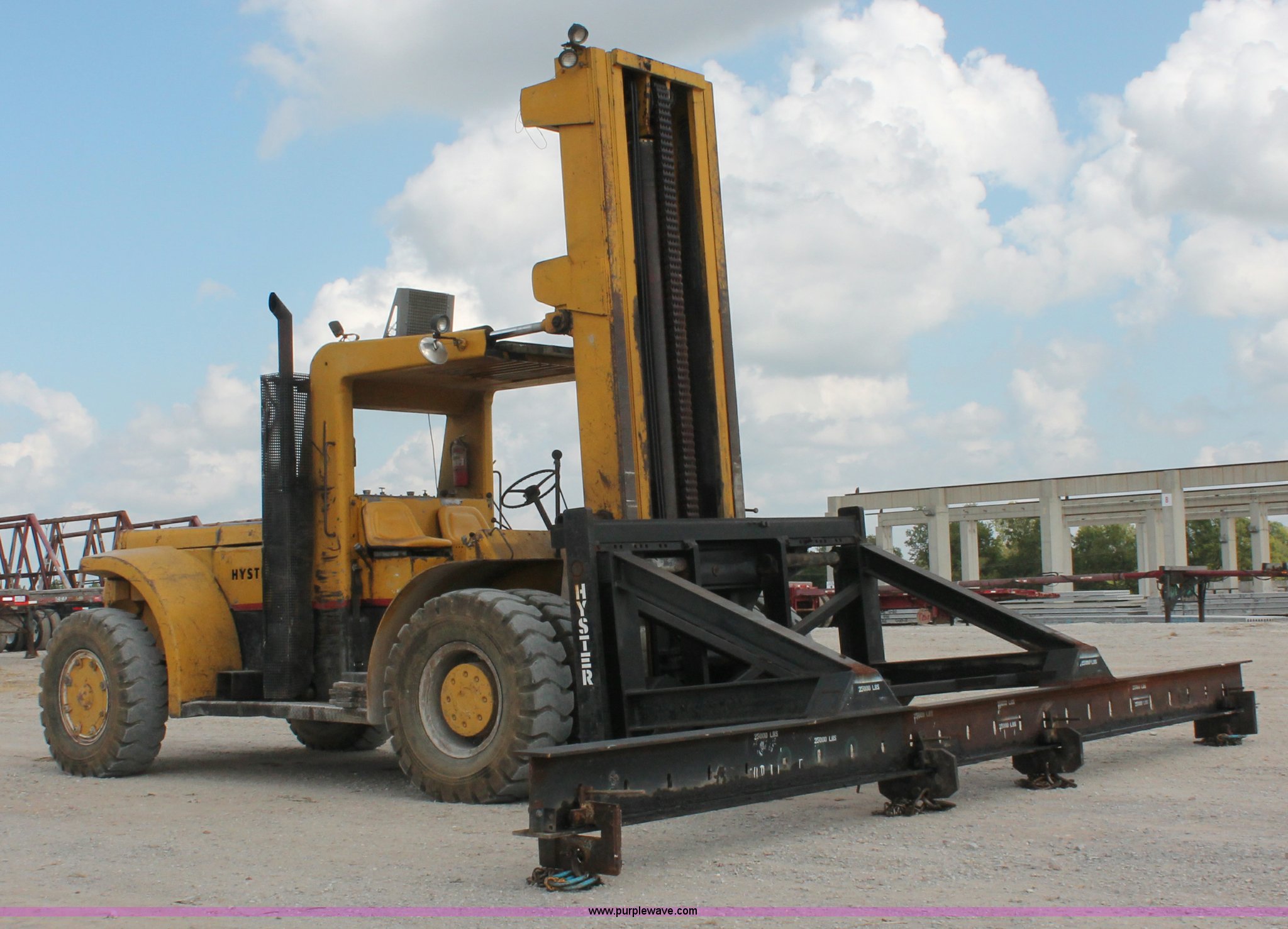 Purple Wave is selling a used Strt. Mast Rough Terr. Forklift in Oklahoma. This item is a 1974 Hyster lift truck with the following: 3,433 hours on meter, Hours may vary, unit is still in use, Detroit Diesel six cylinder diesel engine, OROPS, Work lights, Two stick hydraulic controls, Lift, tilt, and side shift, 25'W lifting beam, 25,000 lbs maximum lift capacity, Four point lifting anchors, 14.00-24 tires, Serial B008P0-1878V, TDI 606