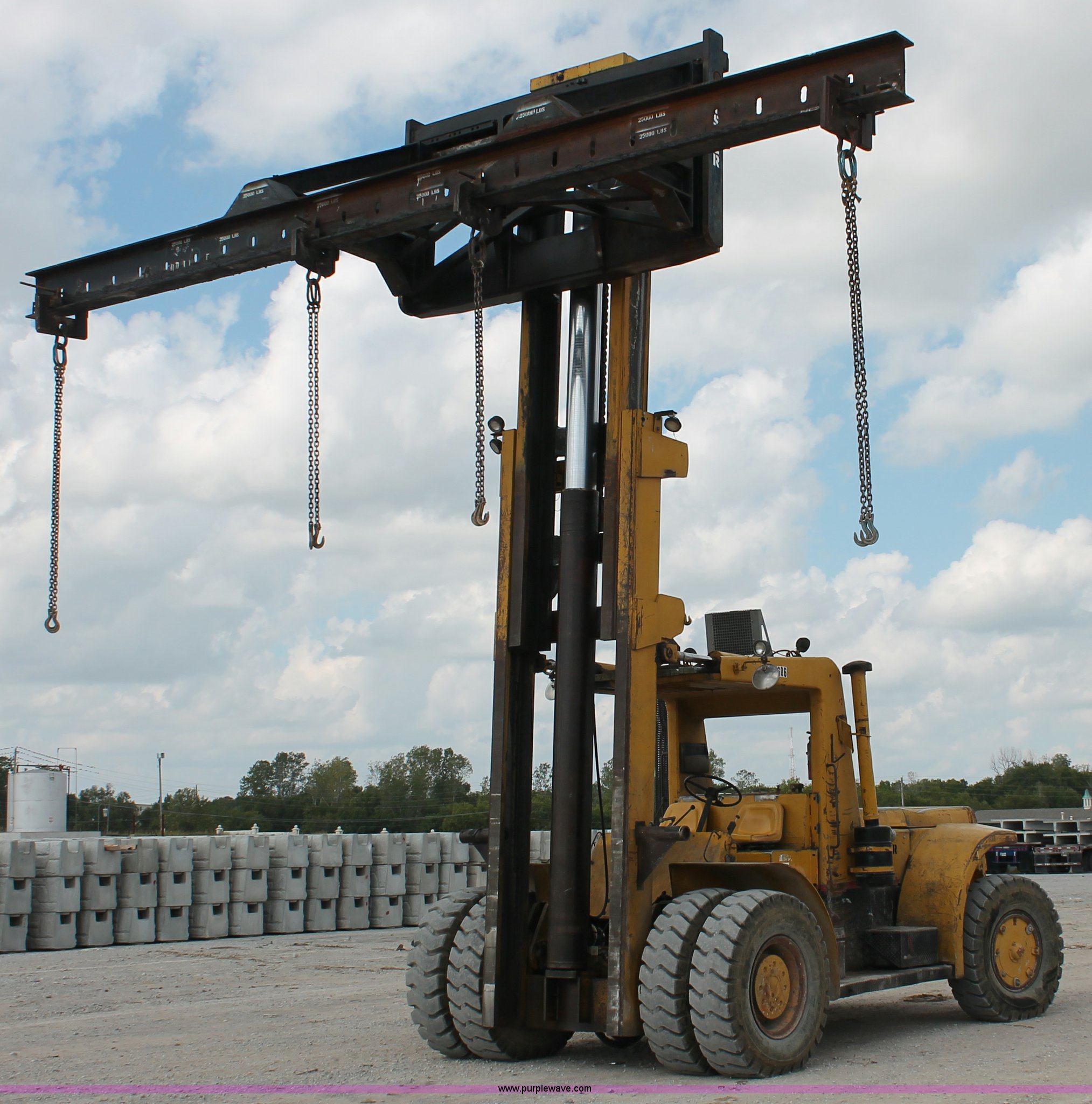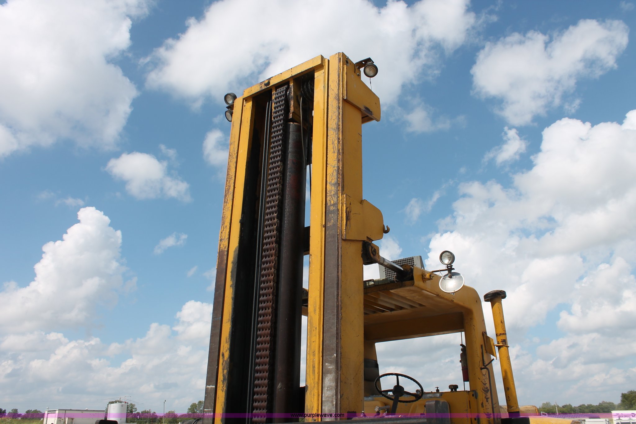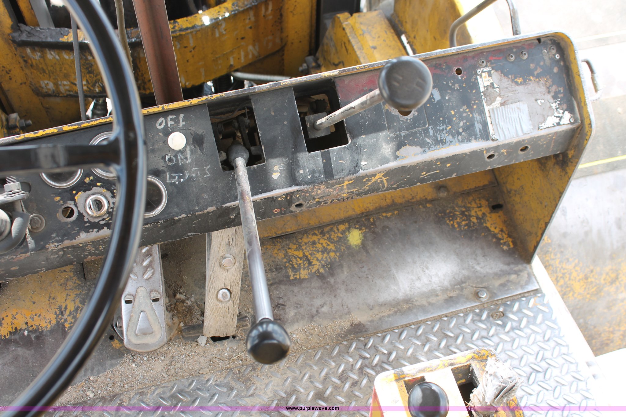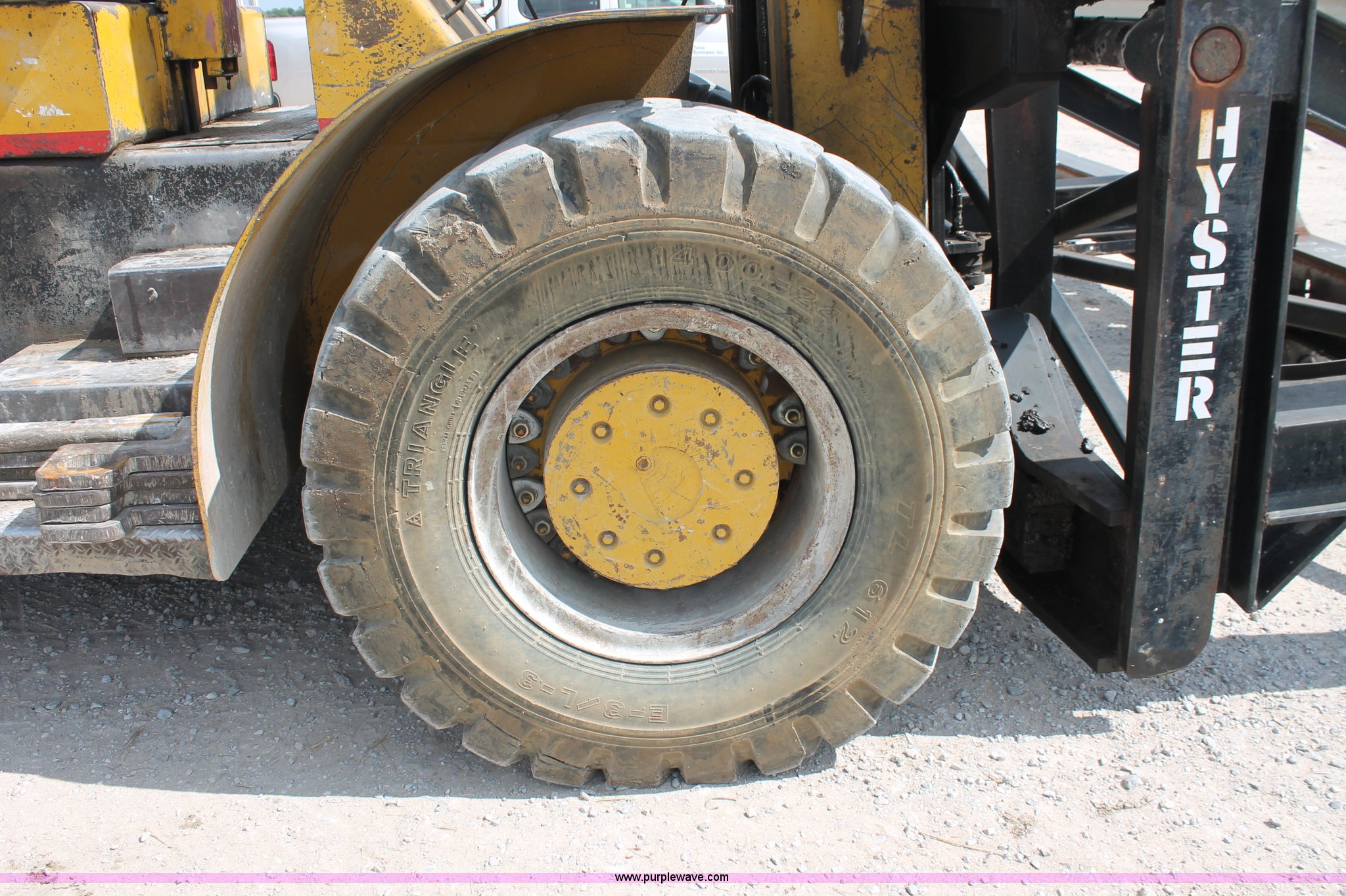 Purple Wave is selling a used Strt. Mast Rough Terr. Forklift in Oklahoma. This item is a 1974 Hyster lift truck with the following: 3,433 hours on meter, Hours may vary, unit is still in use, Detroit Diesel six cylinder diesel engine, OROPS, Work lights, Two stick hydraulic controls, Lift, tilt, and side shift, 25'W lifting beam, 25,000 lbs maximum lift capacity, Four point lifting anchors, 14.00-24 tires, Serial B008P0-1878V, TDI 606
