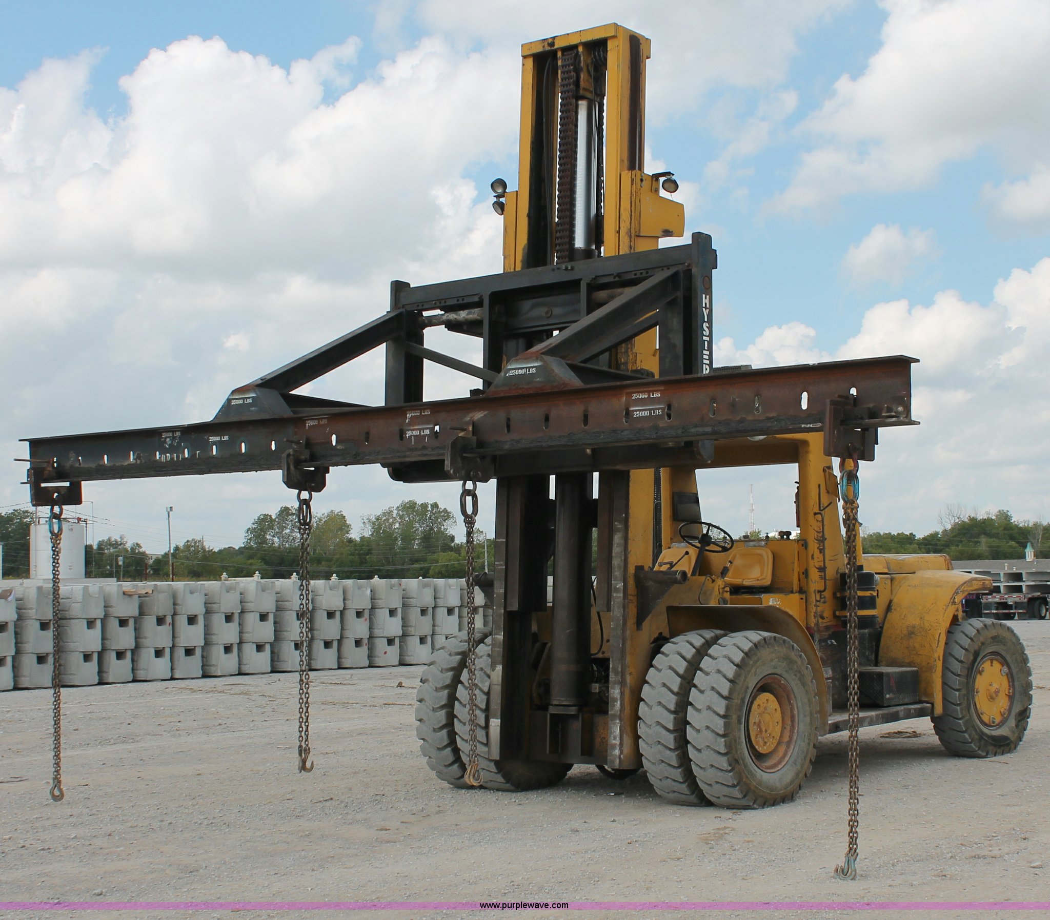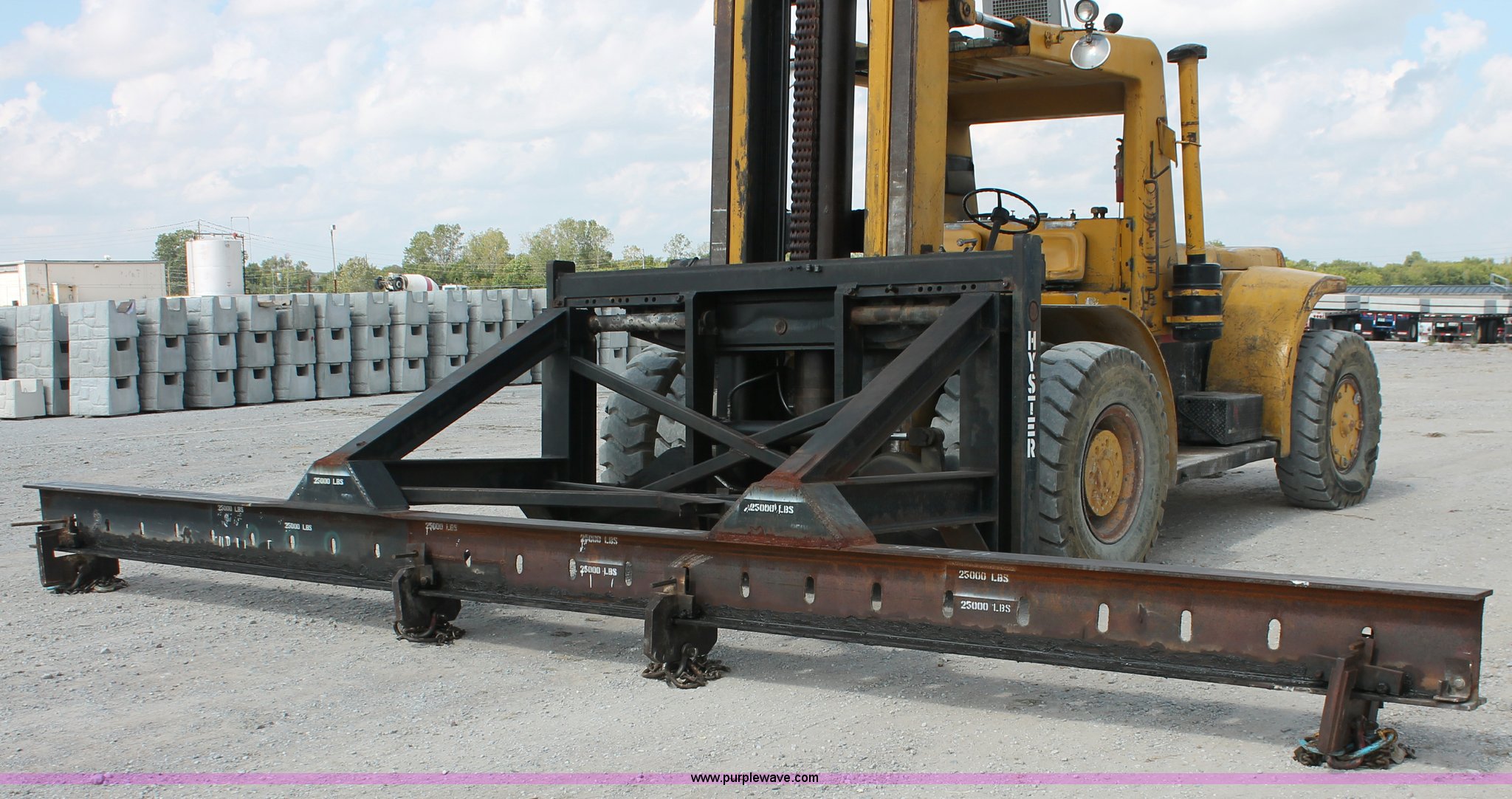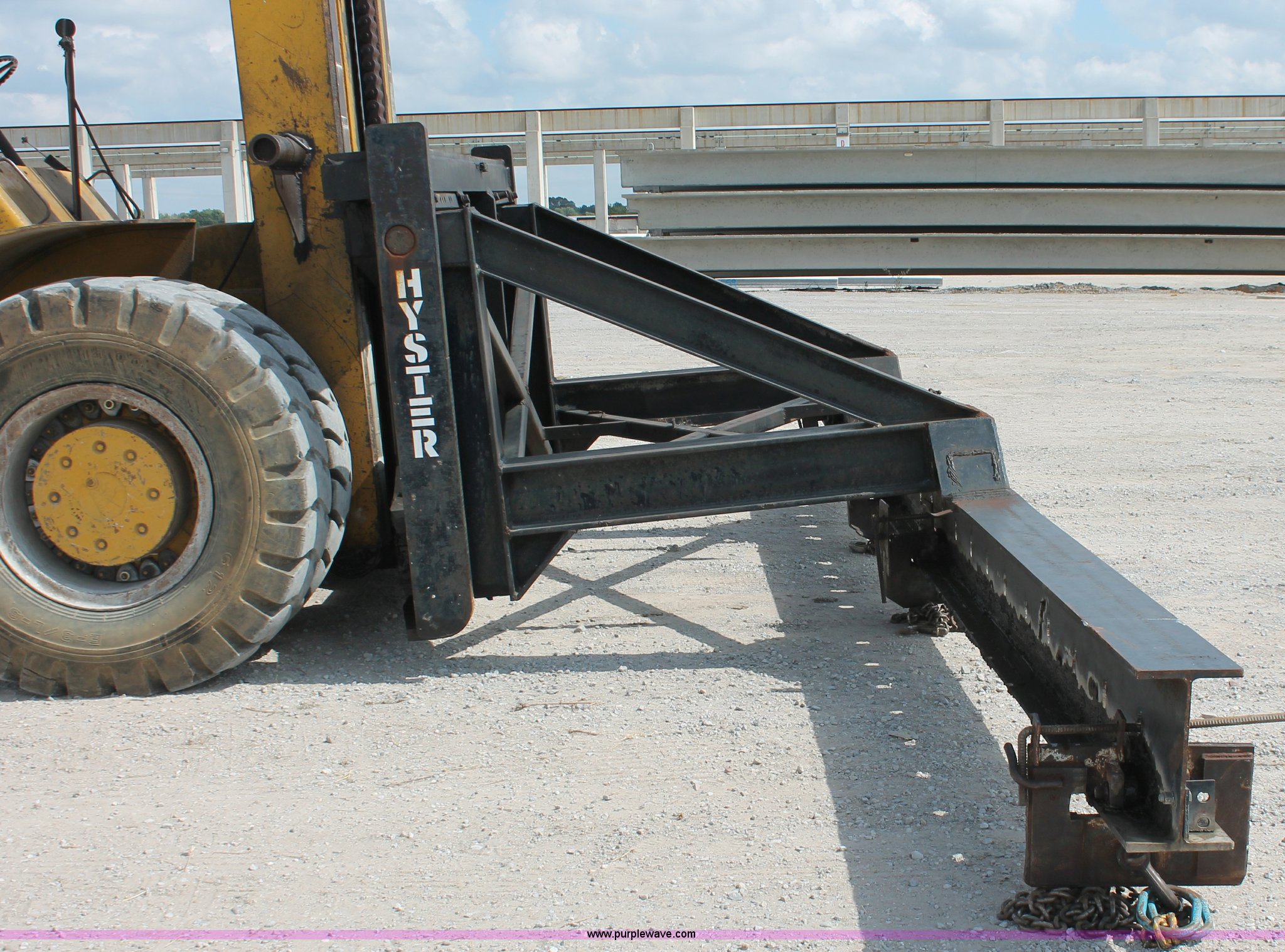 1974 Hyster lift truck. 3,433 hours on meter, Hours may vary, unit is still in use, Detroit Diesel six cylinder diesel engine, OROPS, Work lights, Two stick hydraulic controls, Lift, tilt, and side shift, 25'W lifting beam, 25,000 lbs maximum lift capacity, Four point lifting anchors, 14.00-24 tires, Serial B008P0-1878V, TDI 606. This item will be utilized during the removal process. Load-out will be available starting December 9, 2013. Tulsa Dynaspan, Inc.. 1601 E Houston Street. Broken Arrow, OK 74012