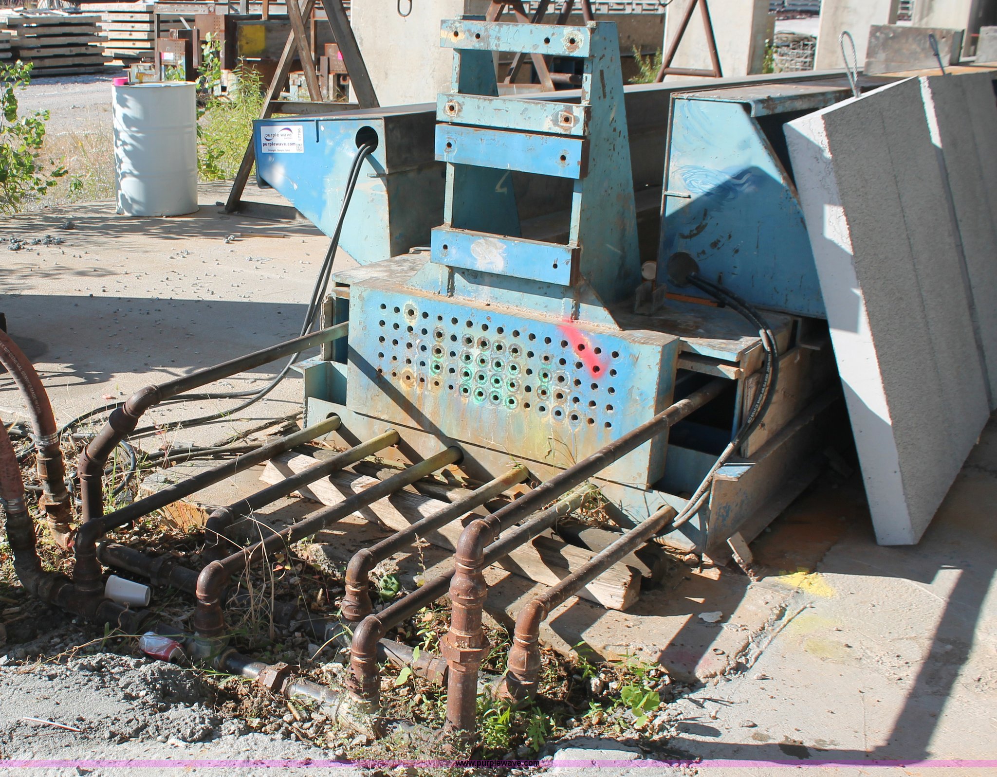 Purple Wave is selling a used Building Materials in Oklahoma. This item is a Hamilton inverted tee IT beam concrete form bed with the following: Self-stressing, 125'L, 34"W, 12" ledges, 24" stem, 36" total height, 1/2" pre-stressed cable compatibility, (80) cable entries on bulkhead, Heated in-bed plumbing, Vickers power system, 2 HP, Three phase, 230/460V