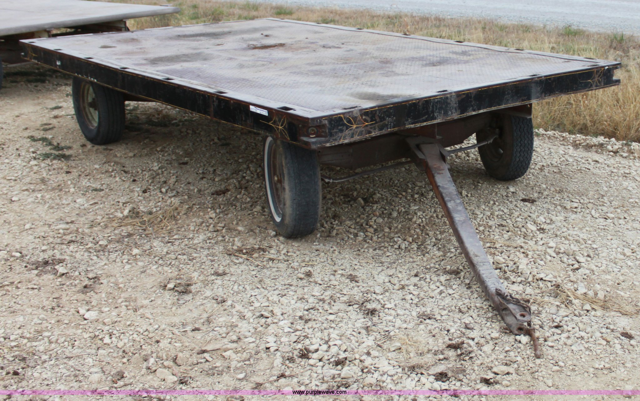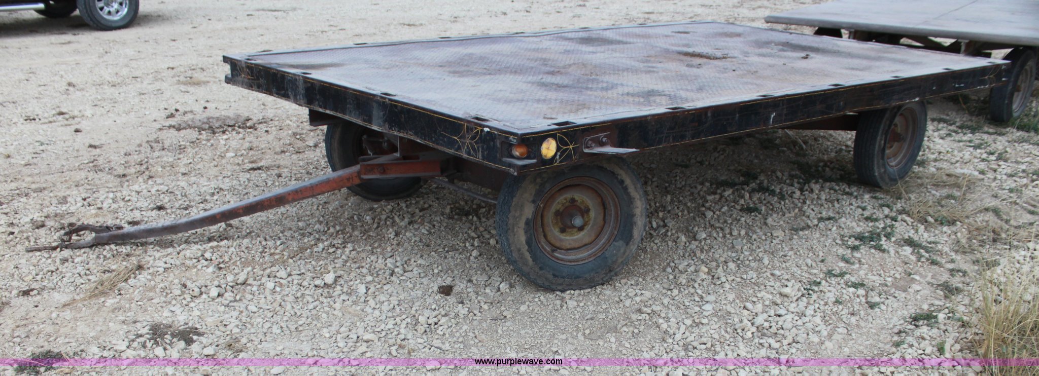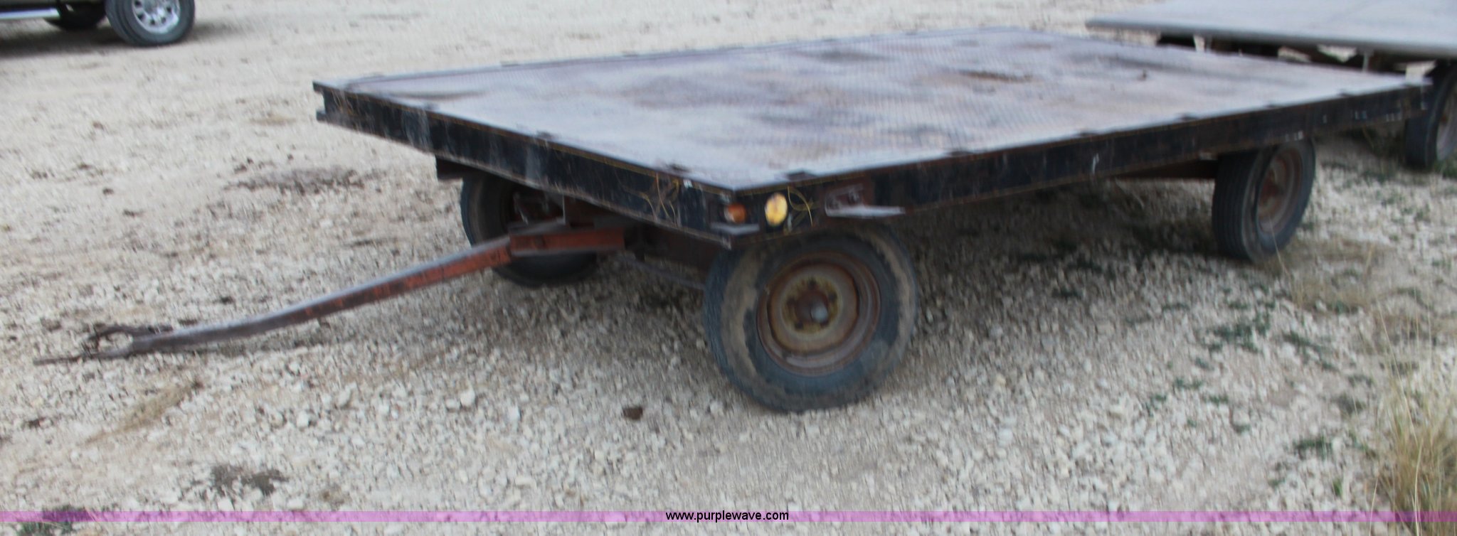 Purple Wave is selling a used Hay Handling in Kansas. This item is a Four wheel hay wagon with the following: 13.5' x 8', Steel floor, 215/75R14 tires