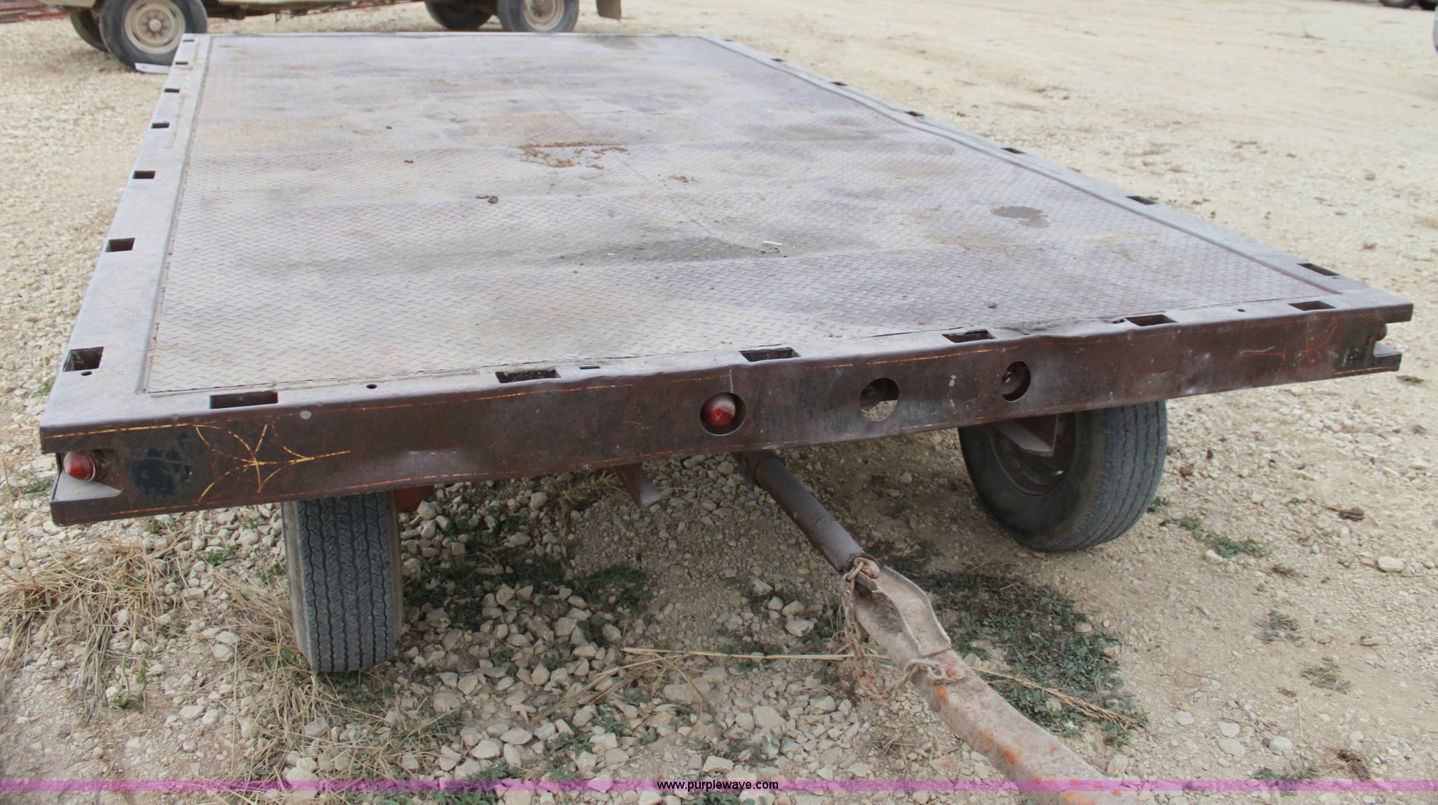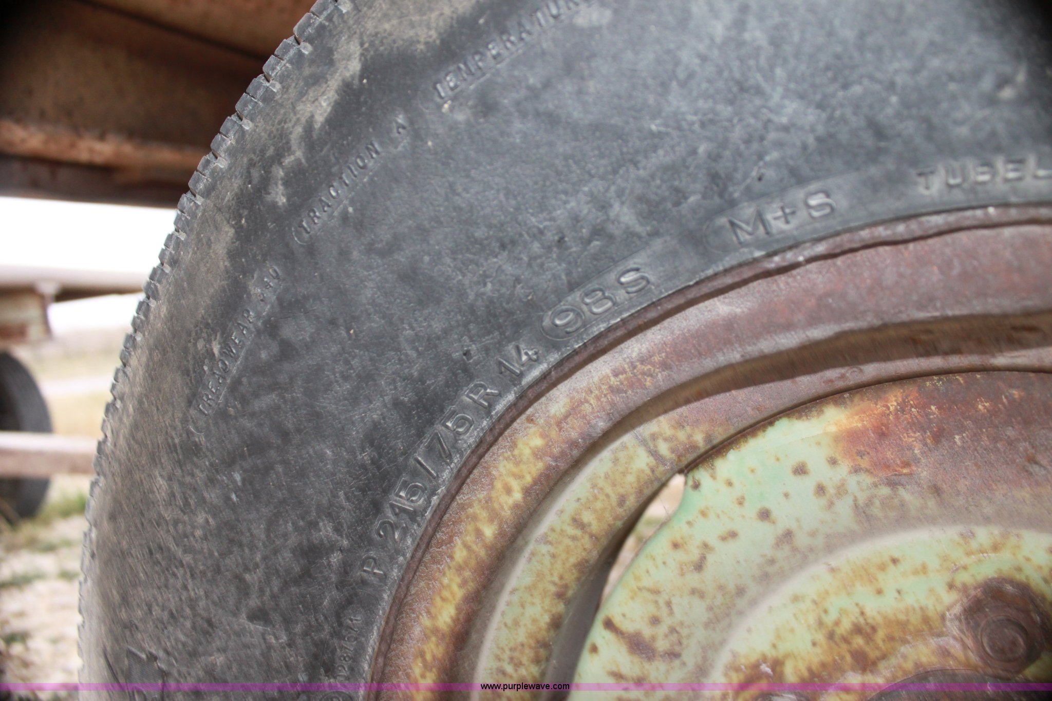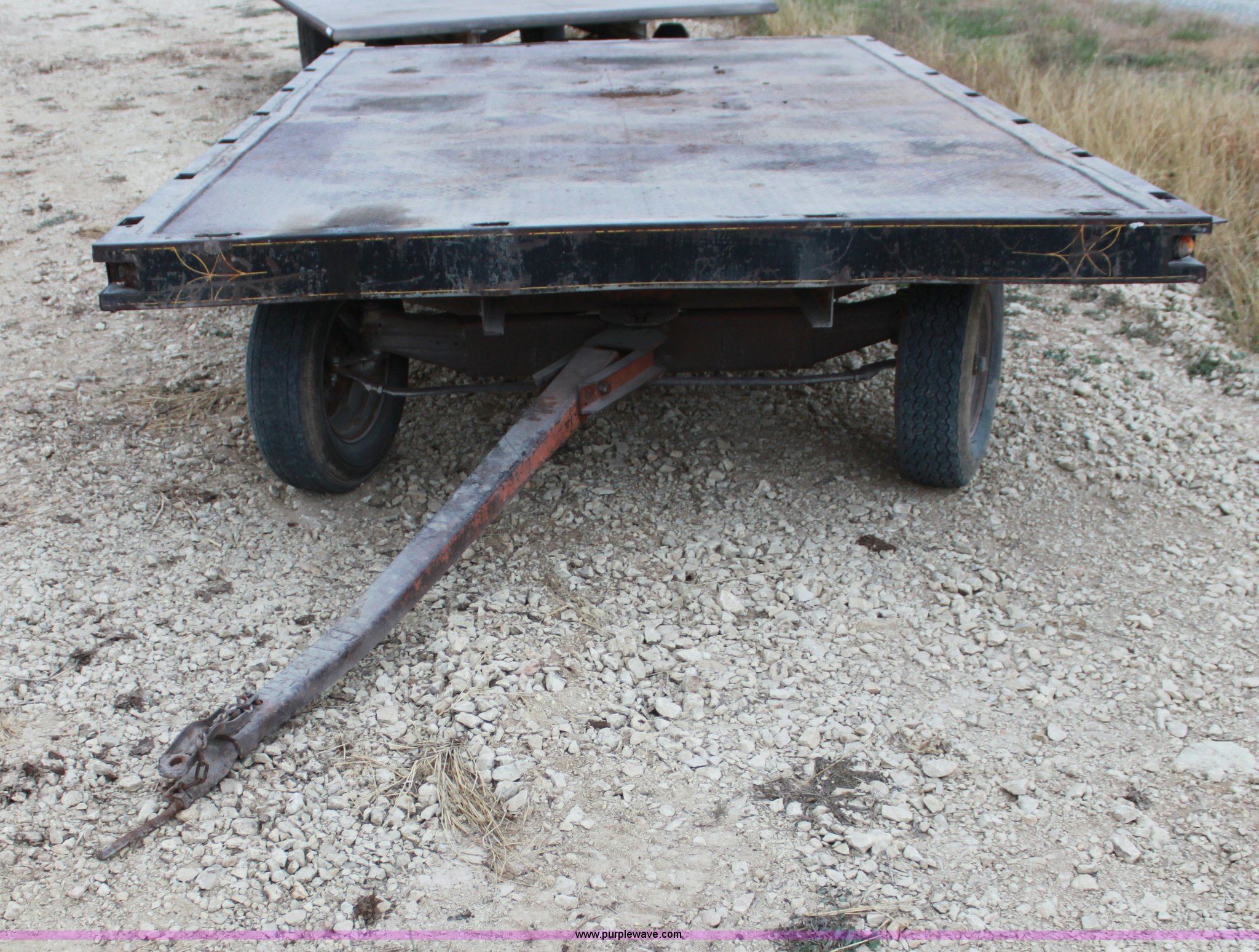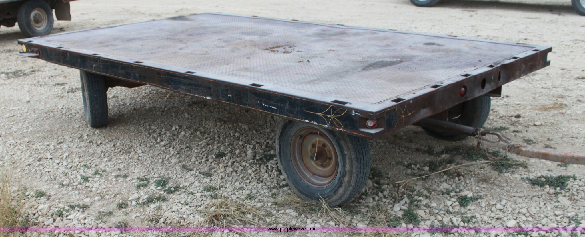 Purple Wave is selling a used Hay Handling in Kansas. This item is a Four wheel hay wagon with the following: 13.5' x 8', Steel floor, 215/75R14 tires
