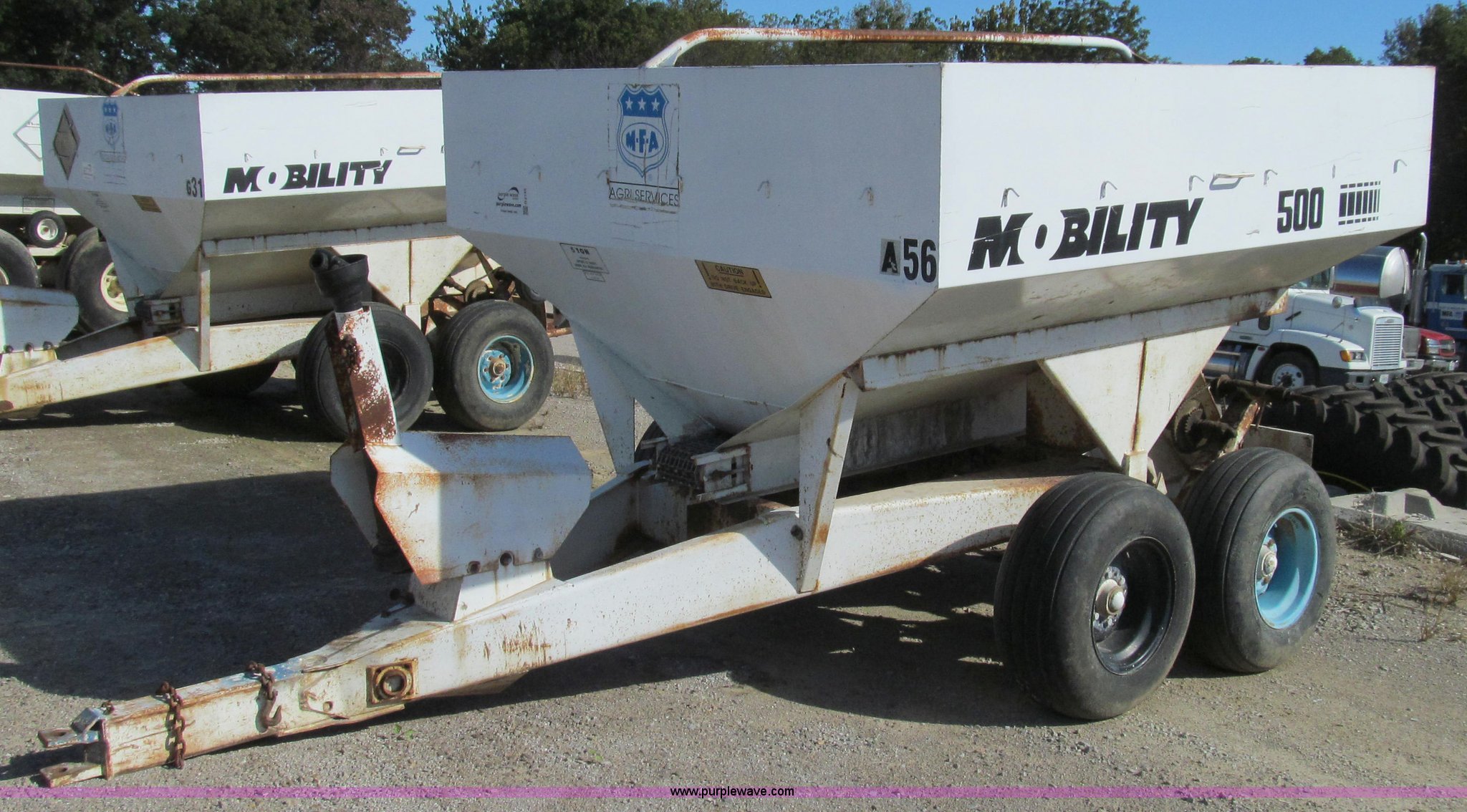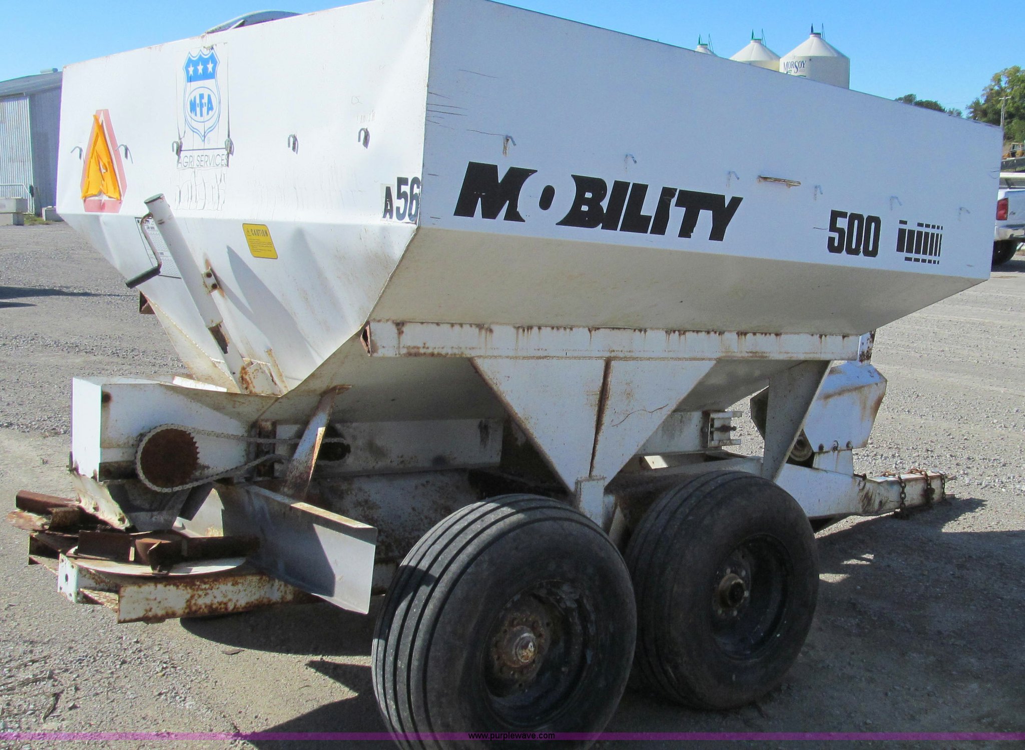Mobility 500 fertilizer spreader. Five ton capacity , Ground driven drag chain Drive tire missing, 540 PTO driven spinners, Dual spinners, Safety chains, 11L-15 tires, No jack stand, Non-operational, needs repair, Unit# 56. MFA, Inc.. 402 10th St. Glasgow, MO 65254
