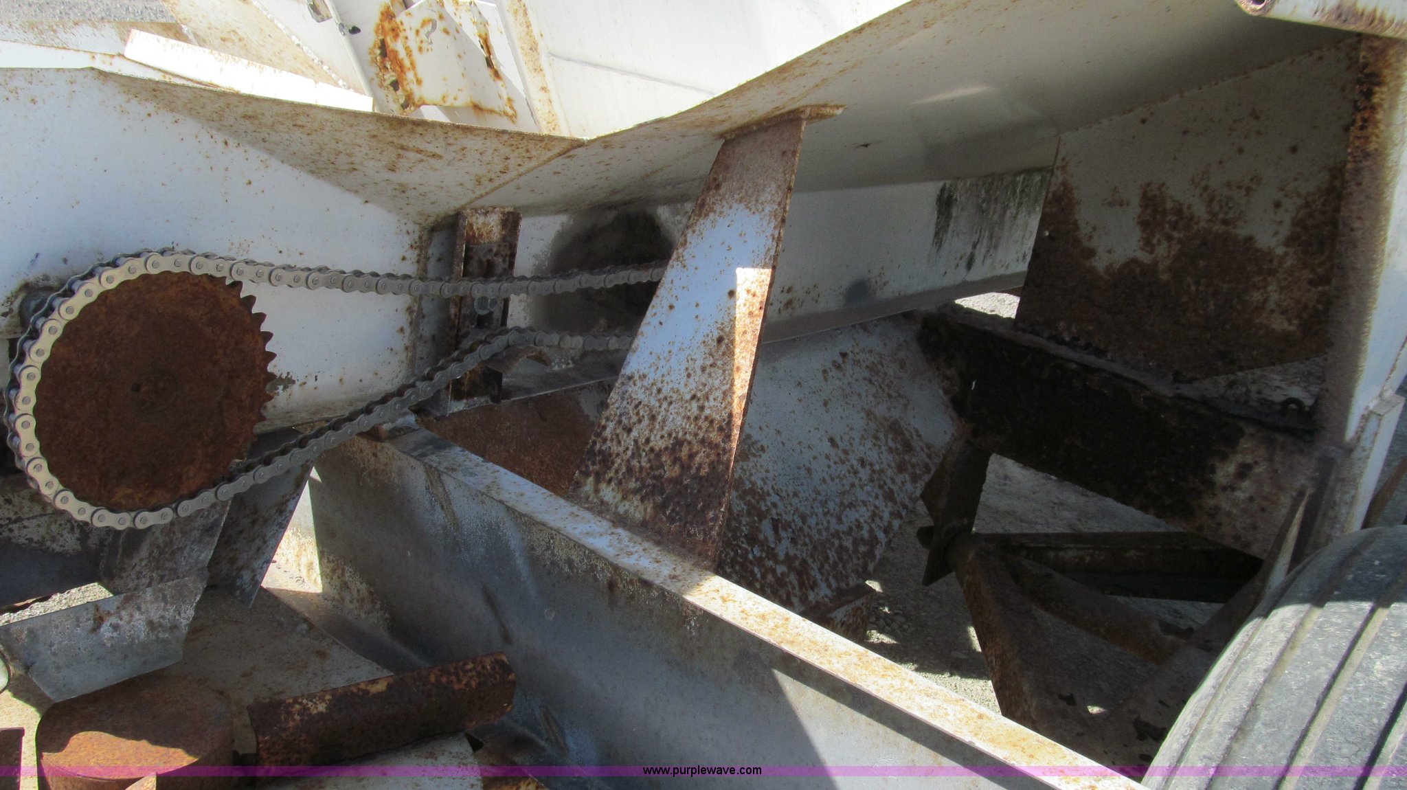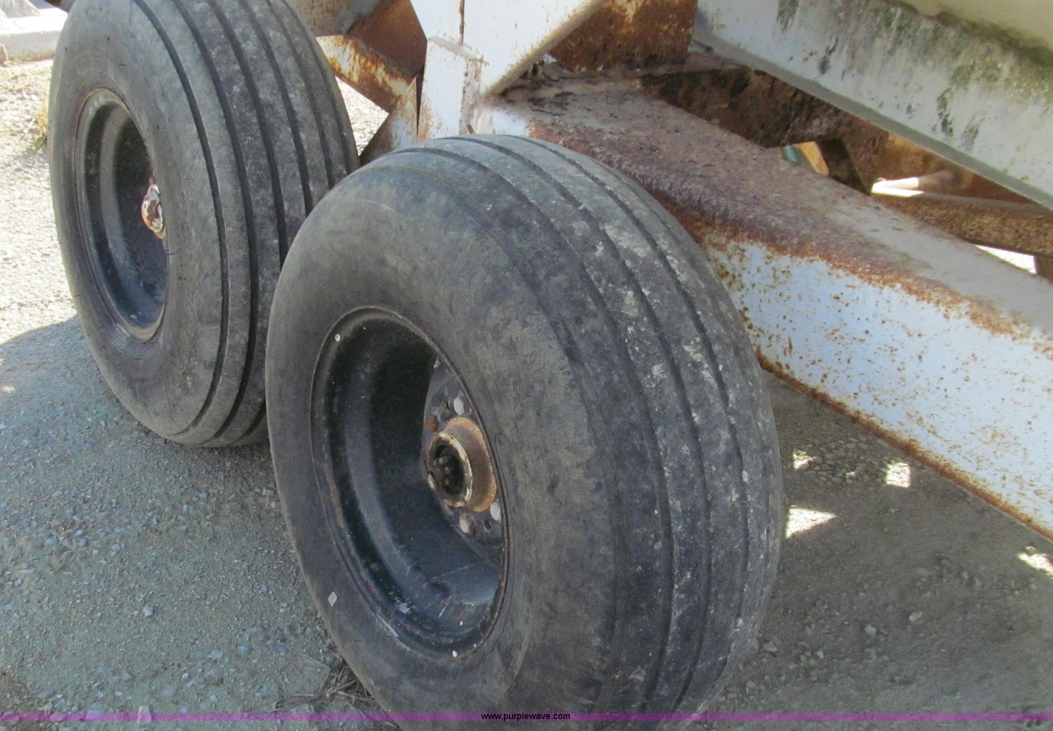Purple Wave is selling a used Applicator Pull Type in Missouri. This item is a Mobility 500 fertilizer spreader with the following: Five ton capacity, Ground driven drag chain, Drive tire missing, 540 PTO driven spinners, Dual spinners, Safety chains, 11L-15 tires, No jack stand, Non-operational, needs repair, Unit# 56