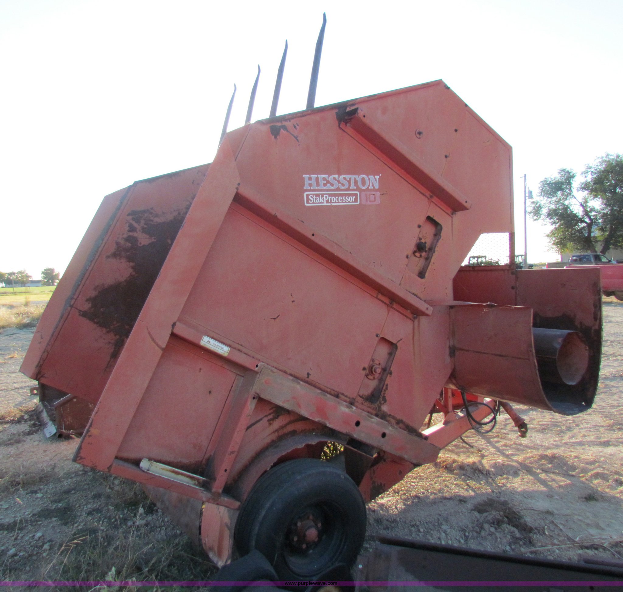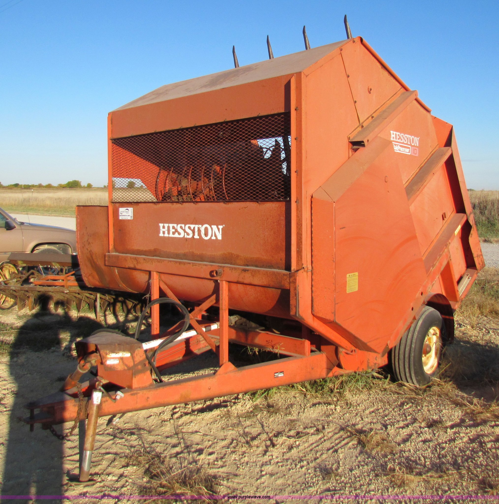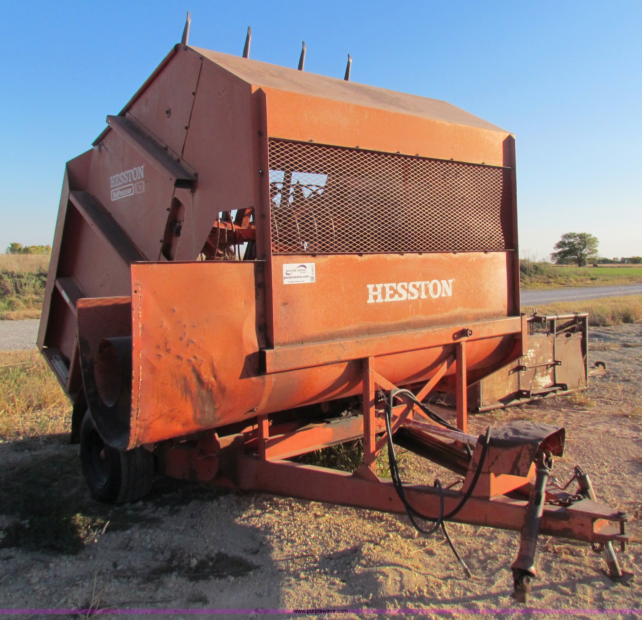 Purple Wave is selling a used Feed Mixer or Bale Processor in Kansas. This item is a Hesston StakProcessor 10 hay bale processor with the following: 540 PTO, Rear bale pickup, 9.5L-15 tires, Serial SP10