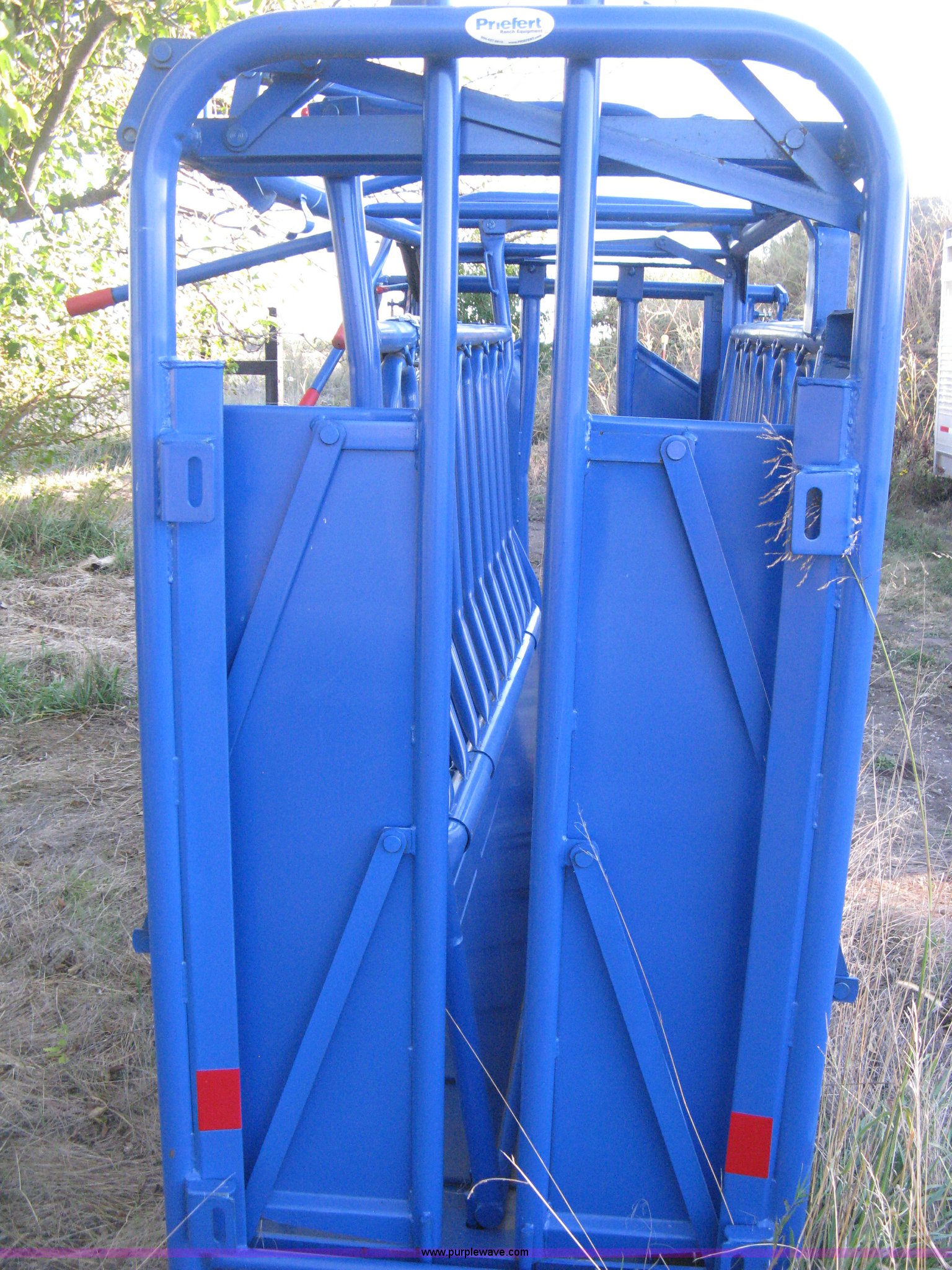 Purple Wave is selling a used Livestock Equip. in Kansas. This item is a Priefert S04 cattle squeeze chute with the following: Manual operation, Adjustable width, Drop down side bars, Drop down pan, Head gate, Full rear gate, Side release gate, Unused, Serial 8593
