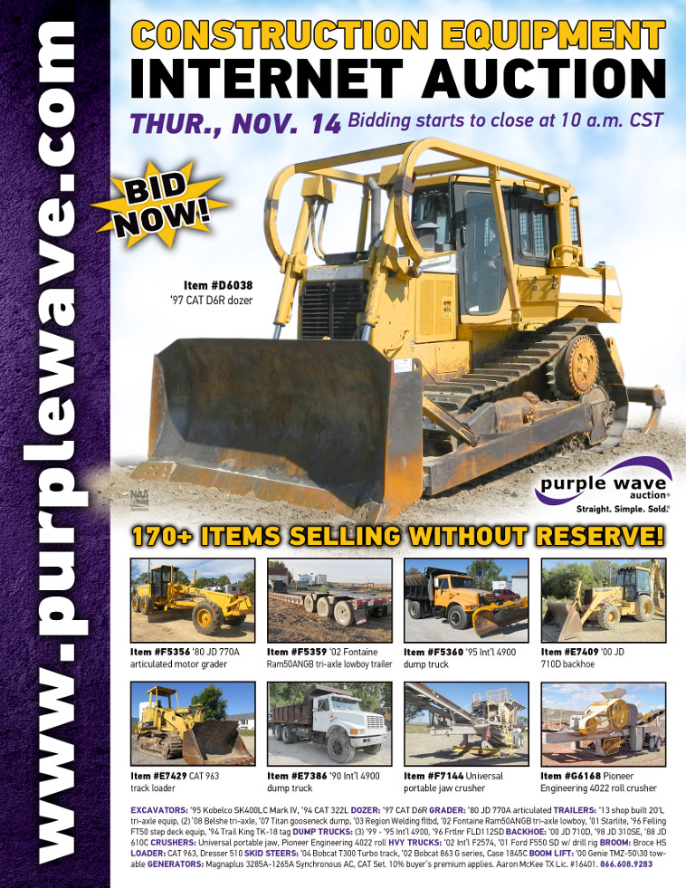 This is an Internet-only auction, which means the highest bid online when the bidding closes on a particular item will be the winning bid for that item. Bidding for items will begin to close one item per minute at 10:00 a.m. CST on Thursday, November 14. The items will close in the order listed on the website. This auction will feature our automatic extension system which will grant a five (5) minute extension to the end of the auction of any item receiving a bid during the last five (5) minutes. The item will then close when five (5) minutes have elapsed without any bidding activity. Unless otherwise noted, items in this auction are selling without reserve, and all Internet bids are treated as if they were given at a live auction. All bidders will be held accountable for their Internet bids.