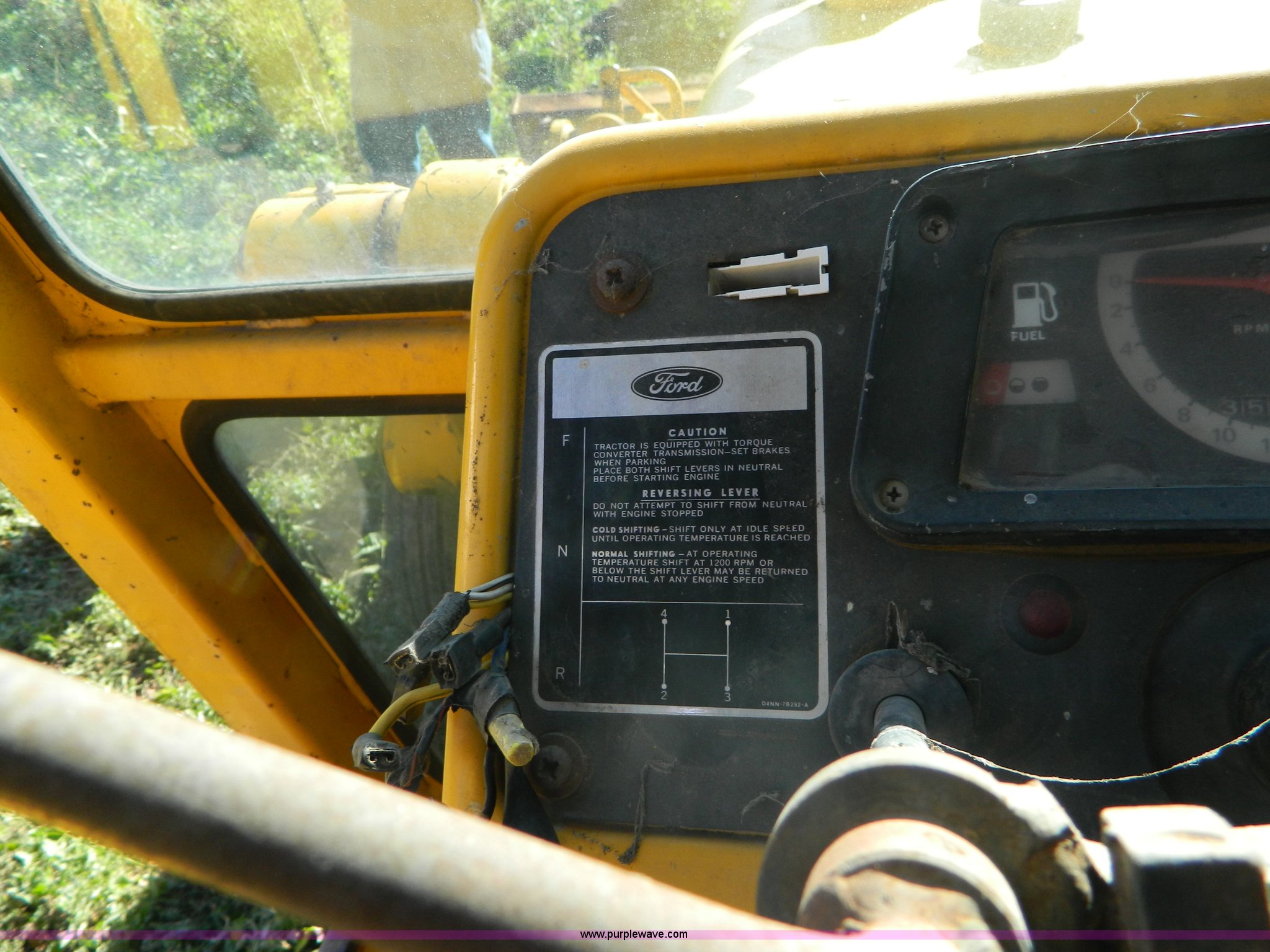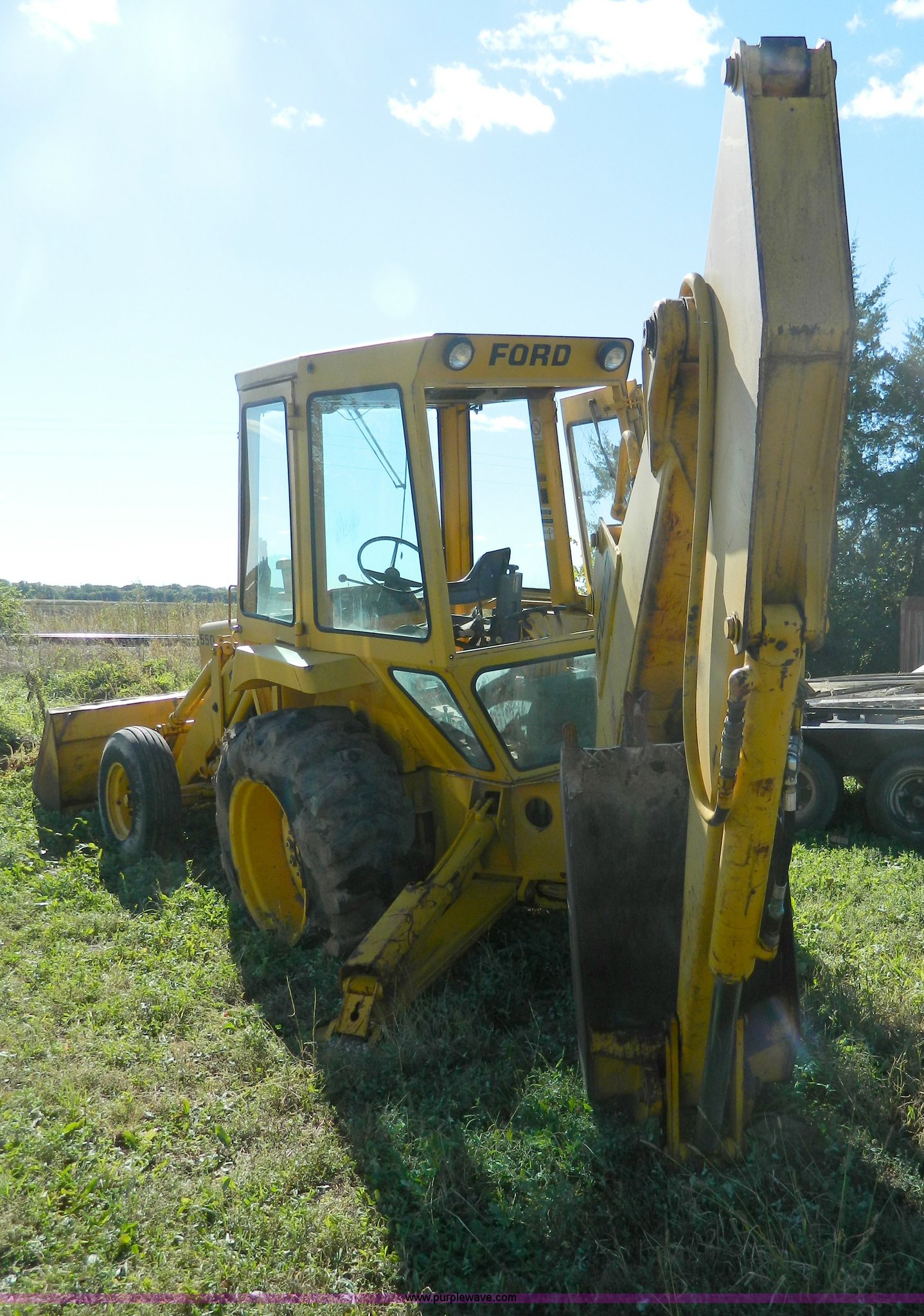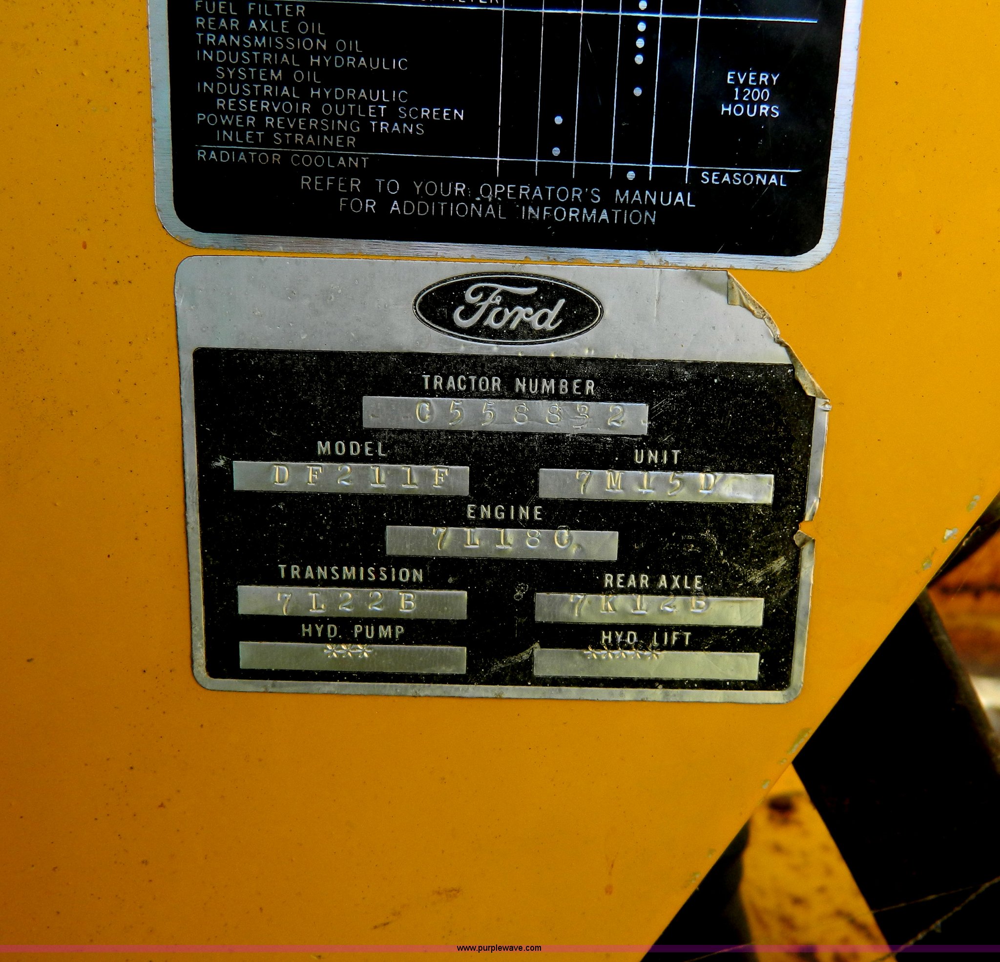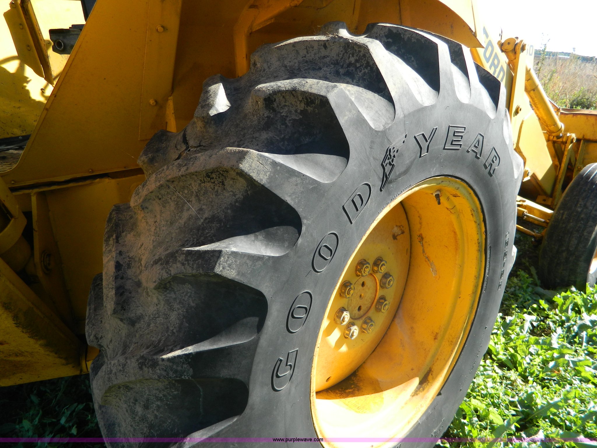 Purple Wave is selling a used Tractor Loader Backhoe in Kansas. This item is a Ford DF211F backhoe with the following: 3,560 hours on meter, Four cylinder diesel engine, Serial 71180, Four speed manual transmission, Serial 7L22B, Heat, 7' front bucket, 24" backhoe bucket, 18' dig depth, 9.00-16 front tires, 16.9-28 rear tires, Cracked and missing glass, No battery, Rear tire bad, Recently replaced head gasket, water pump, and radiator, Serial 0558832