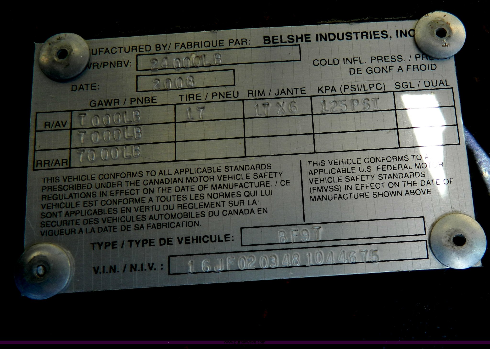 2008 Belshe triple axle trailer. 23' landing deck, 4' x 18" folding ramps, 105"W outside fenders, 25"W landing tracks, 10" main frame, D-ring tie downs, Pintle hitch, 215/75R17.5 tires, GVWR 24,000 lbs. 16JF0203481044675. Total Lease Service, Inc.. 1309 Toulon Ave. Hays, KS 67601