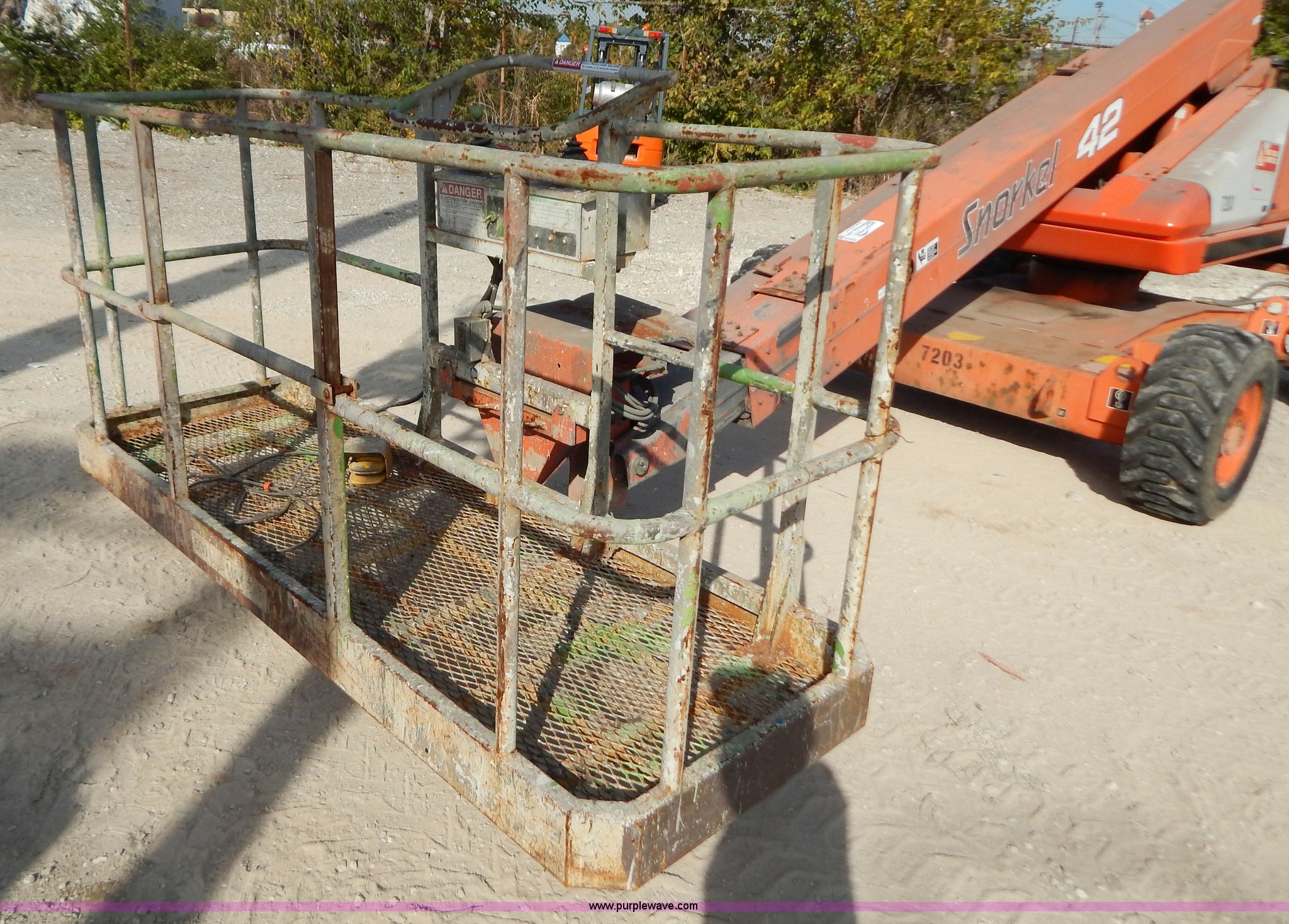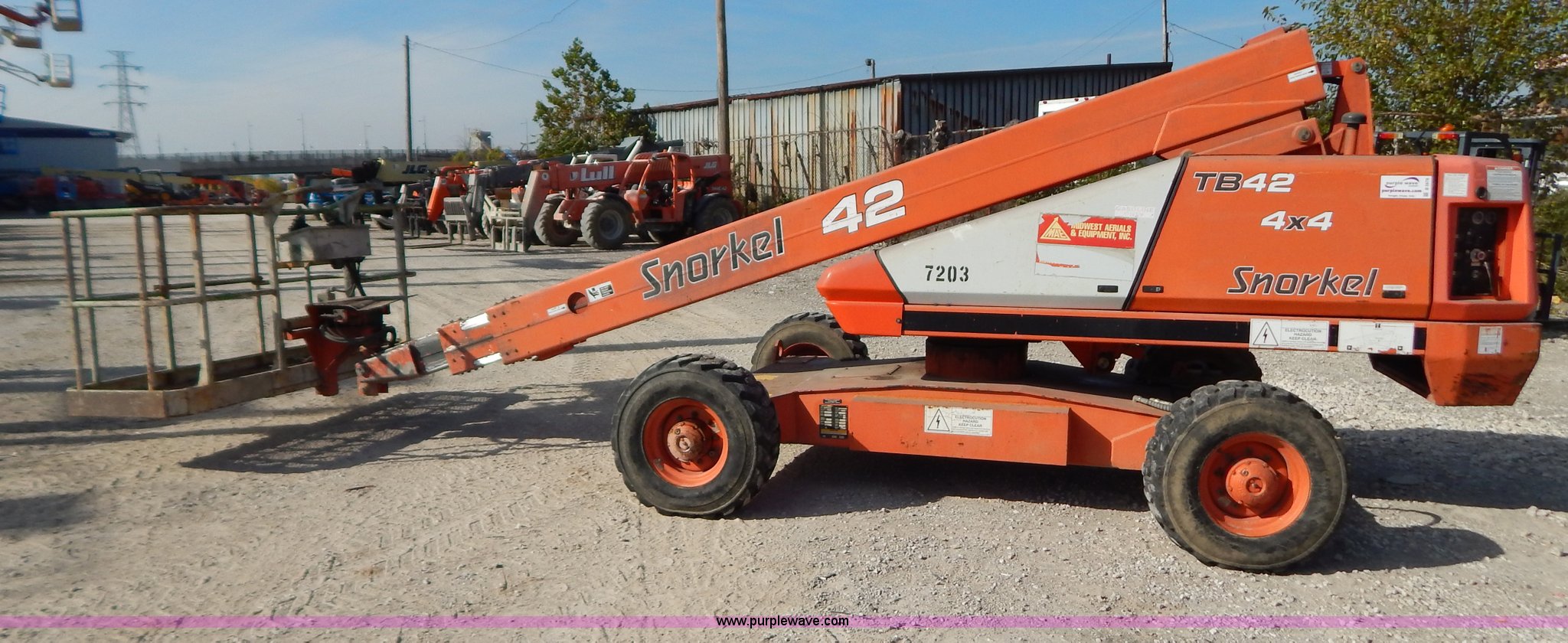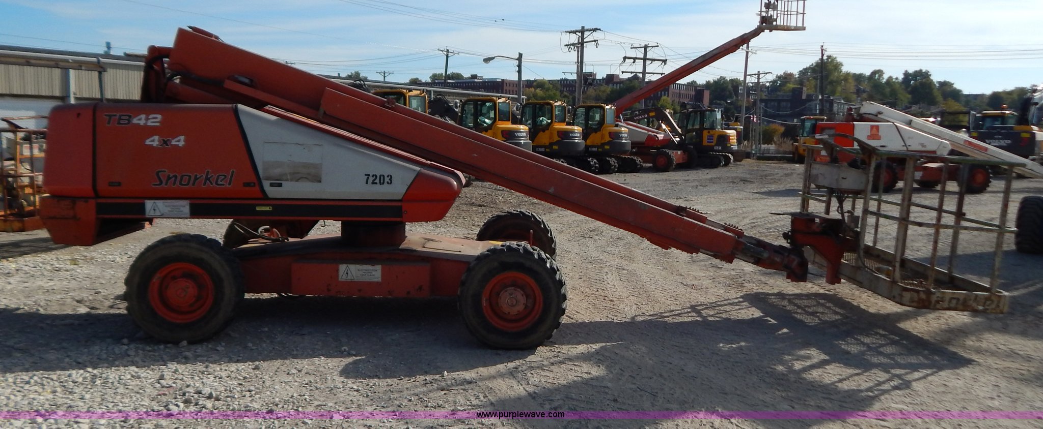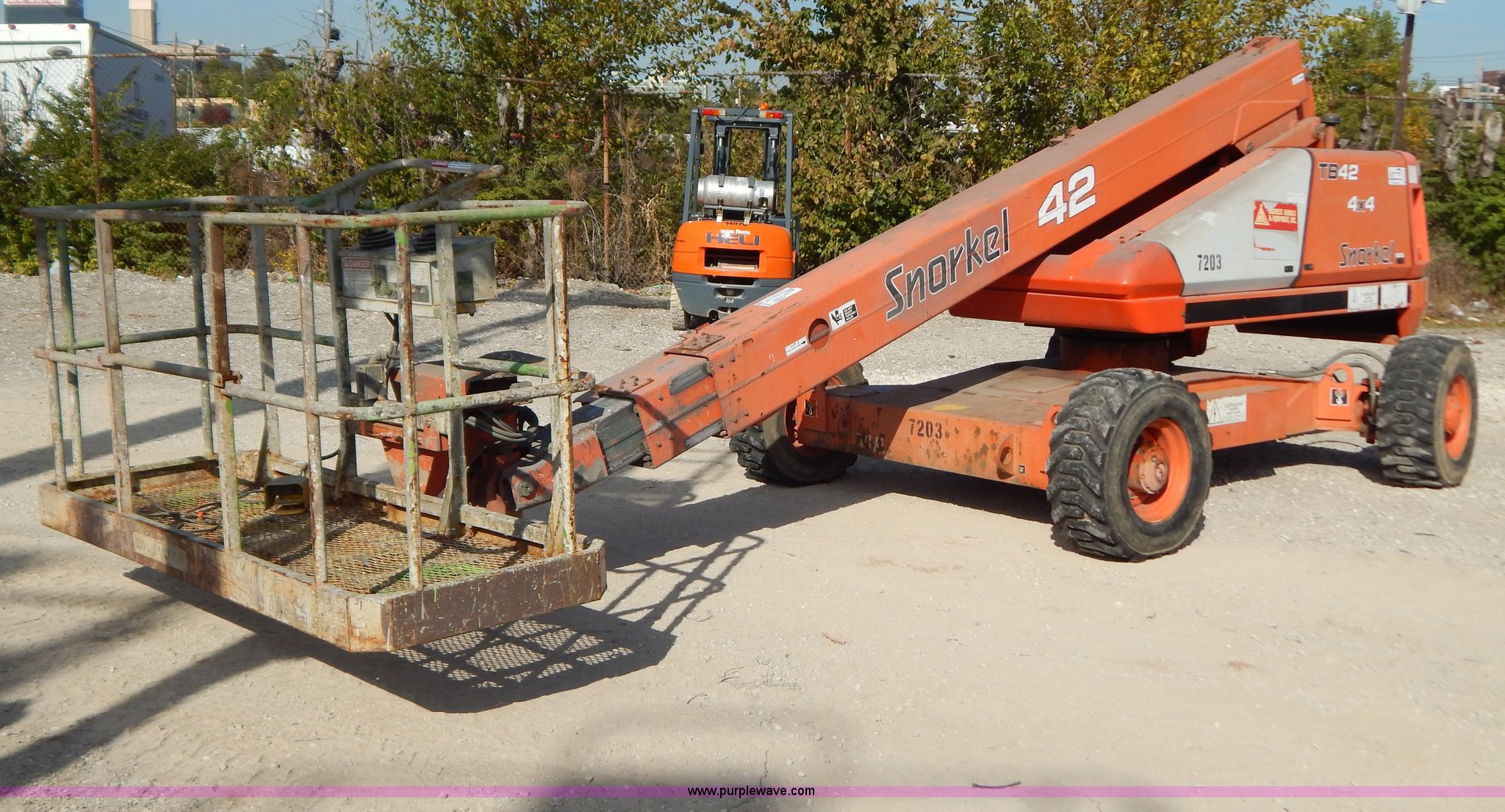 Purple Wave is selling a used Boom Lift in Missouri. This item is a 2001 Snorkel TBA42RF0 boom lift with the following: 4,105 hours on meter, Four cylinder gas engine, Four wheel drive, 33" x 8' x 44"H platform, Power to platform, 500 lbs or two person max capacity, 12x16.5 foam-filled tires, Missing governor, Cosmetic damage, One boom cable broken, Serial 0T01002, Unit# 7203