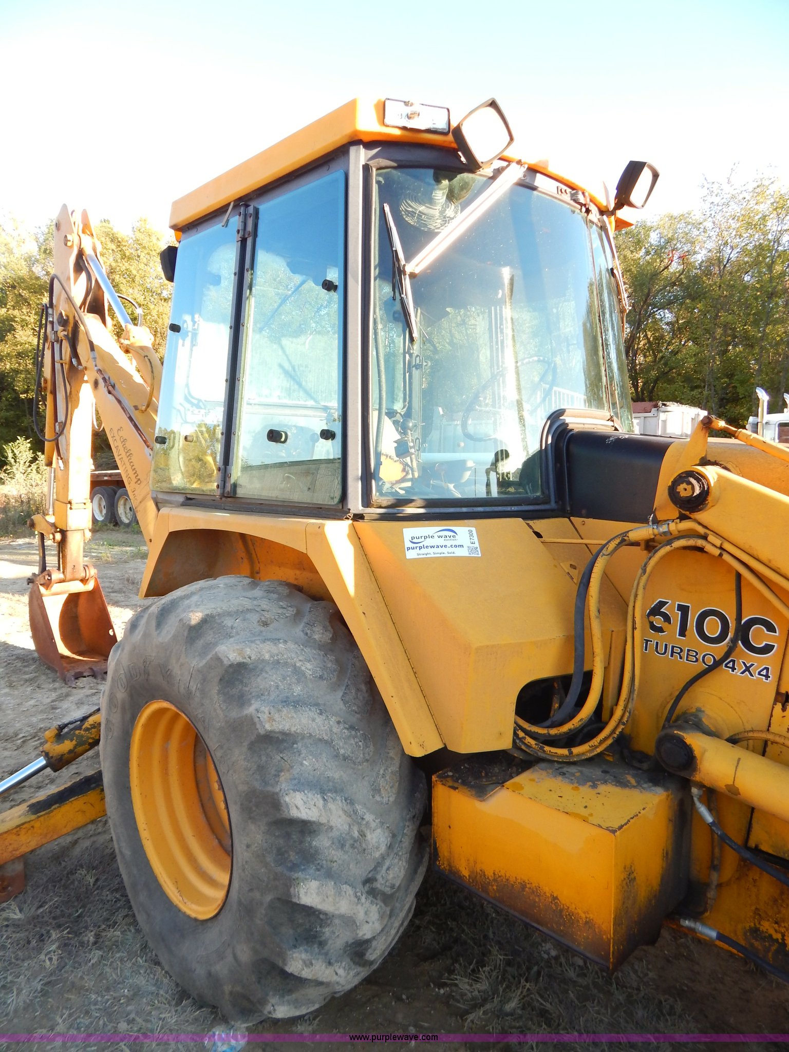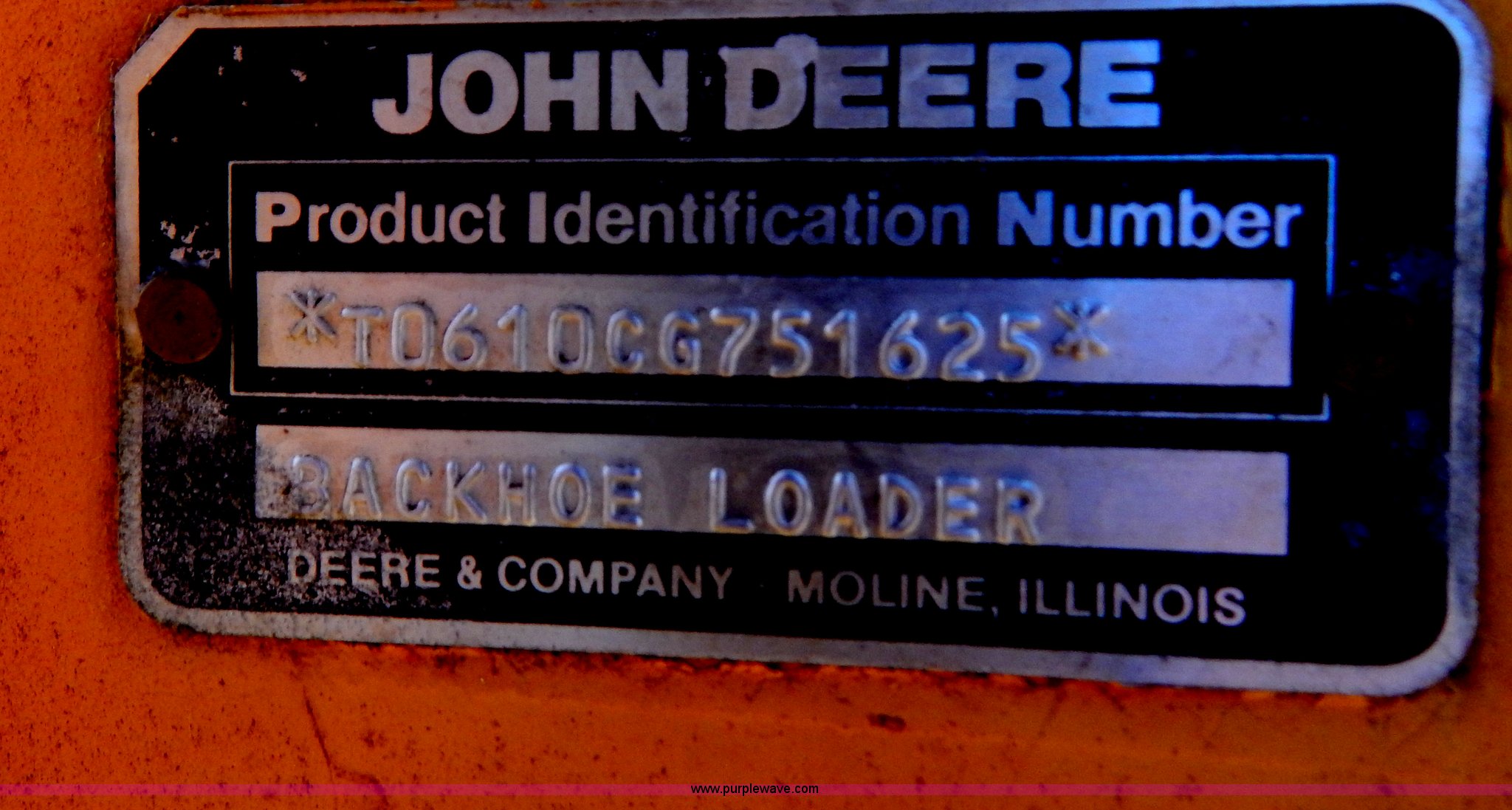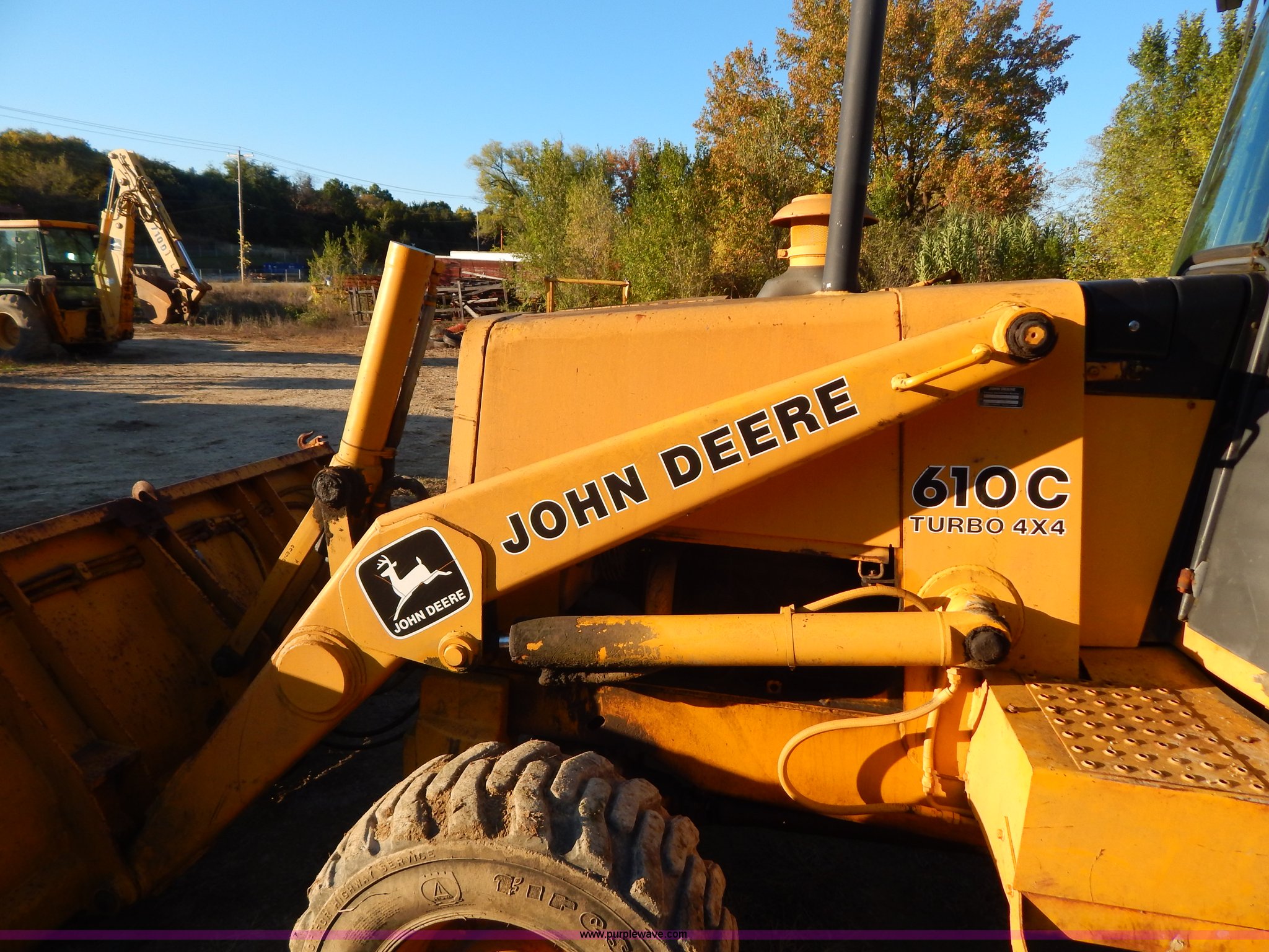 Purple Wave is selling a used Tractor Loader Backhoe in Missouri. This item is a 1988 John Deere 610C backhoe with the following: 8,037 hours on meter, John Deere four cylinder diesel engine, Eight speed shuttle shift transmission, Four wheel drive, Enclosed cab, Heat, Single joystick loader control, Two stick backhoe control, Front and rear work lights, 92"W clam shell bucket, Smooth bolt-on cutting edge, Extend-A-Hoe, 91" stick, 18"W three tooth backhoe bucket, Hydraulic outriggers, Rear auxiliary hydraulics, 305/70R16 front tires, 21-24 rear tires, 16,300 lbs. base operating weight, Serial T0610CE751625