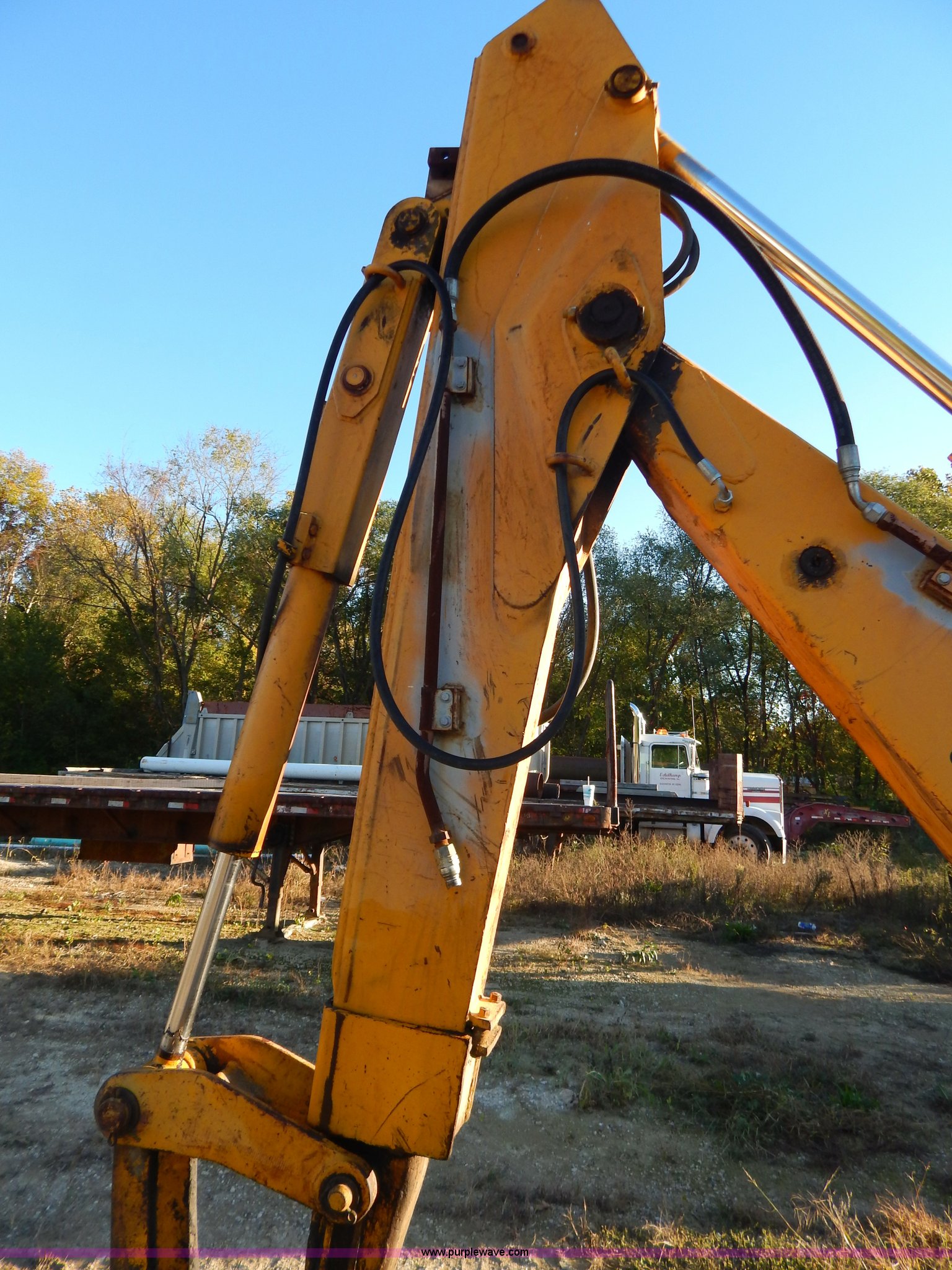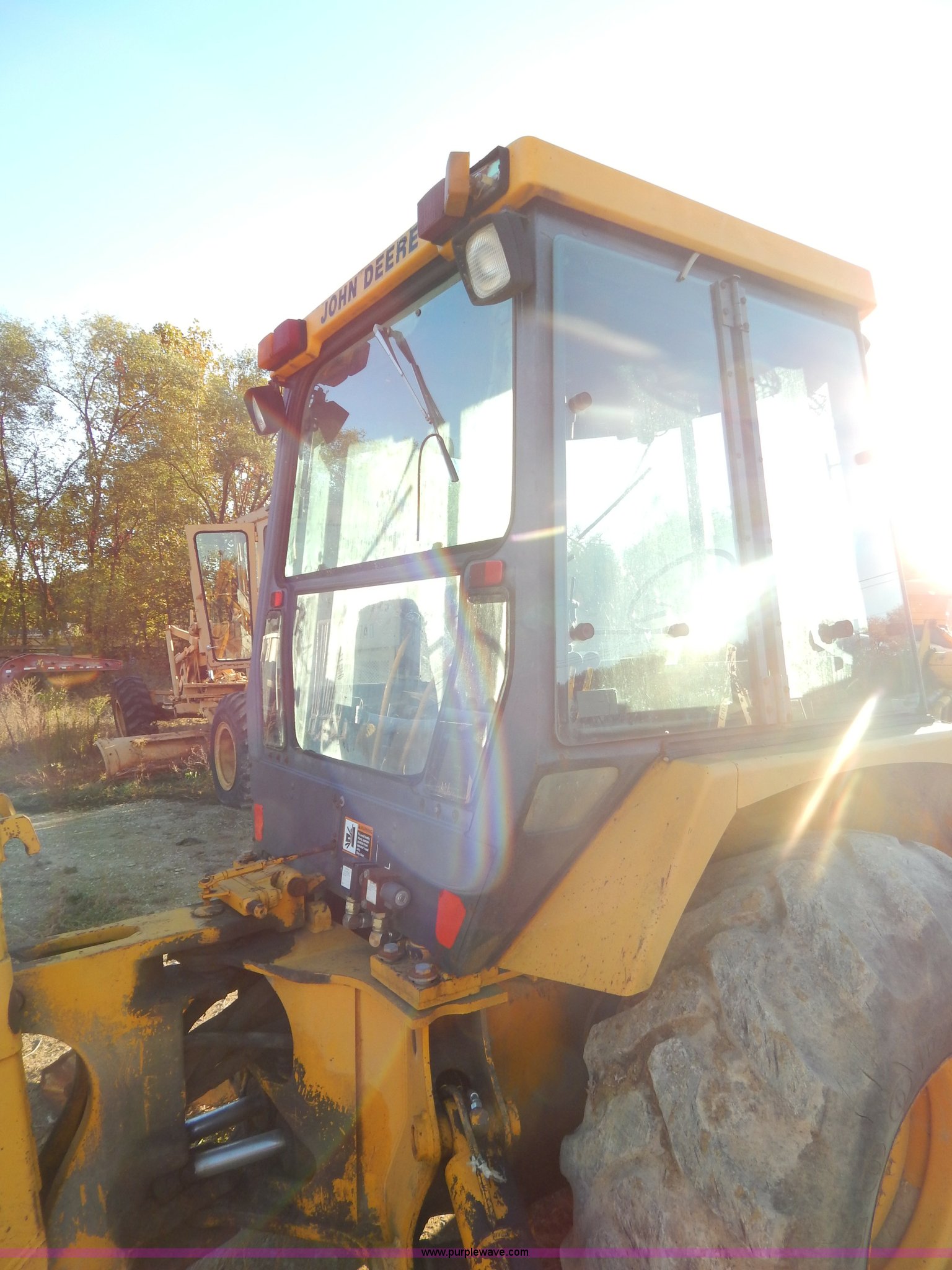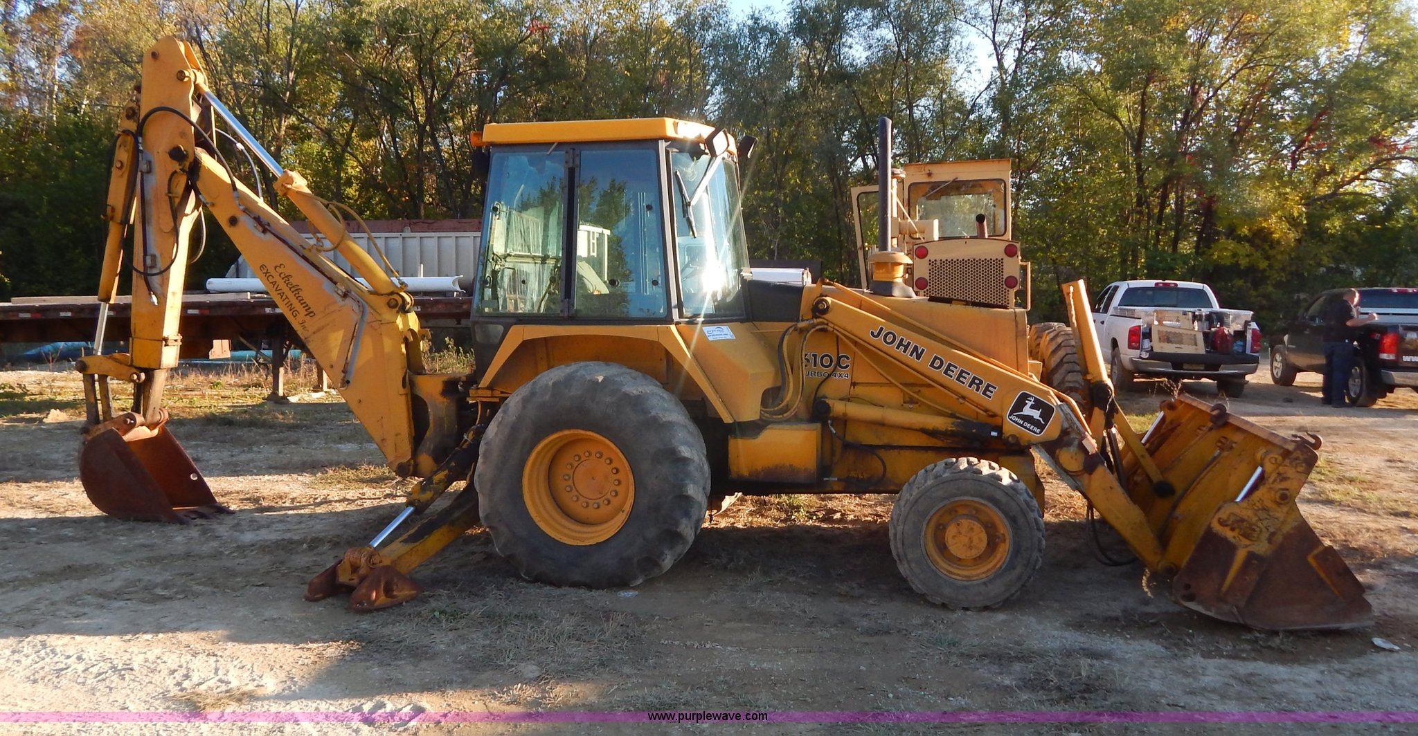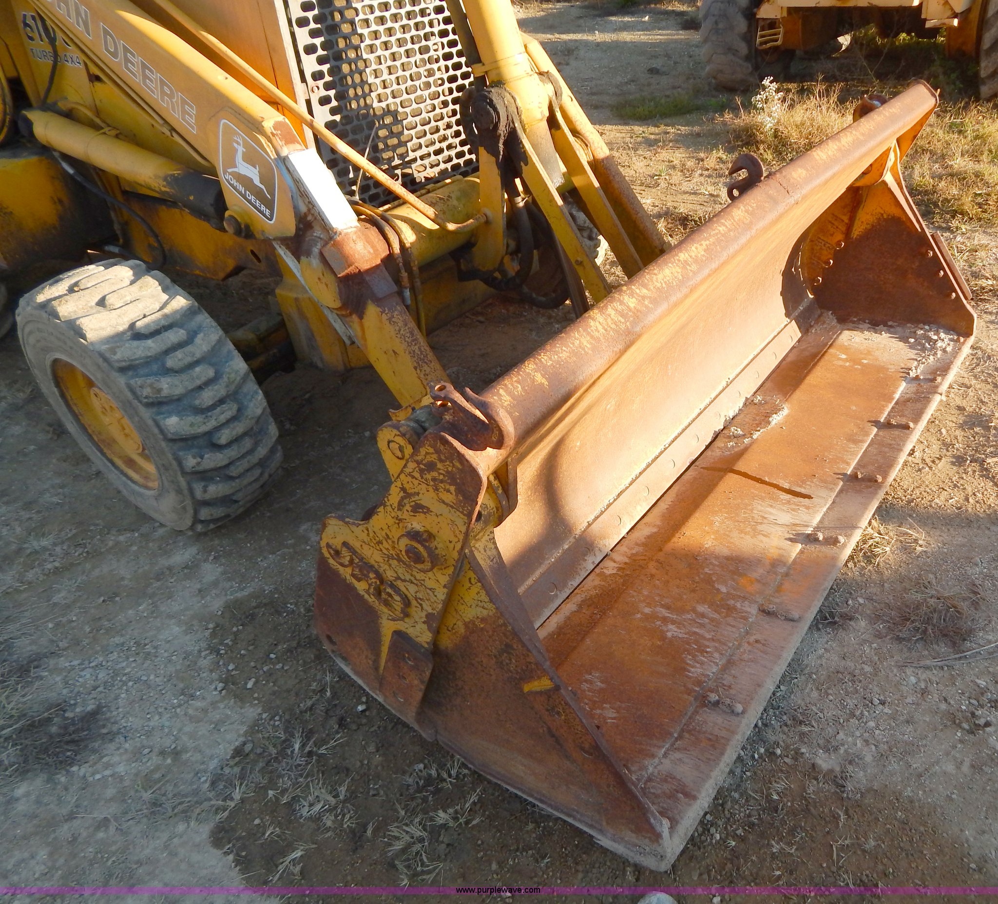 Purple Wave is selling a used Tractor Loader Backhoe in Missouri. This item is a 1988 John Deere 610C backhoe with the following: 8,037 hours on meter, John Deere four cylinder diesel engine, Eight speed shuttle shift transmission, Four wheel drive, Enclosed cab, Heat, Single joystick loader control, Two stick backhoe control, Front and rear work lights, 92"W clam shell bucket, Smooth bolt-on cutting edge, Extend-A-Hoe, 91" stick, 18"W three tooth backhoe bucket, Hydraulic outriggers, Rear auxiliary hydraulics, 305/70R16 front tires, 21-24 rear tires, 16,300 lbs. base operating weight, Serial T0610CE751625