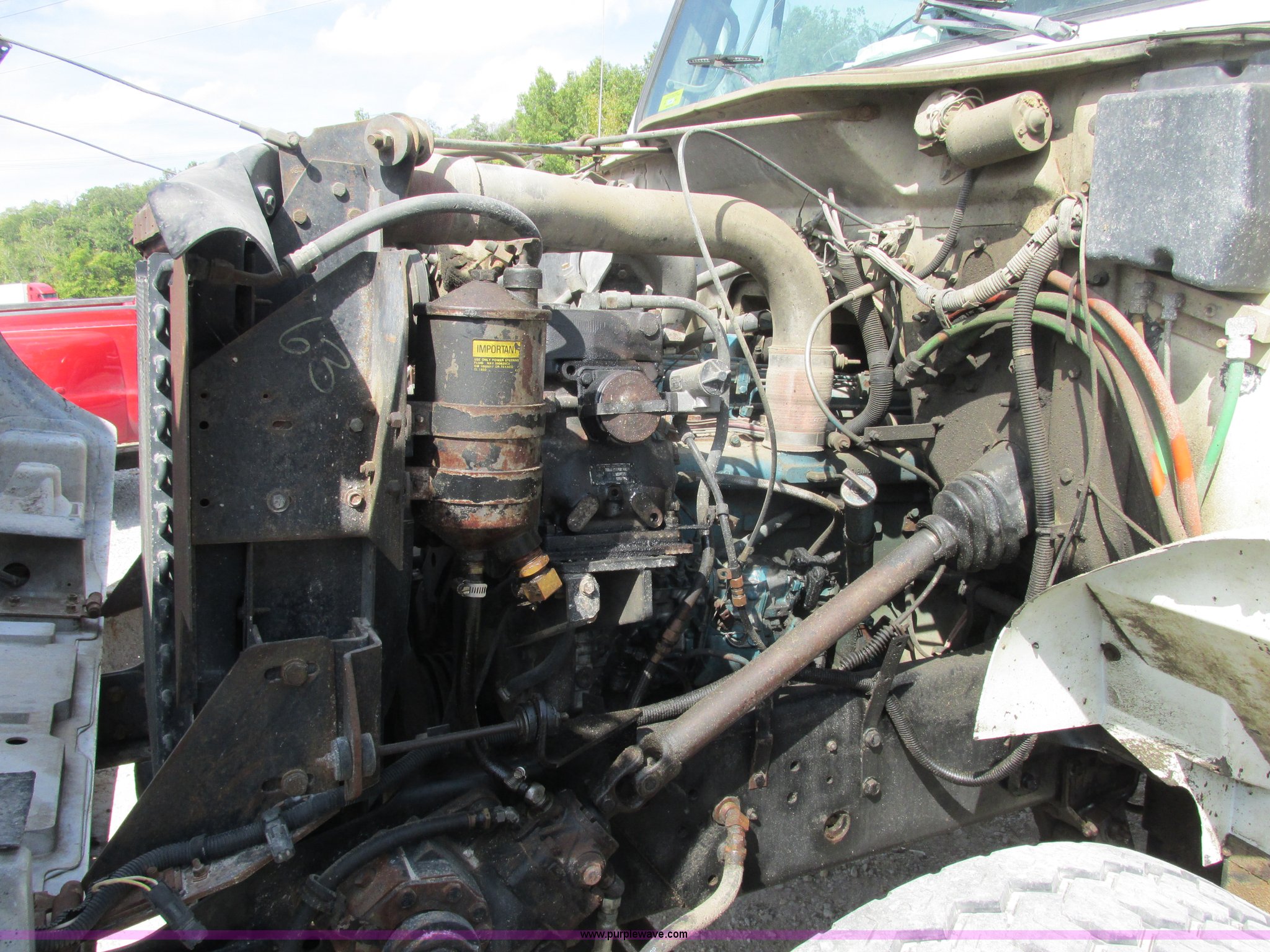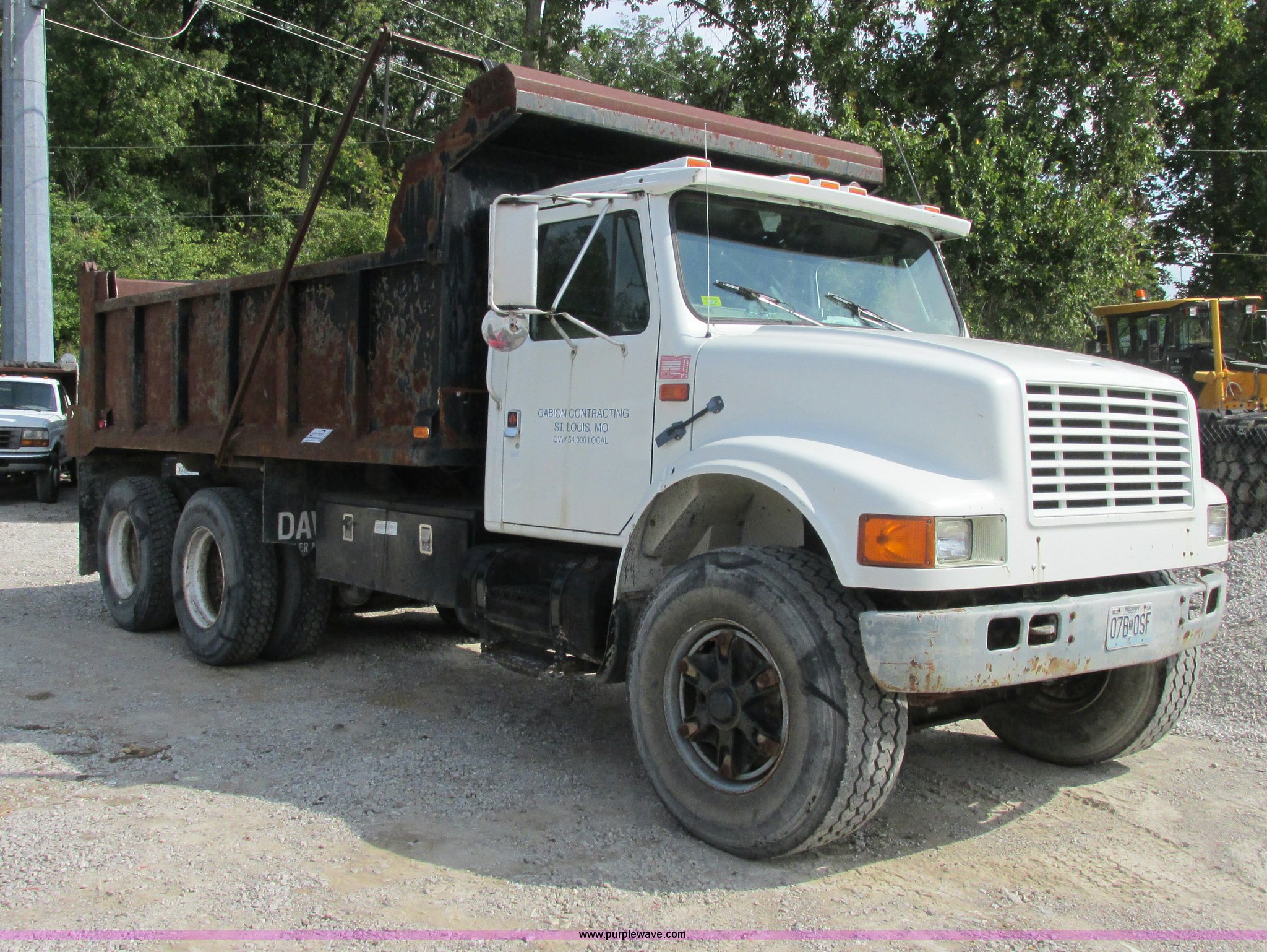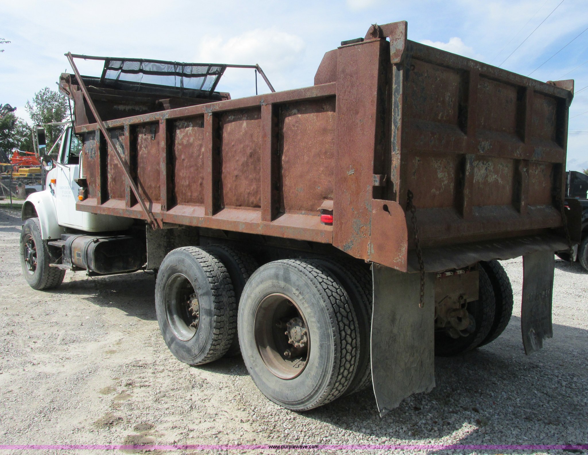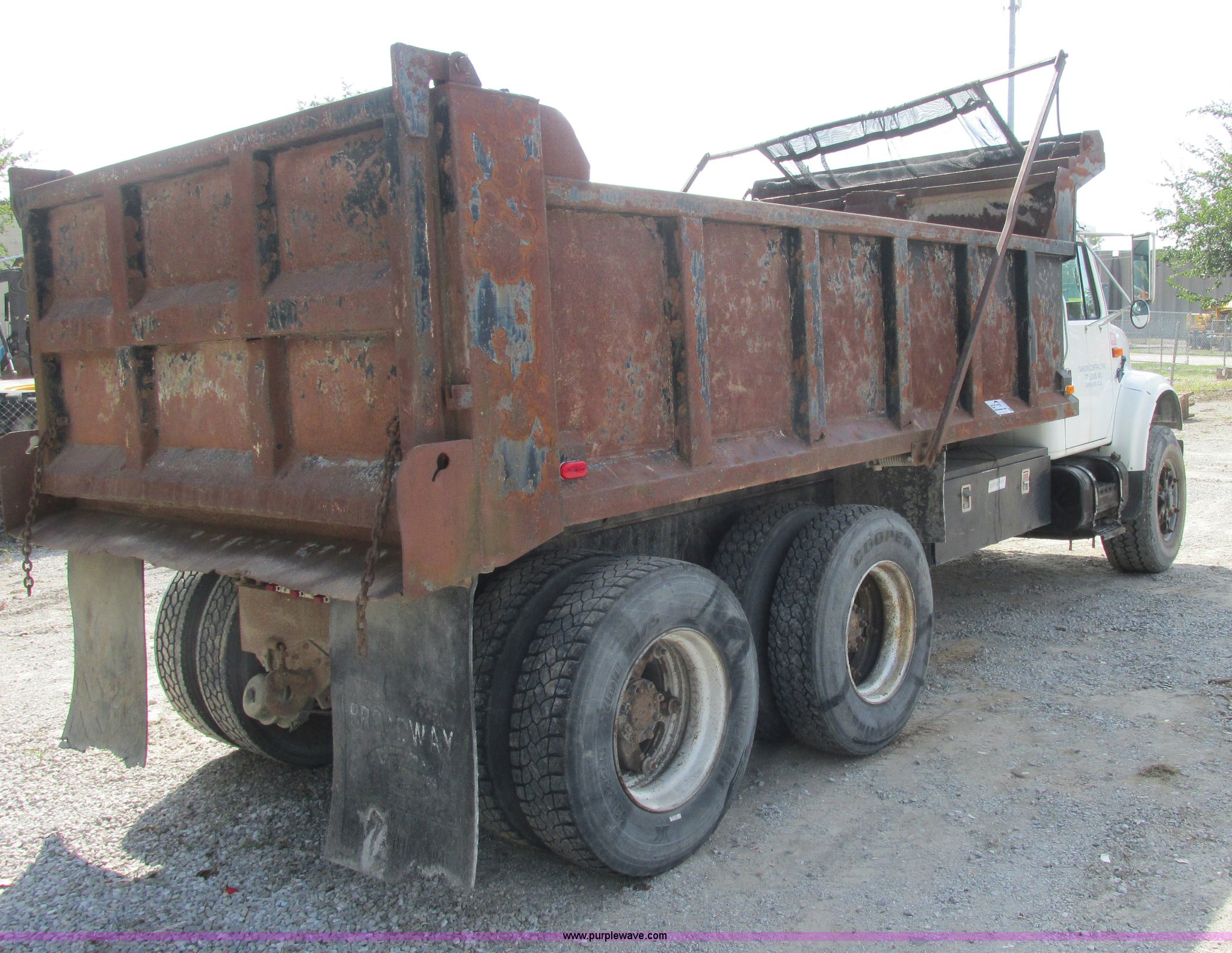 Purple Wave is selling a used Construction Dump Truck in Missouri. This item is a 1990 International 4900 dump truck with the following: 293,620 miles on odometer, International DT466 7.6L L6 diesel engine, 13 speed manual transmission, Heat, Exterior visor, Block heater, Pintle hitch, Air end gate, Manual rollover tarp, Three stage single ram, WeatherGuard 48" under body toolbox, Does not latch correctly, Dual 45 gallon fuel tanks, PTO, Spring over walking beam suspension, Air brakes, Double framed, 192" wheelbase, 385/65R22.5 front tires, 11R22.5 rear tires, GVWR 54,000 lbs, Cosmetic damage, Bed rust, Bed needs repainted